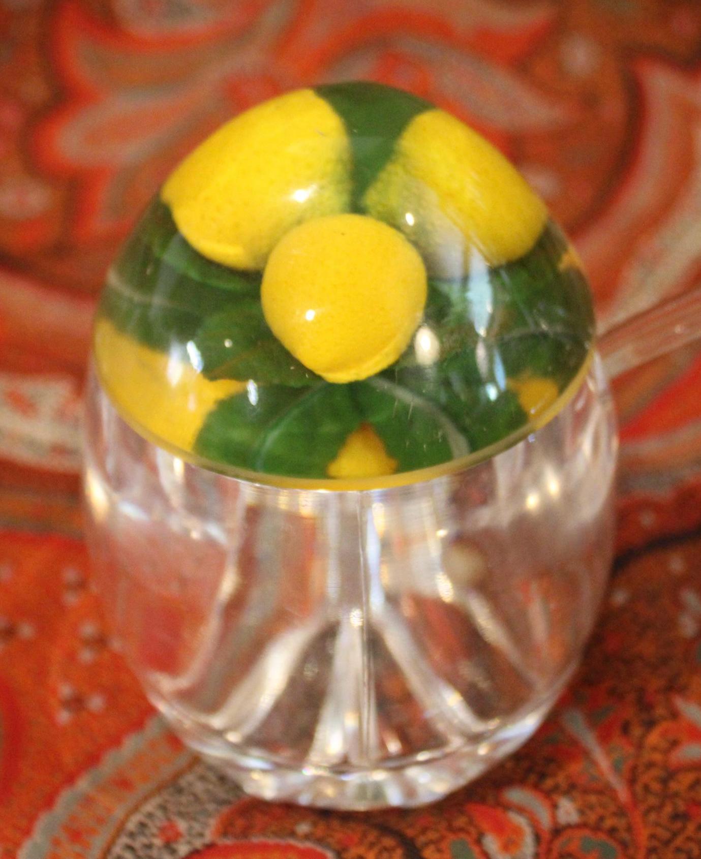 These Two Midcentury Lucite Raspberry and Lemon Jam Jars with Spoons are available to you! They would be perfect to use at a brunch or tea party- perfect for everyday use in your home! Each is