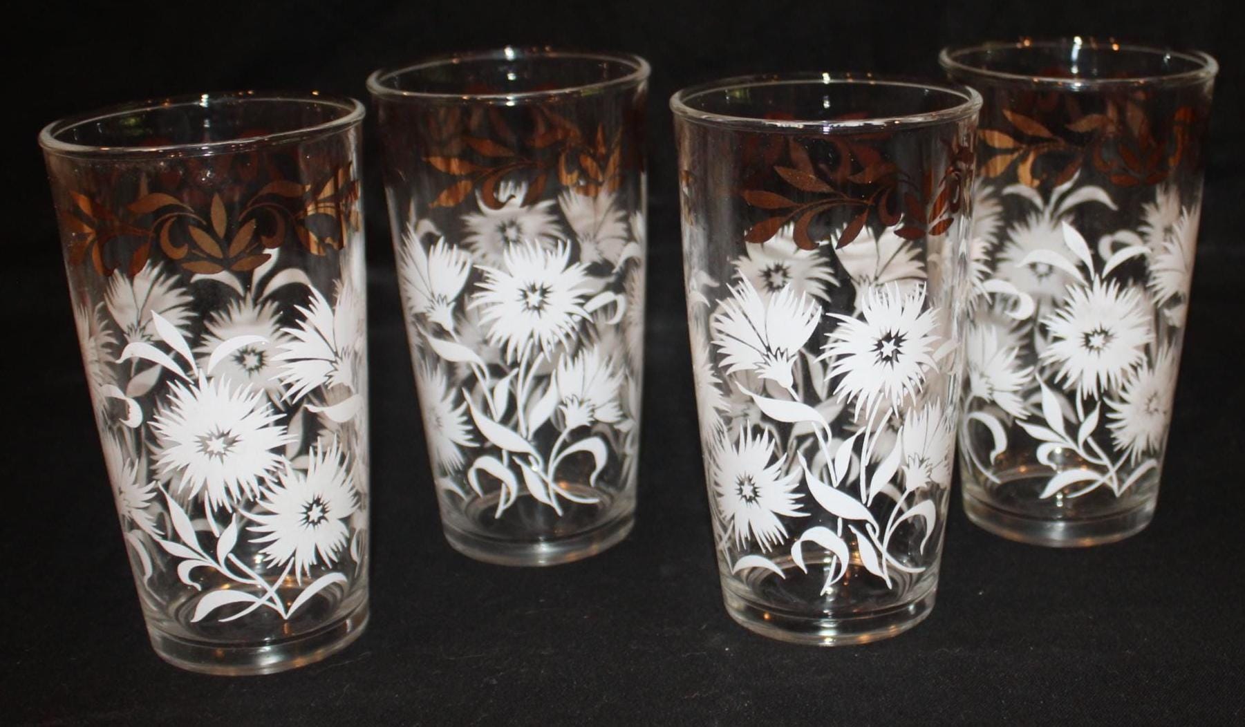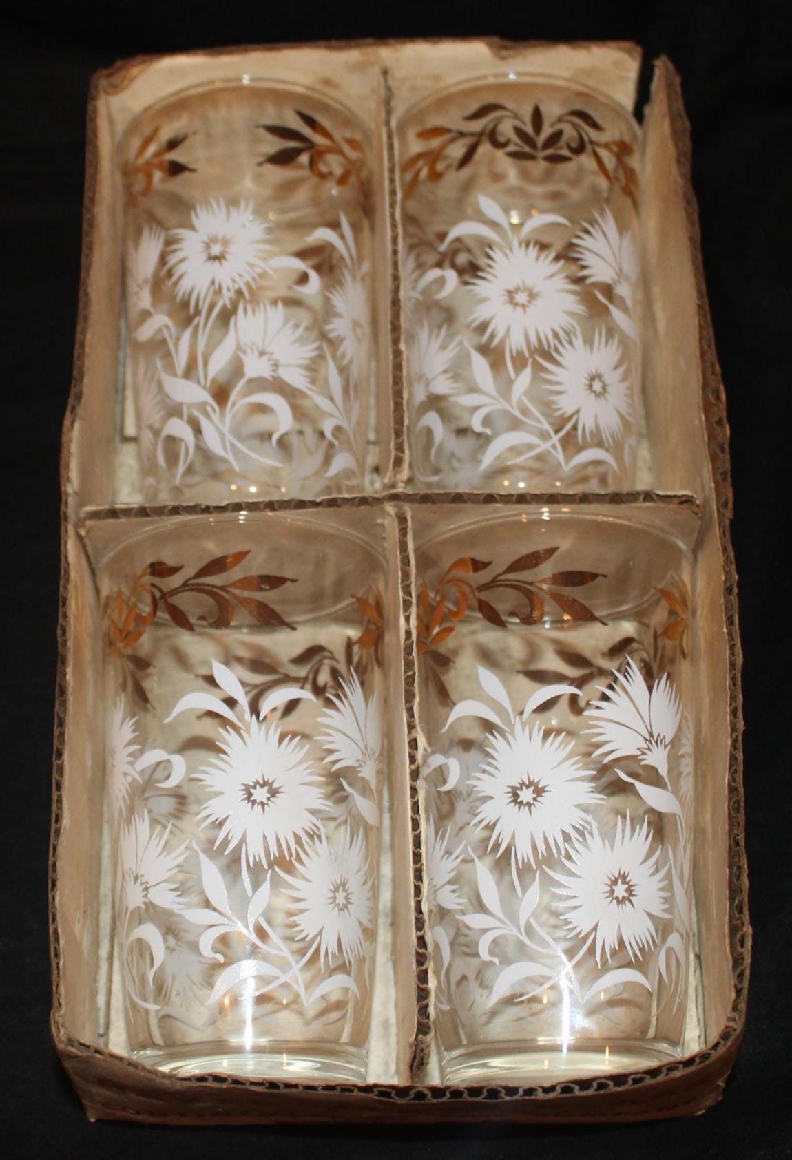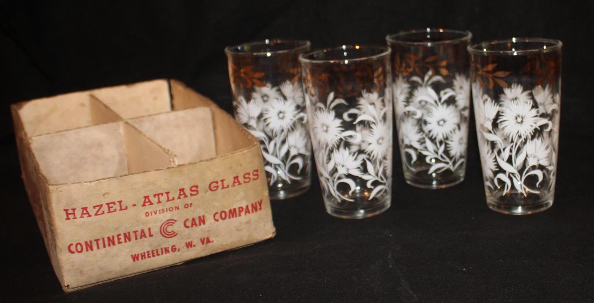 This Set of Four Mid century Hazel Atlas White Aster Drinking Glasses is in such great condition- it looks as if they have never been used! Each glass measures 5.25" tall x 2.75" in diameter and holds 8 oz. The white aster decoration is in excellent condition; the glasses have no chips or cracks. The original box is included. Please message us if you have any questions- Thanks for looking!
