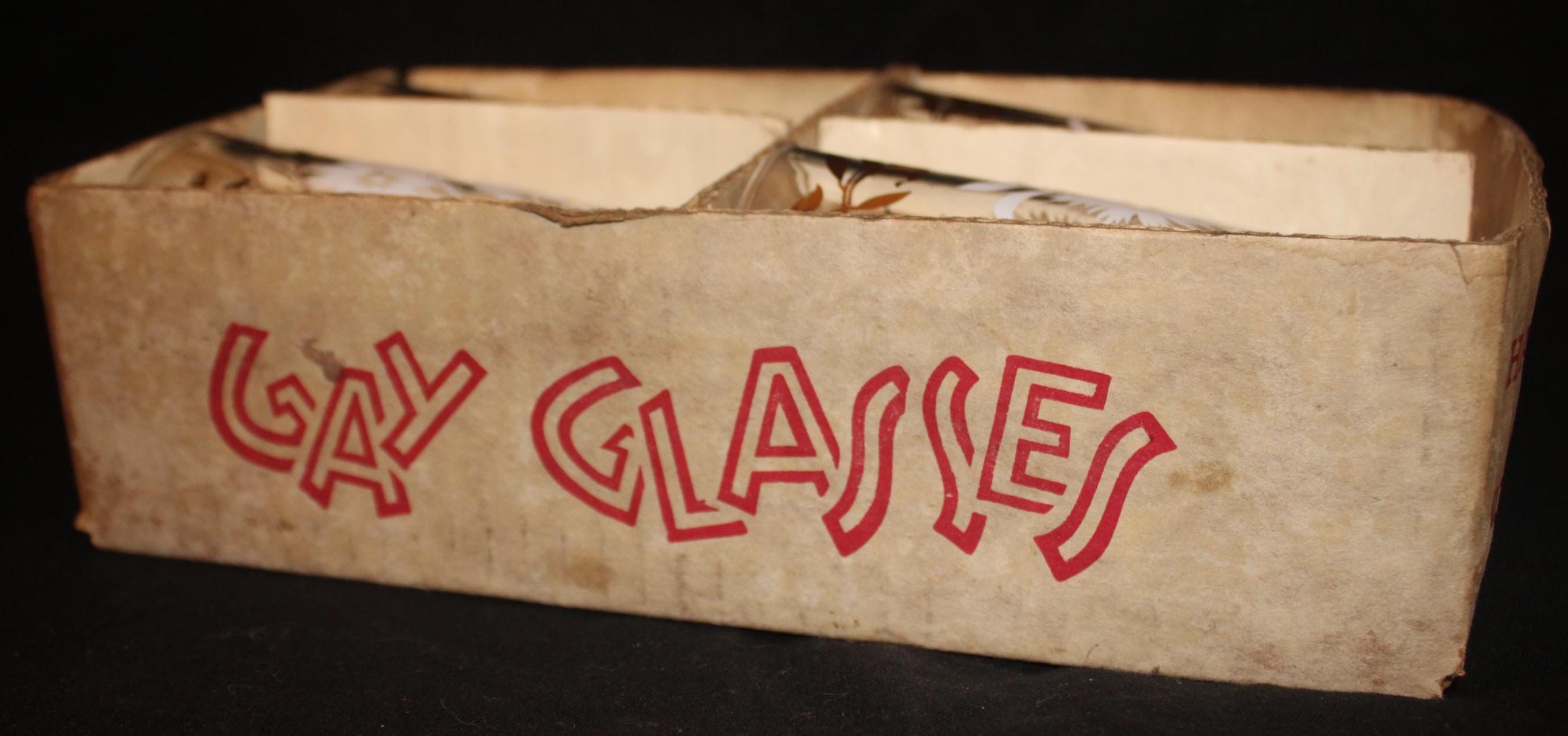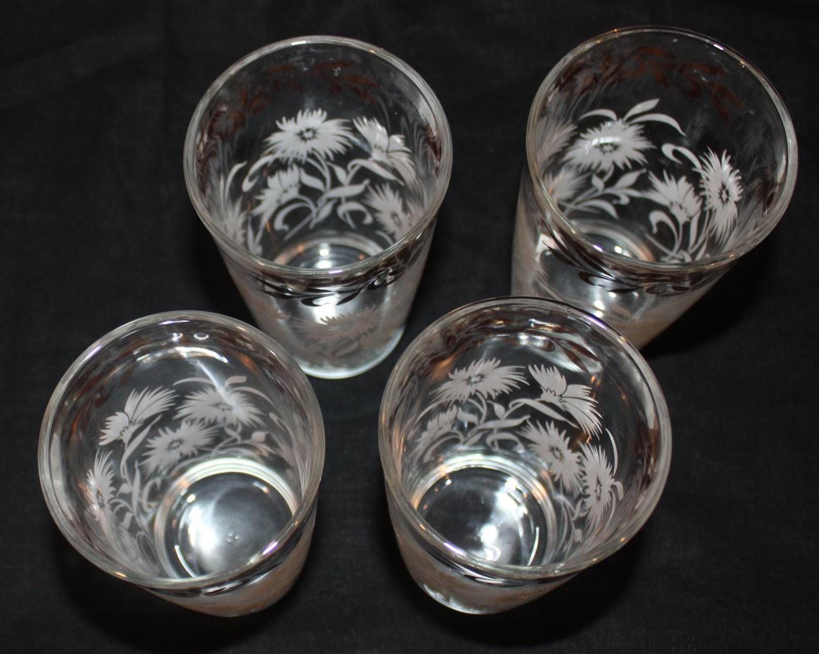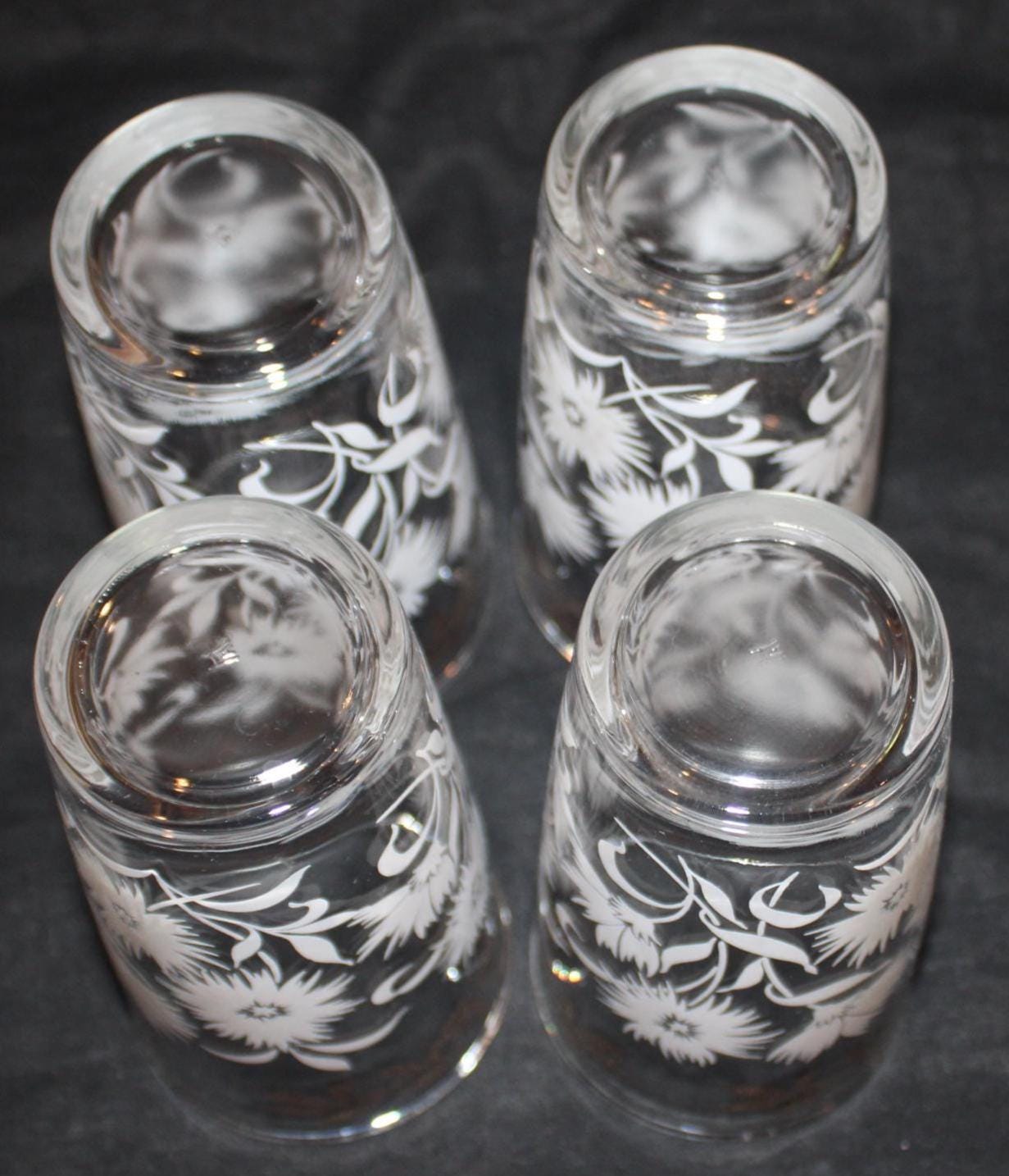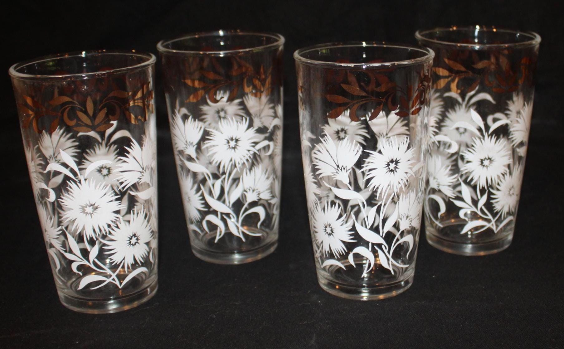 This Set of Four Mid century Hazel Atlas White Aster Drinking Glasses is in such great condition- it looks as if they have never been used! Each glass measures 5.25" tall x 2.75" in diameter and holds 8 oz. The white aster decoration is in excellent condition; the glasses have no chips or cracks. The original box is included. Please message us if you have any questions- Thanks for looking!