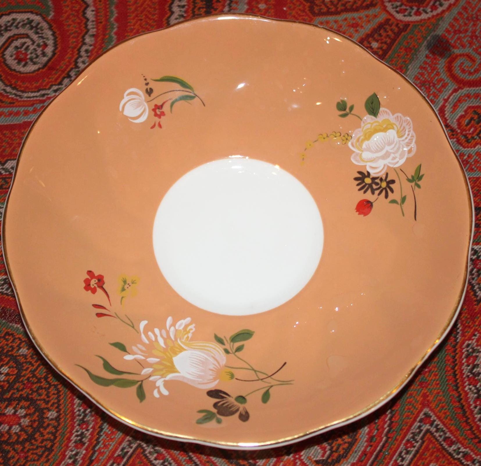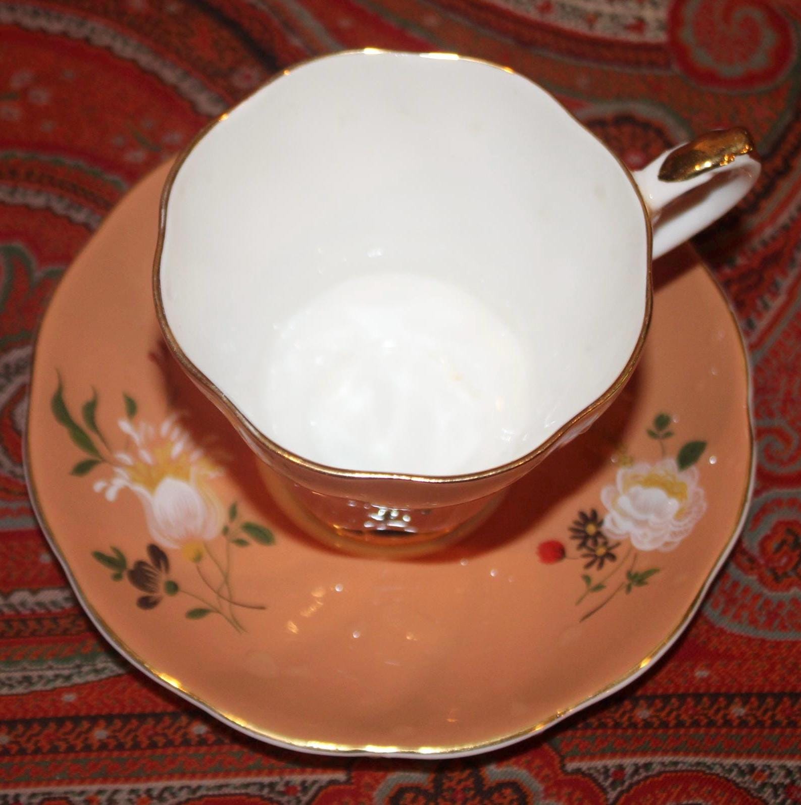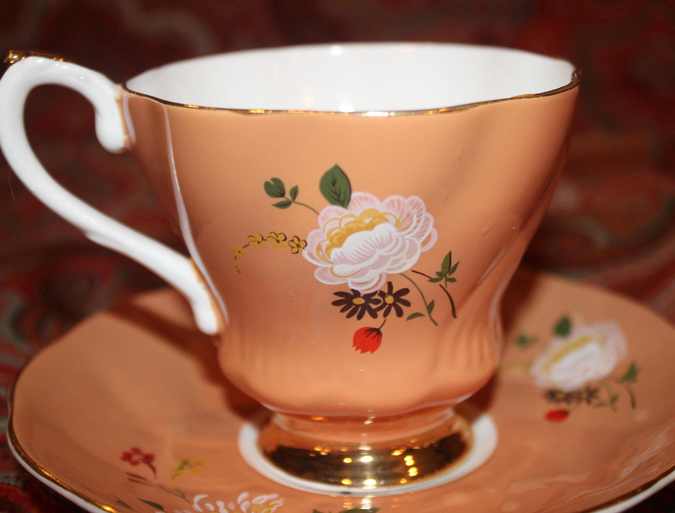 This Gorgeous Vintage Royal Grafton Orange Peach Floral Tea Cup & Saucer is available for your consideration! The saucer is 5.5" in diameter; the cup is 3" tall- there is no chipping, cracking, or discoloration. A truly beautiful teacup that will be a wonderful addition to your collection! Please message us if you have any questions- Thanks for looking!
