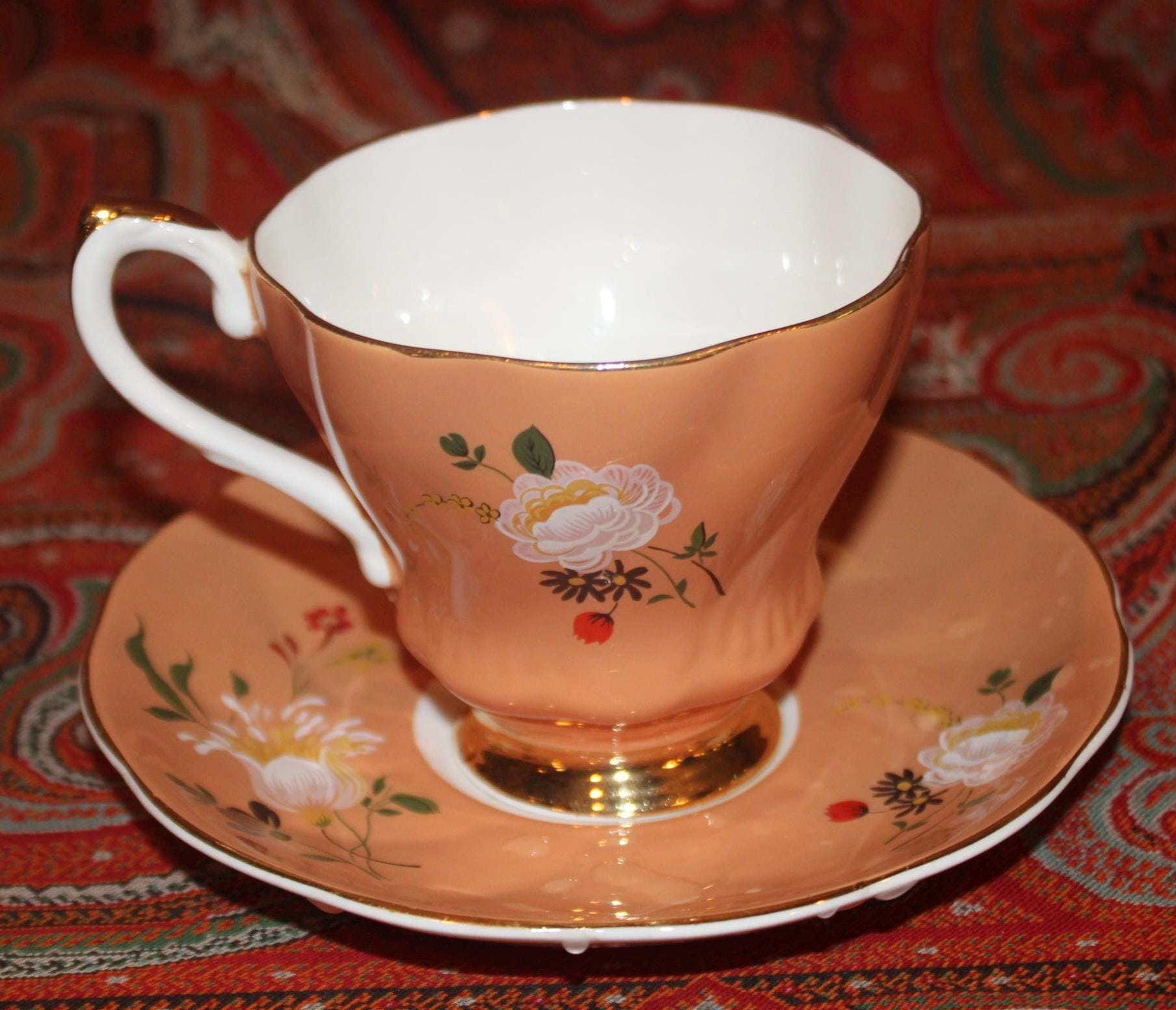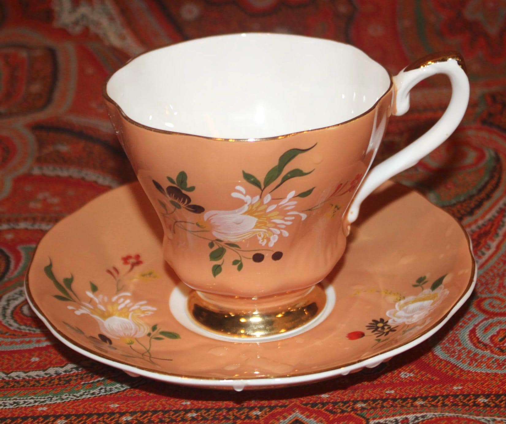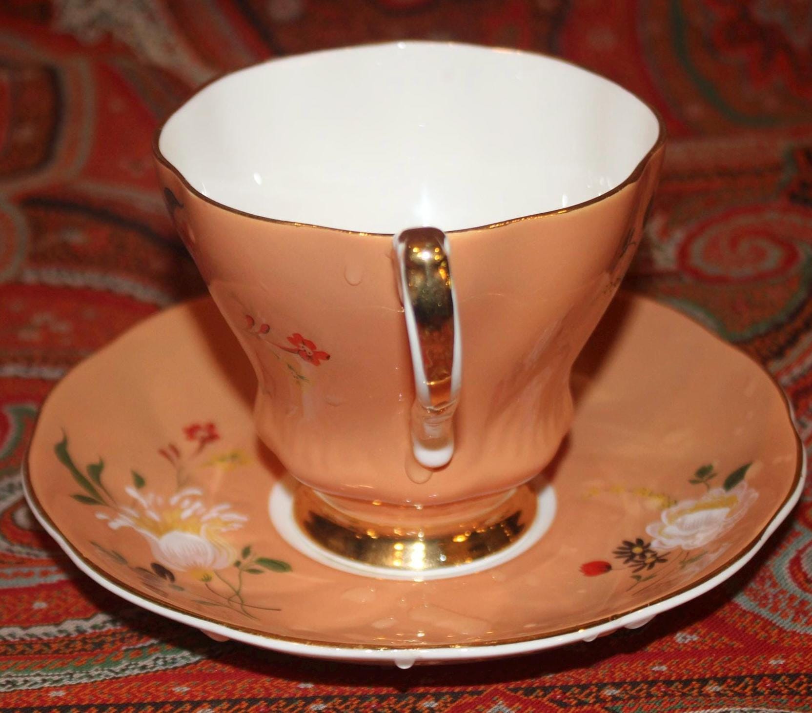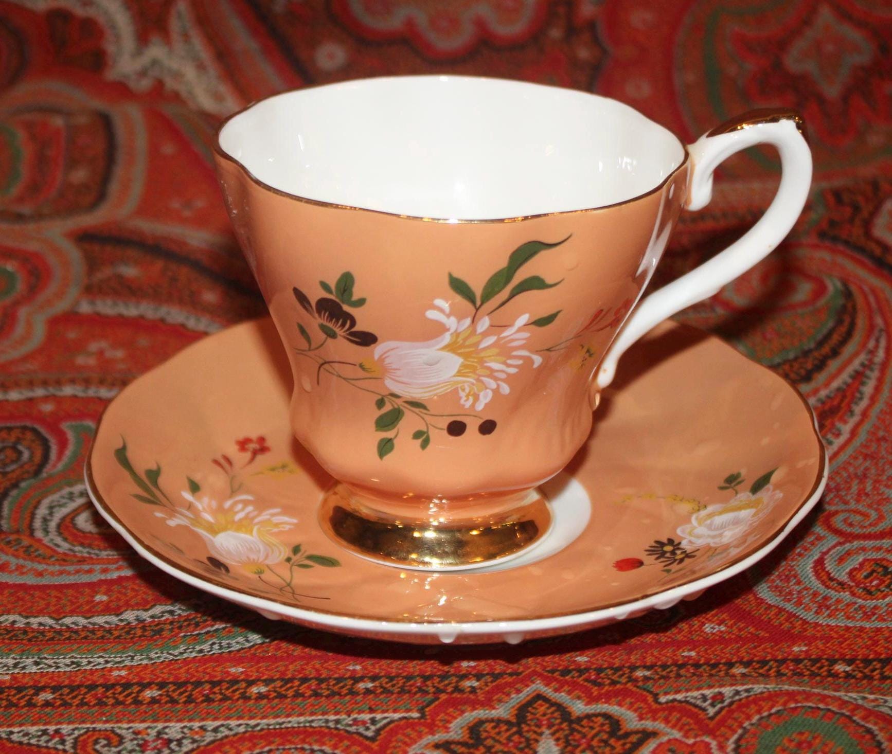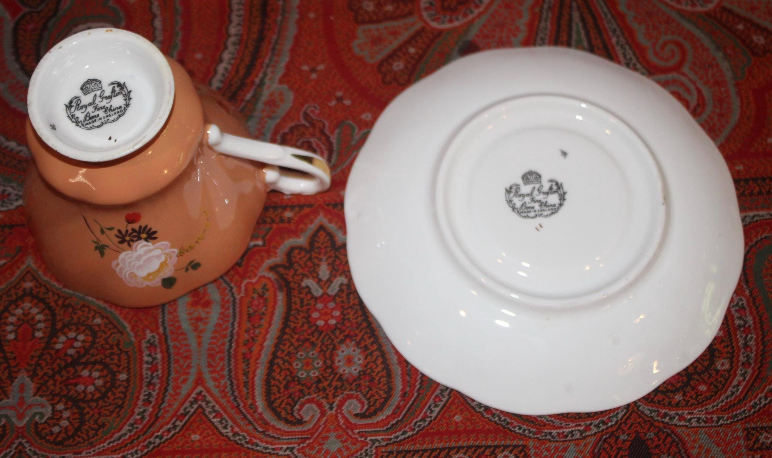 Gorgeous Vintage Royal Grafton Orange Peach Floral Tea Cup & Saucer-England/Fine Bone China/Tea Party