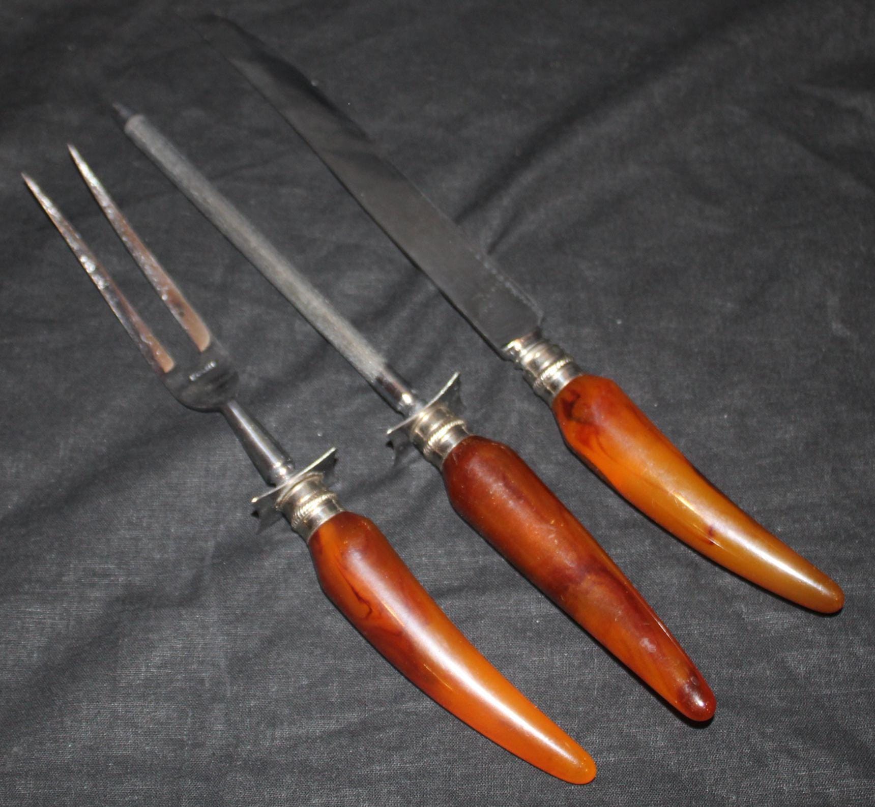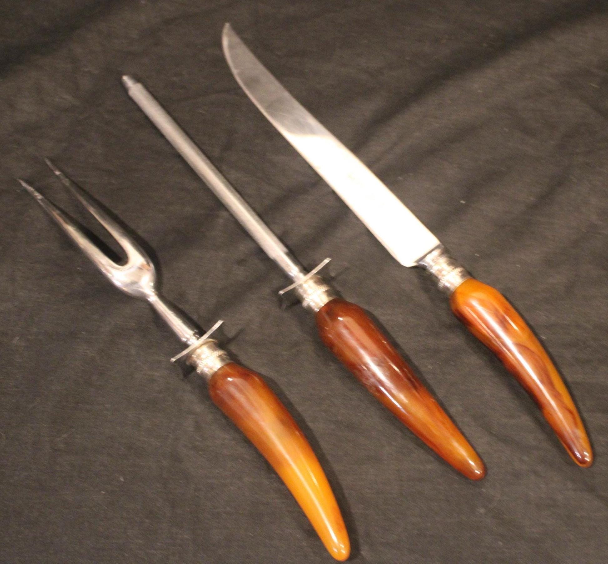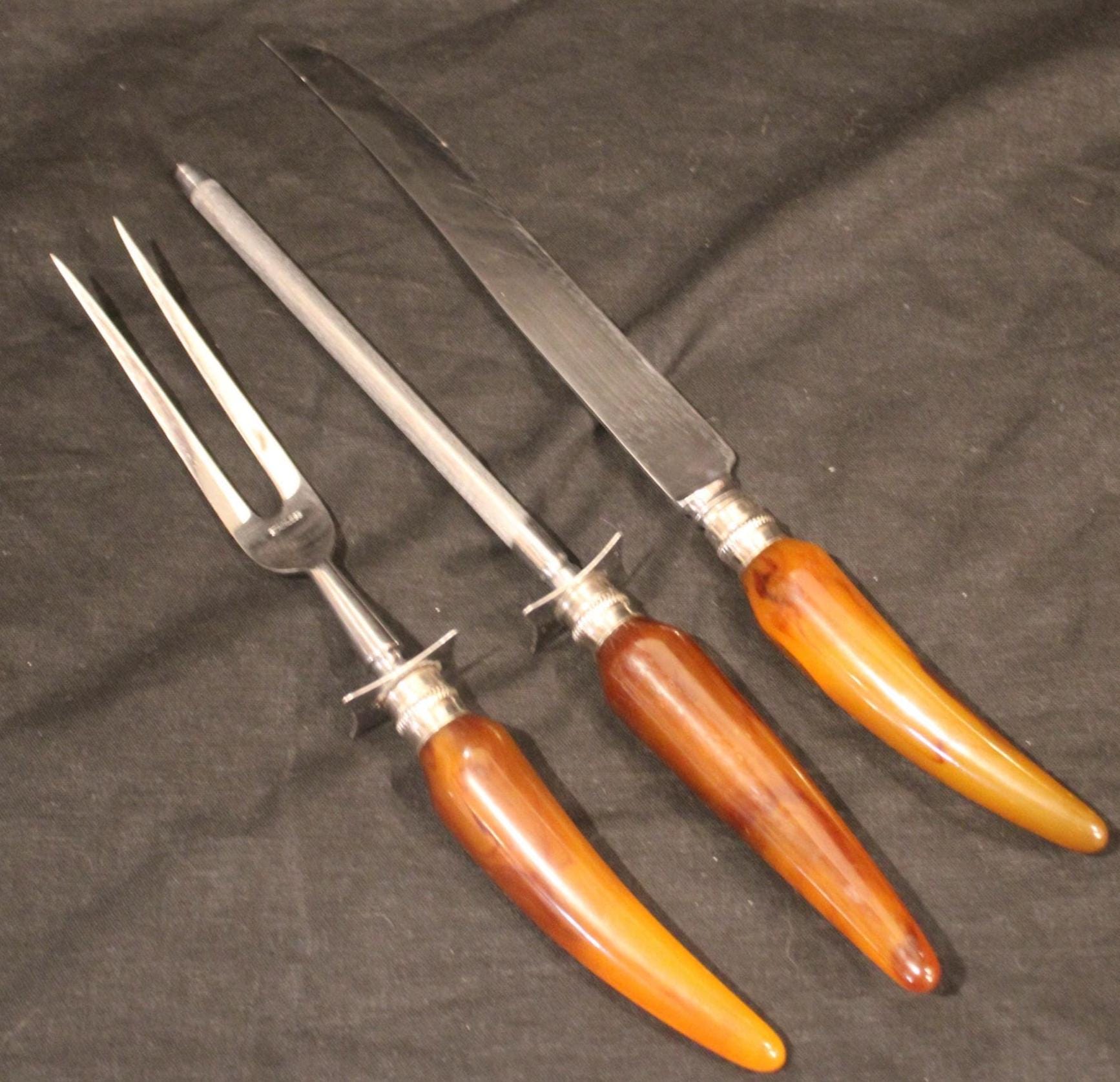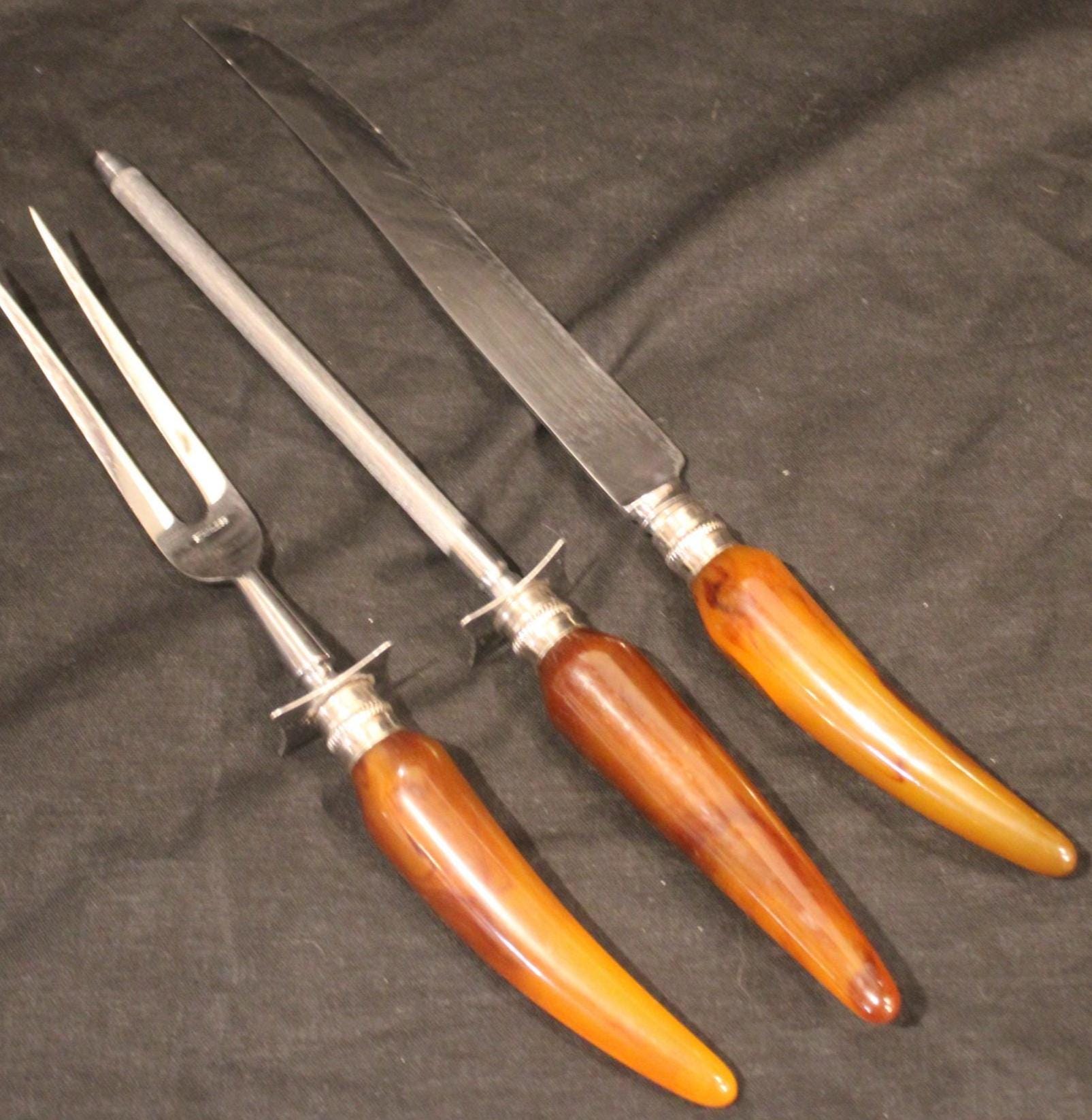 This Englishtown Sheffield 3 Piece Stainless Steel Carving Set with Butterscotch Bakelite Handles would be a great asset to your Thanksgiving table- the "carver" "head of the table" "the (self-declared) best turkey slicer ever" will have no issues...( YES...we all have one). The Knife is 12.5" in length and is in great condition and very sharp; the Bakelite handles have no cracks. Perfect set! Please message us if your "carver" has any concerns- Thanks for looking!