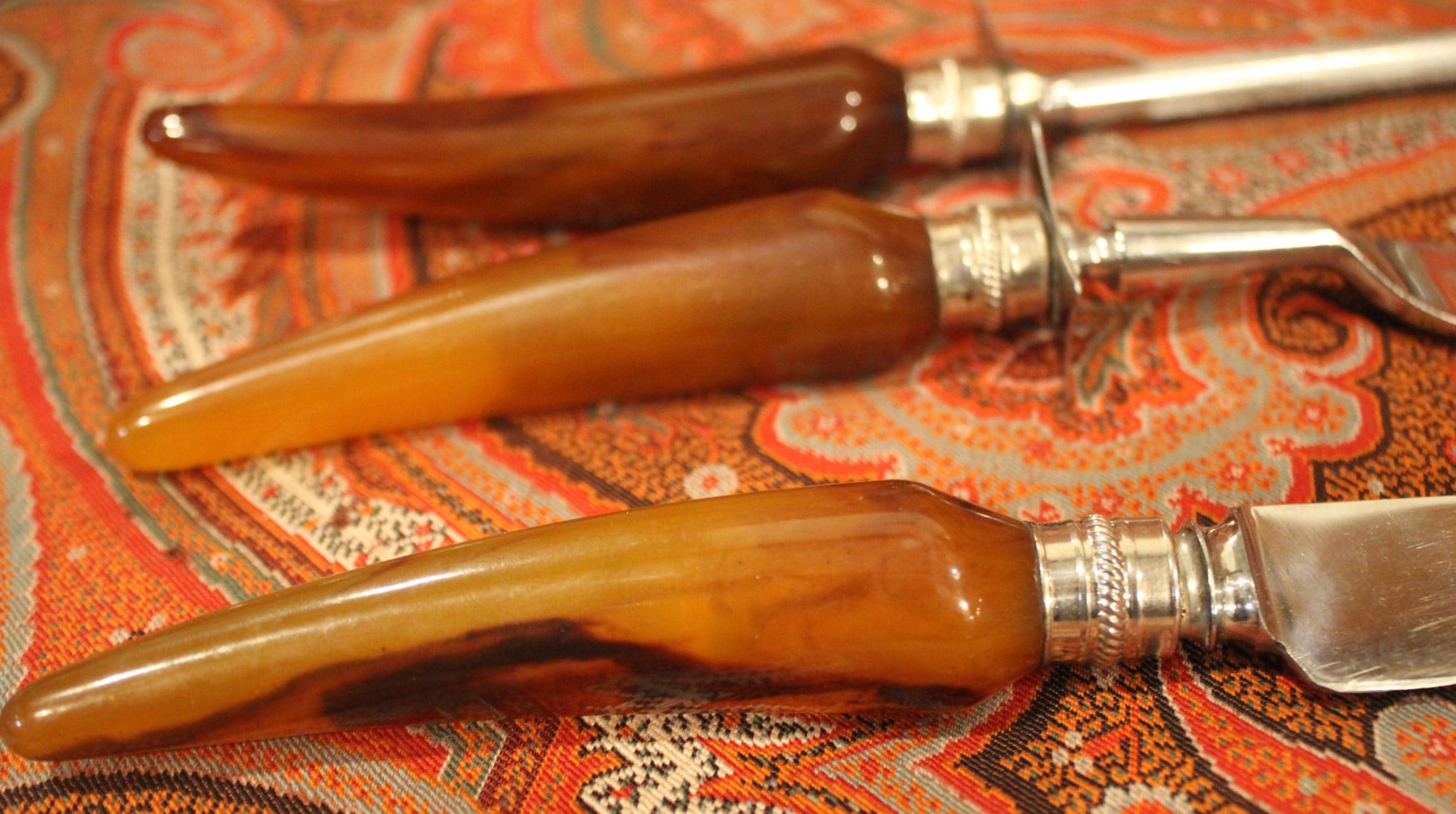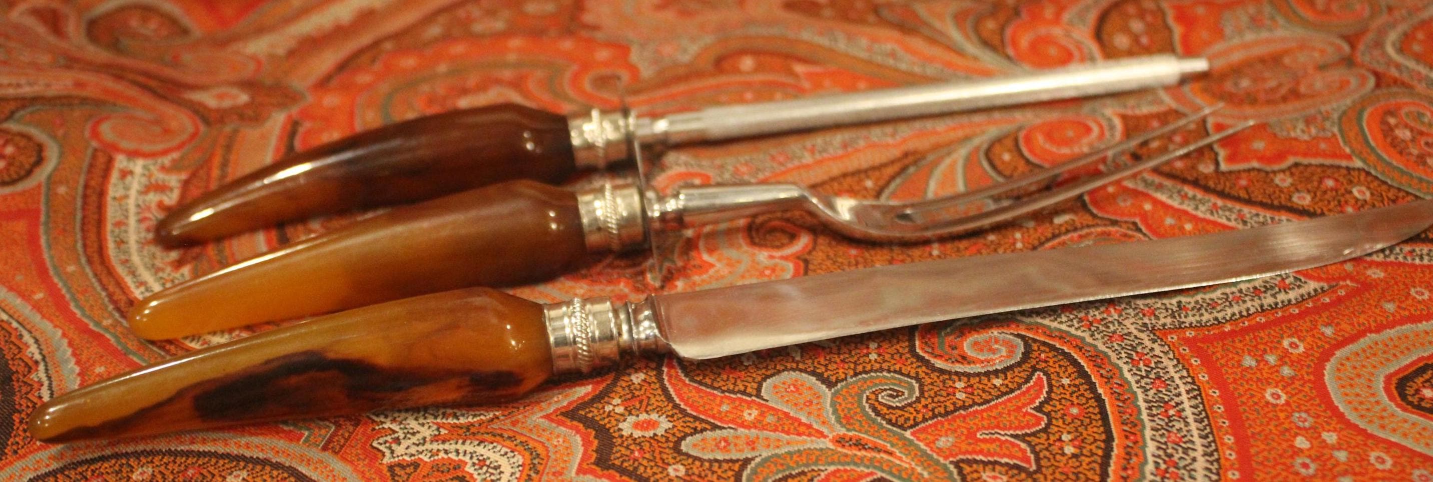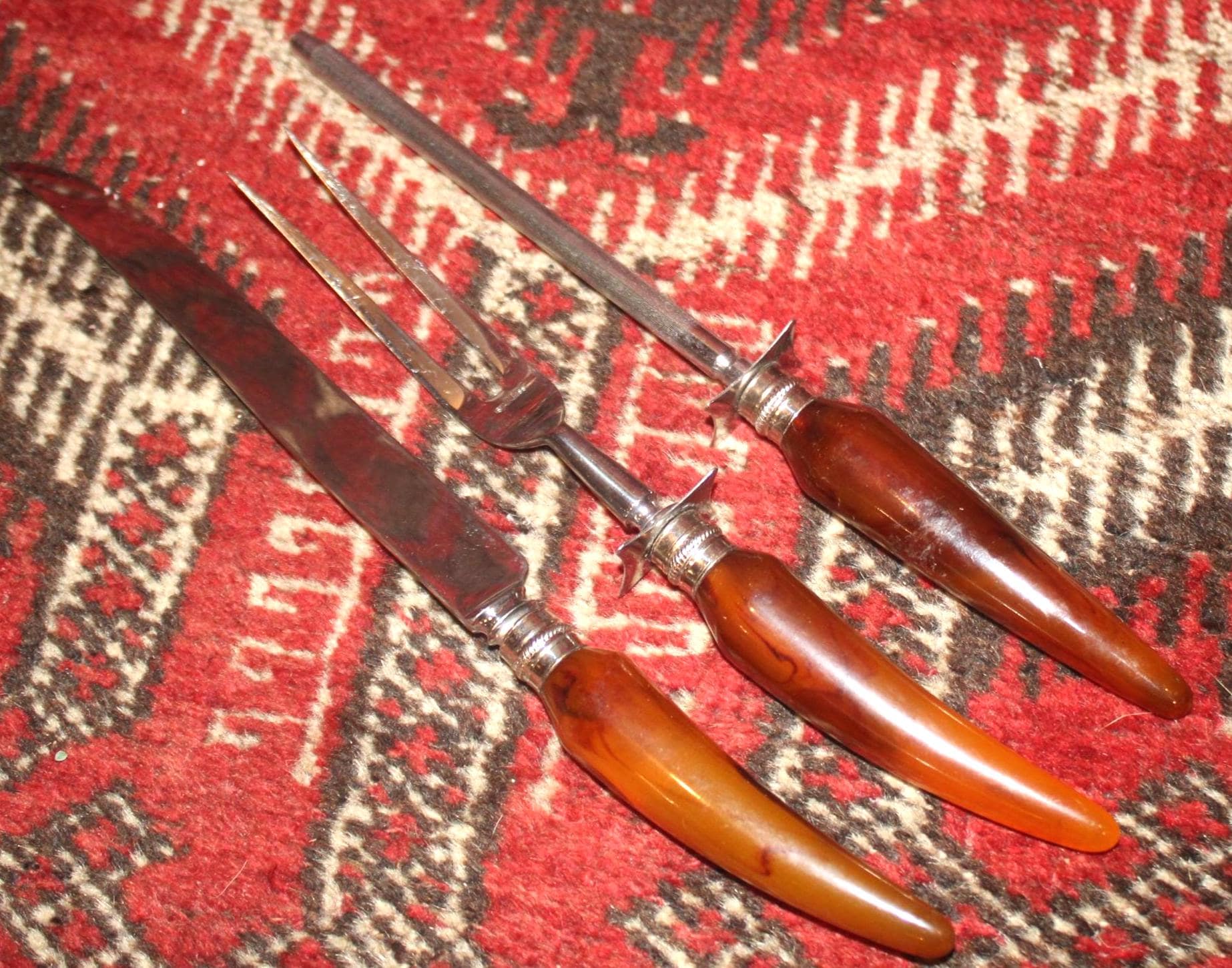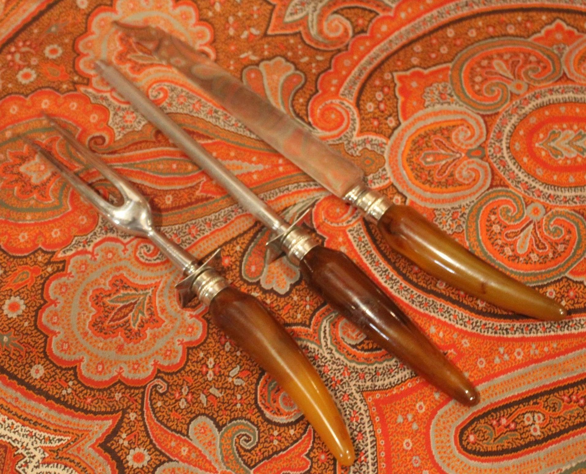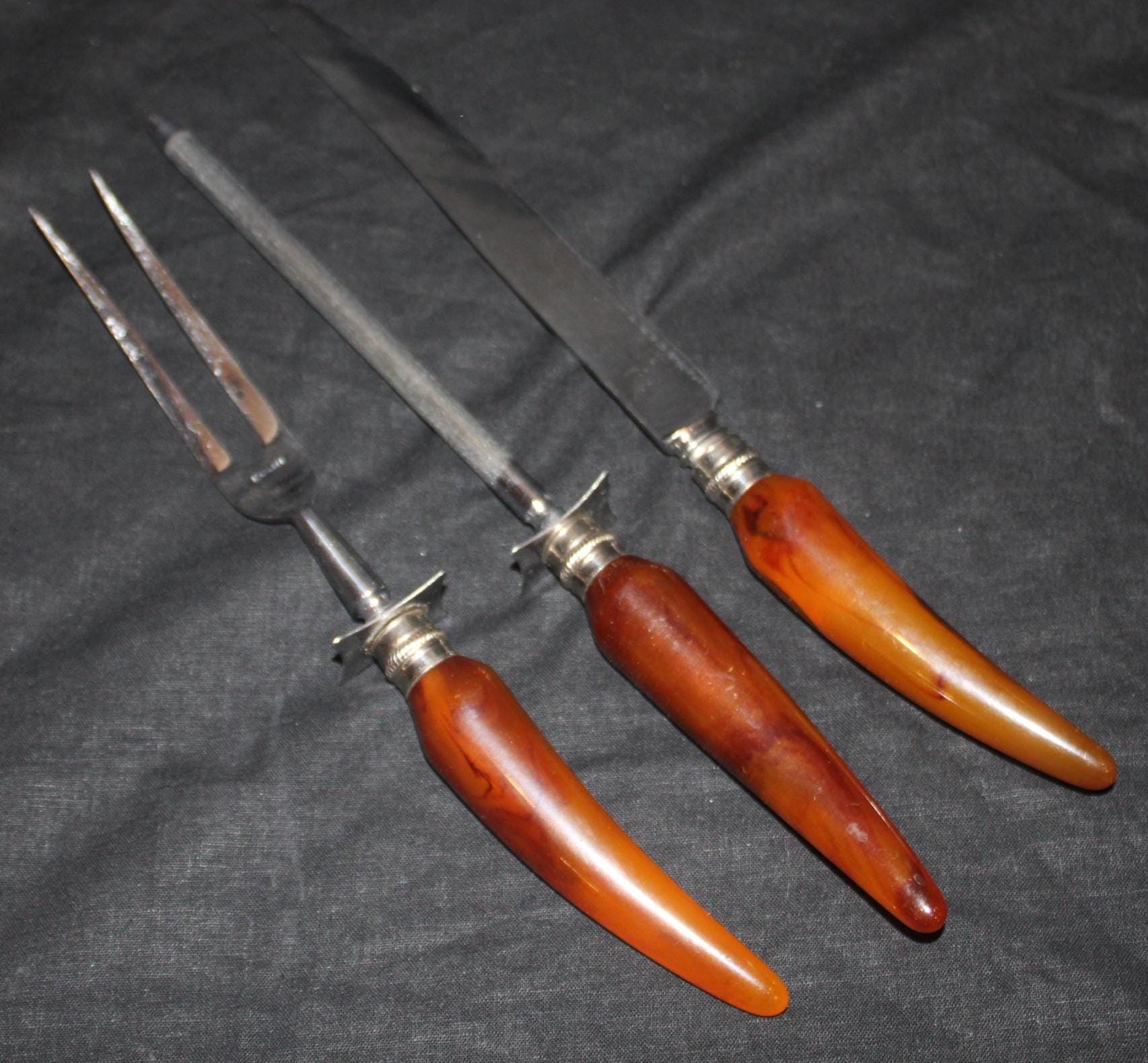 This Englishtown Sheffield 3 Piece Stainless Steel Carving Set with Butterscotch Bakelite Handles would be a great asset to your Thanksgiving table- the "carver" "head of the table" "the (self-declared) best turkey slicer ever" will have no issues...( YES...we all have one). The Knife is 12.5" in length and is in great condition and very sharp; the Bakelite handles have no cracks. Perfect set! Please message us if your "carver" has any concerns- Thanks for looking!