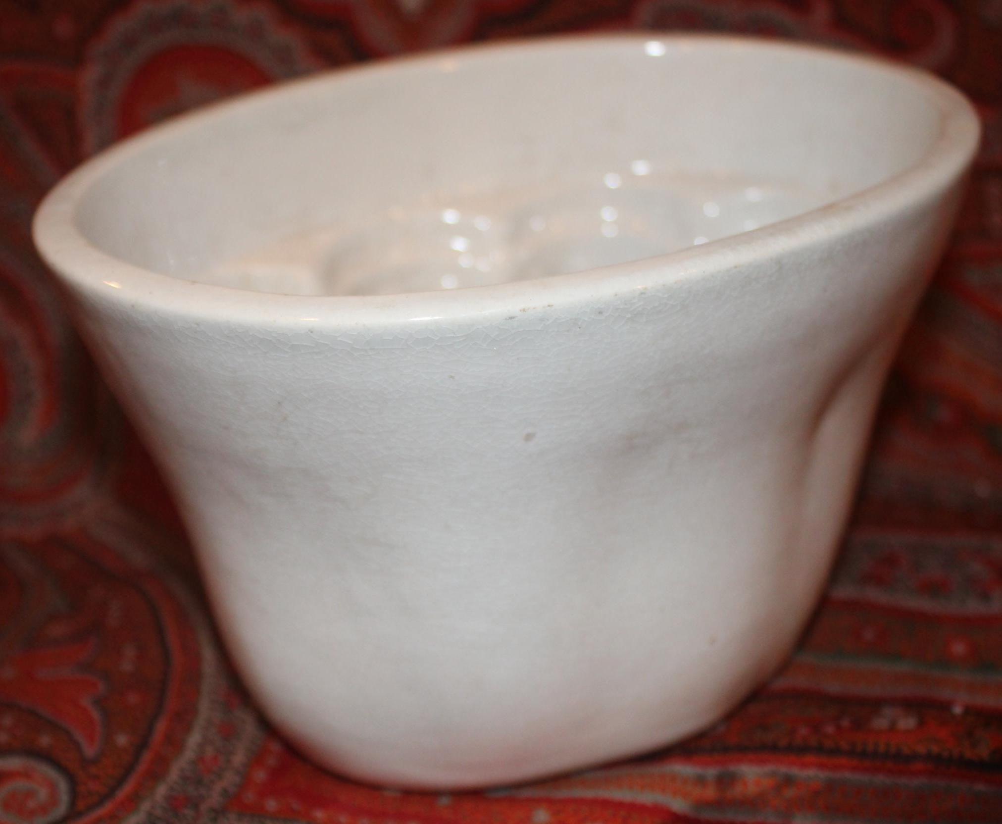 This Gorgeous 19th Century Antique White Ironstone Pudding Mold is in great condition and would look stunning in your French Farmhouse kitchen! It is 7"long x 5.5"wide and 4.5" in depth. It has slight wear which is reflective of its age and some crazing- but no chips or cracks. It is marked in the center of the underside but is very difficult to decipher. Thanks for looking- Please message us if you have any questions!