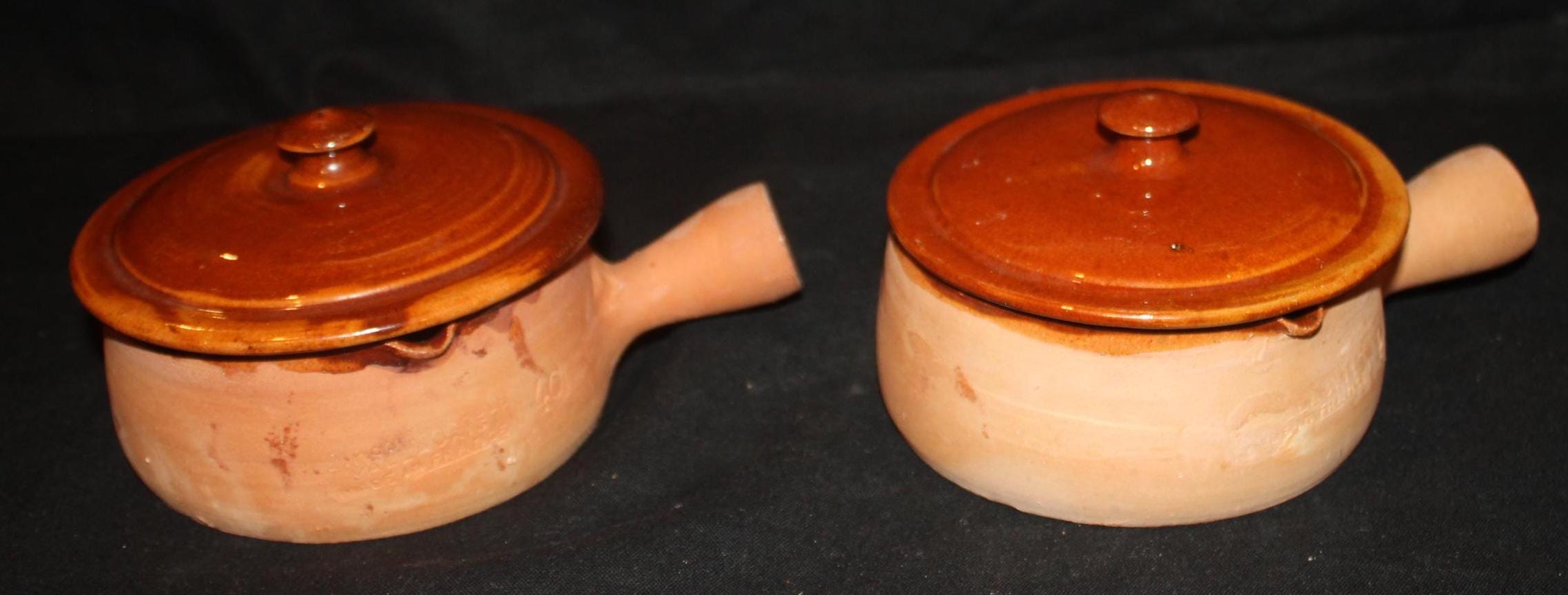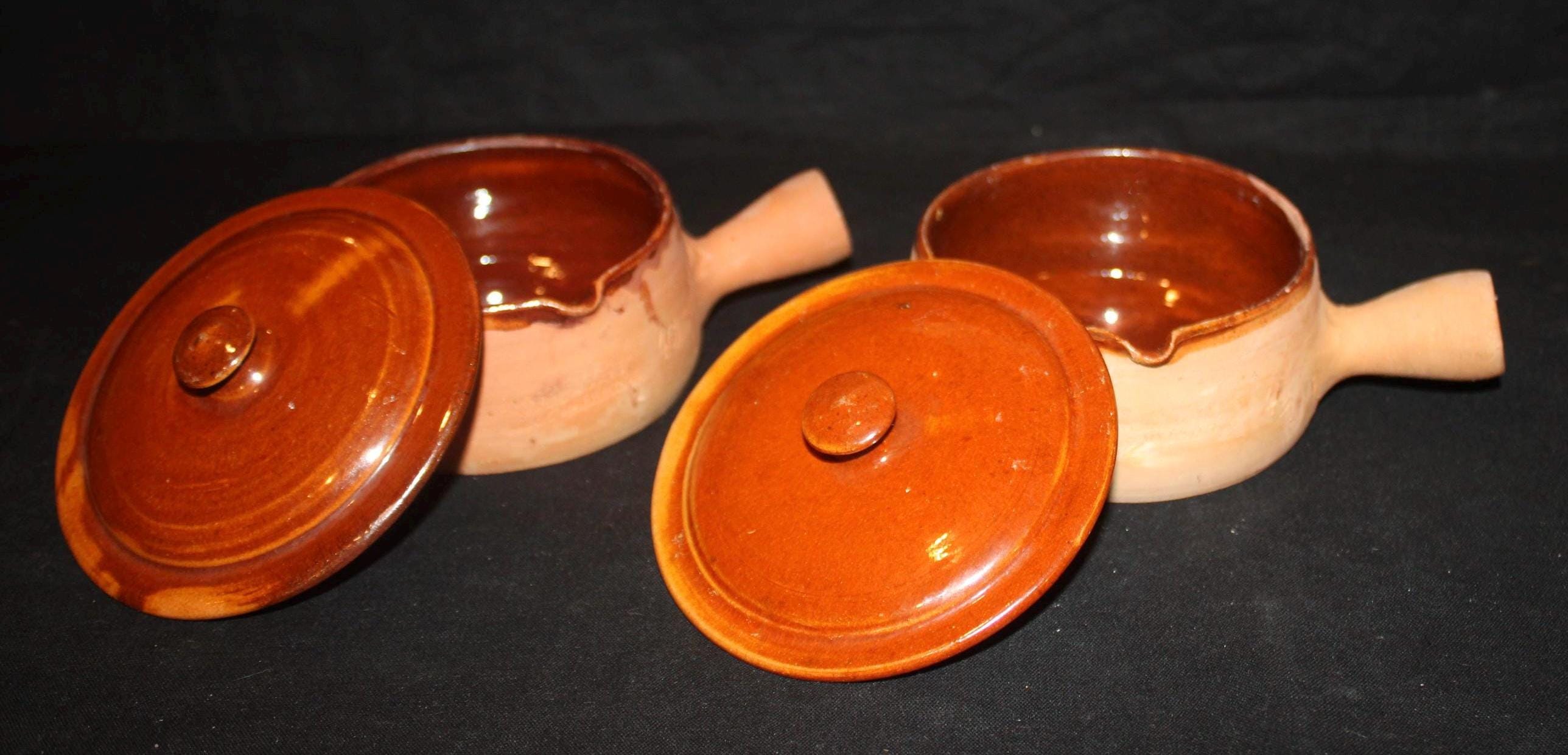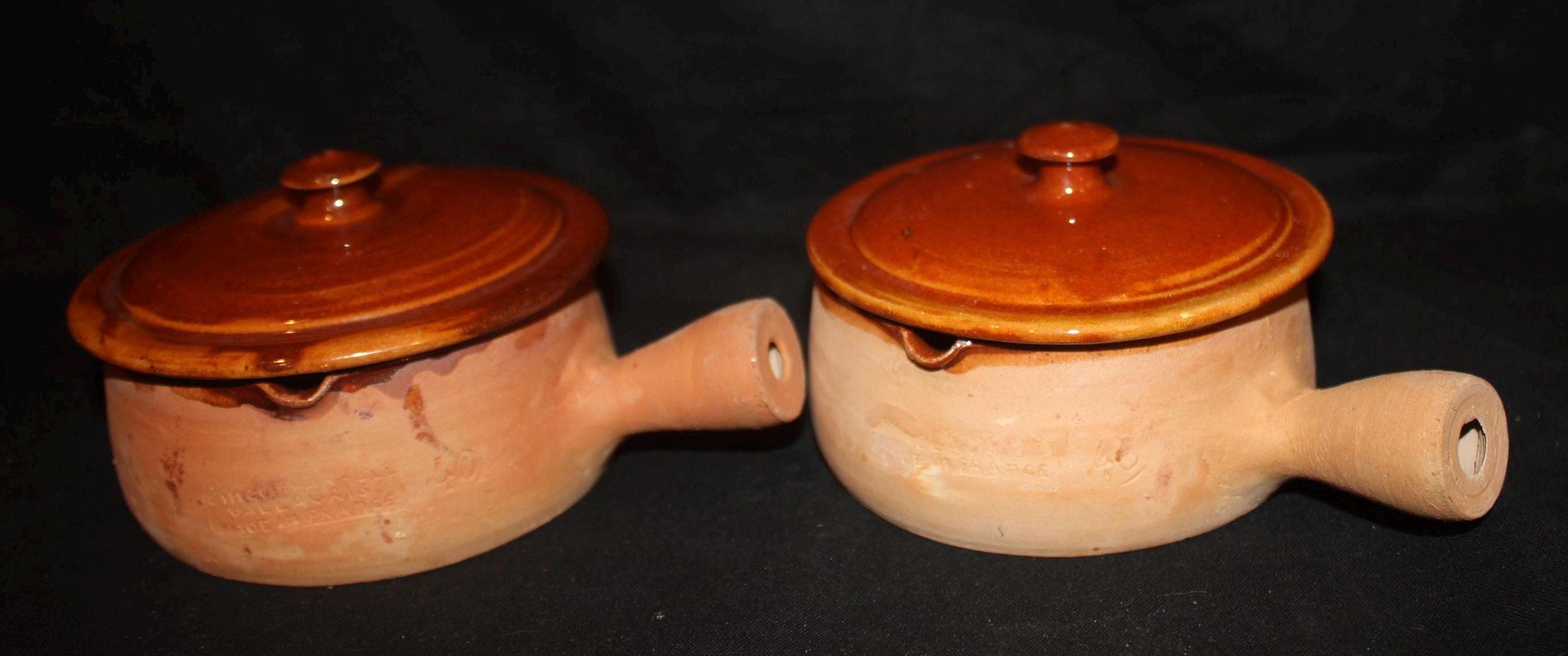 These handled terra-cotta pots were made in the southern coastal city of Vallaurie, France. They are glazed on the interior and the top of the lids; the underside of the lids are marked with a "40"; the pots have an incised side stamp "made in France". The bowls are 4" in diameter; the handles extend 1.75" from the bowls; the bowls with the lids are 3.5" tall. There are no chips or cracks. Please message us if you have any questions- Thanks for looking!
