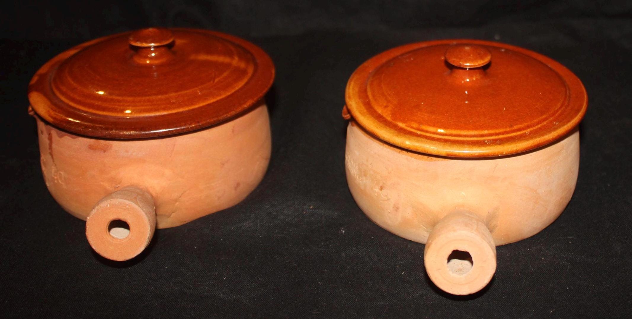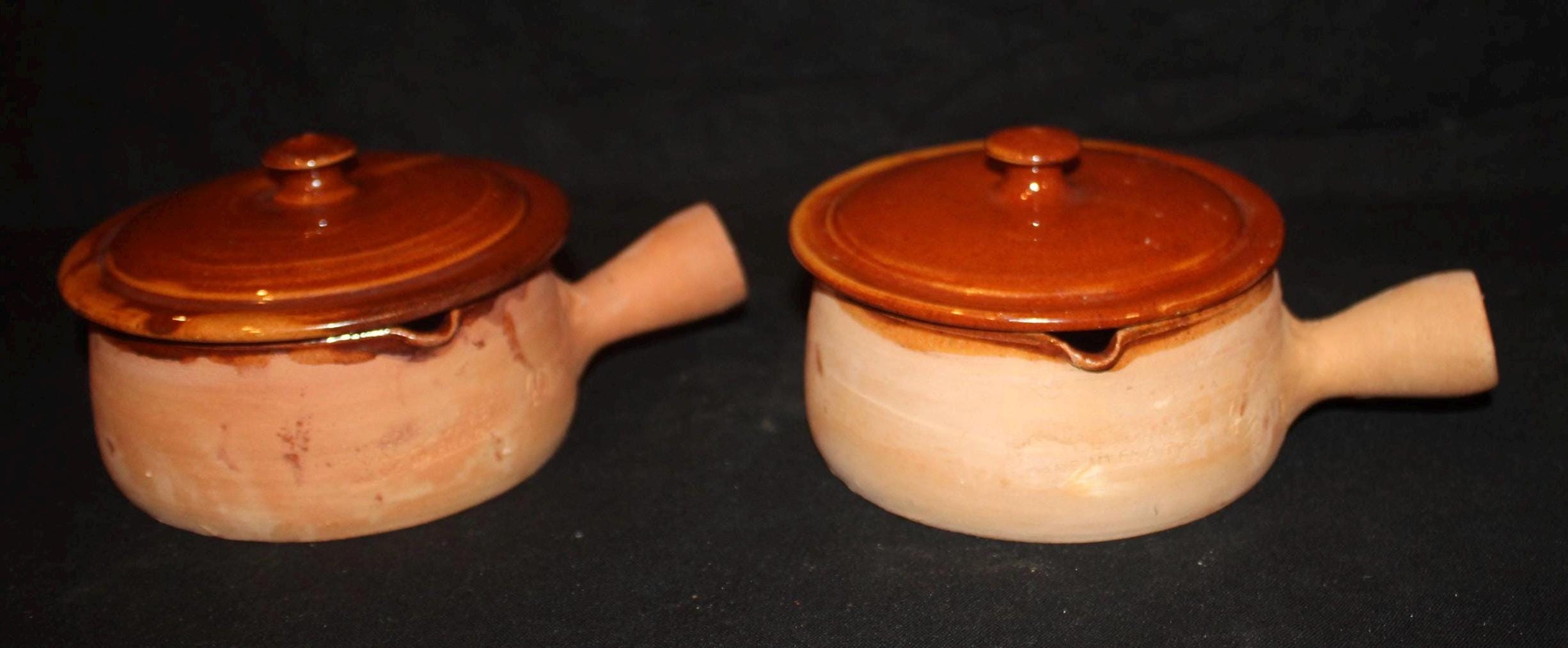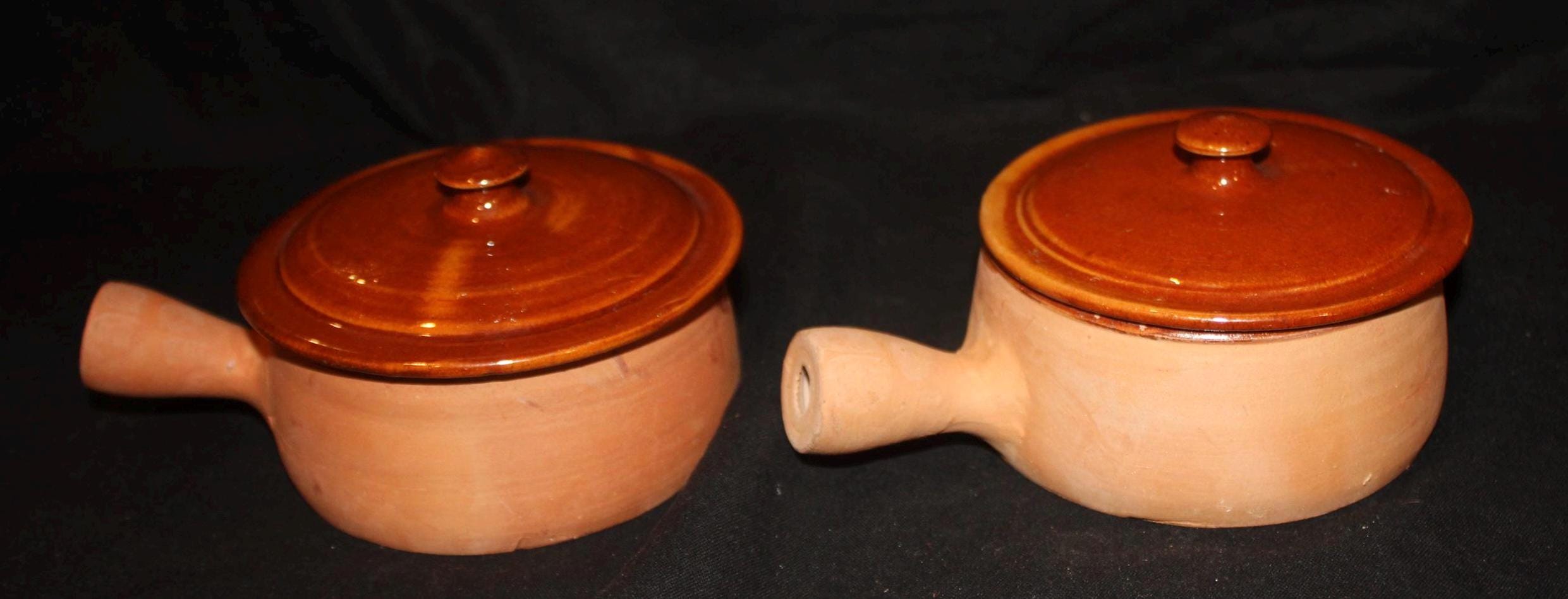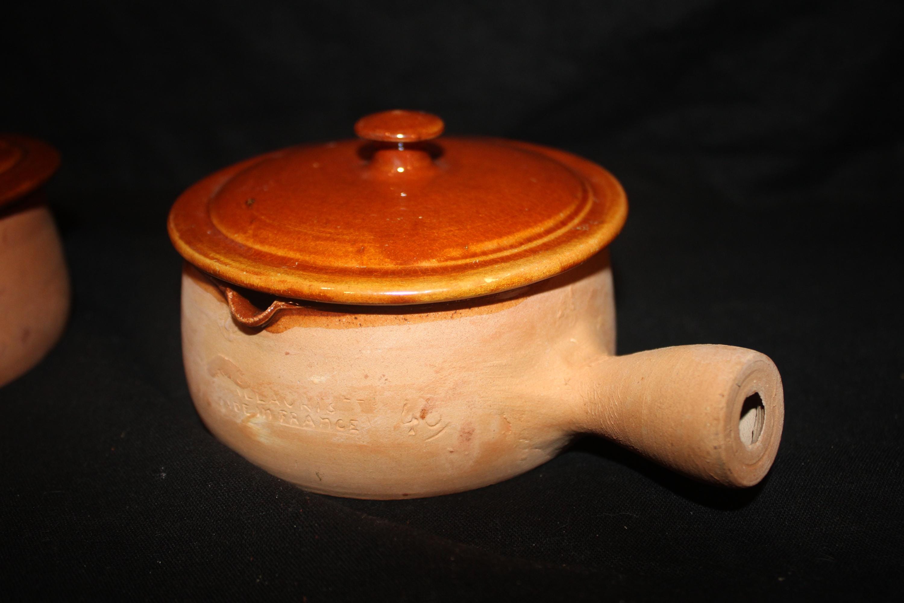 These handled terra-cotta pots were made in the southern coastal city of Vallaurie, France. They are glazed on the interior and the top of the lids; the underside of the lids are marked with a "40"; the pots have an incised side stamp "made in France". The bowls are 4" in diameter; the handles extend 1.75" from the bowls; the bowls with the lids are 3.5" tall. There are no chips or cracks. Please message us if you have any questions- Thanks for looking!