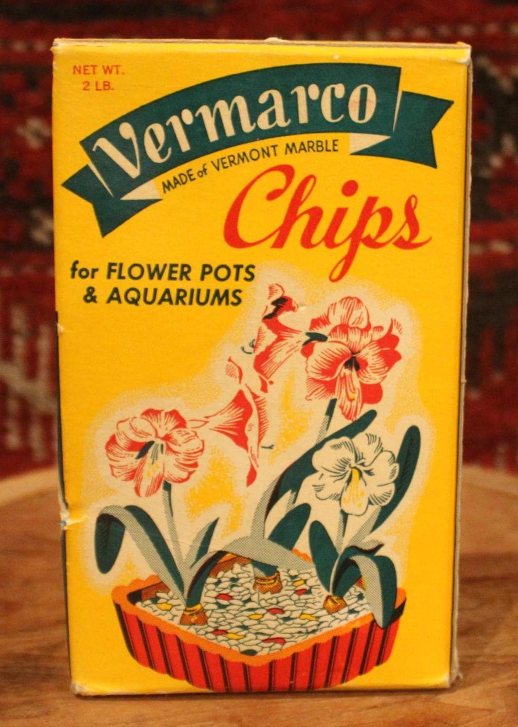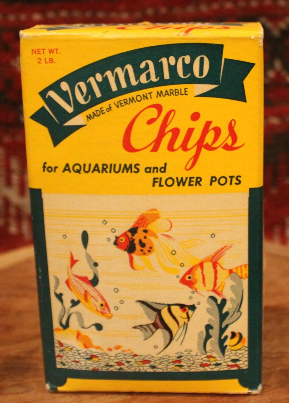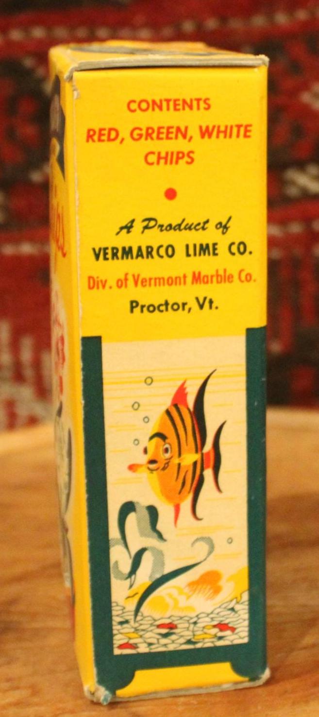 This box of Vermarco chips is so cool- the graphics are great, the color is bright, and the box is very clean. The contents are untouched- the box has never been opened. The chips were produced by the Vermont Marble Company and marketed for use in aquariums and flower pots. The Vermont Marble Company, established in 1880 by Redfield Proctor, was once a world-renowned producer of marble, used in iconic structures like the US Supreme Court Building and the Tomb of the Unknown Soldier.