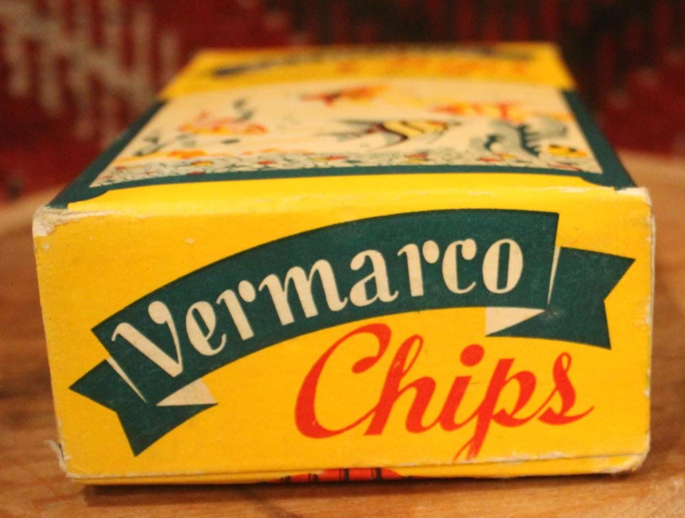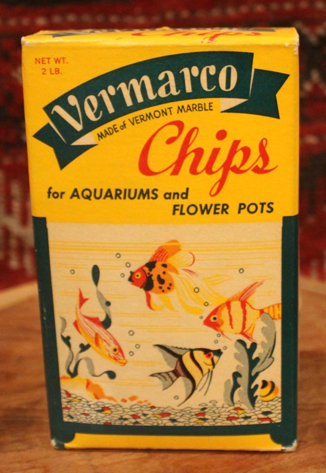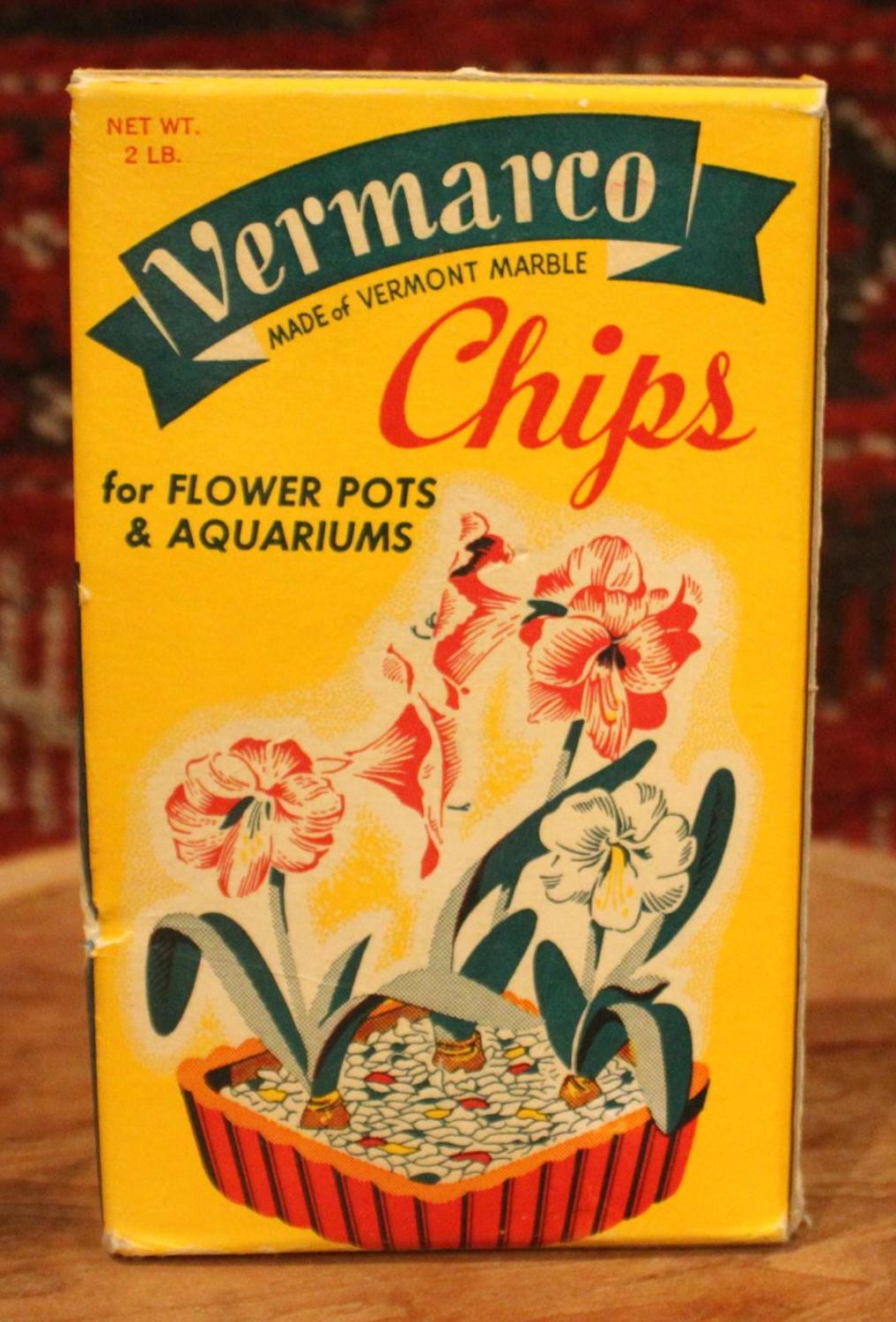 This box of Vermarco chips is so cool- the graphics are great, the color is bright, and the box is very clean. The contents are untouched- the box has never been opened. The chips were produced by the Vermont Marble Company and marketed for use in aquariums and flower pots. The Vermont Marble Company, established in 1880 by Redfield Proctor, was once a world-renowned producer of marble, used in iconic structures like the US Supreme Court Building and the Tomb of the Unknown Soldier.