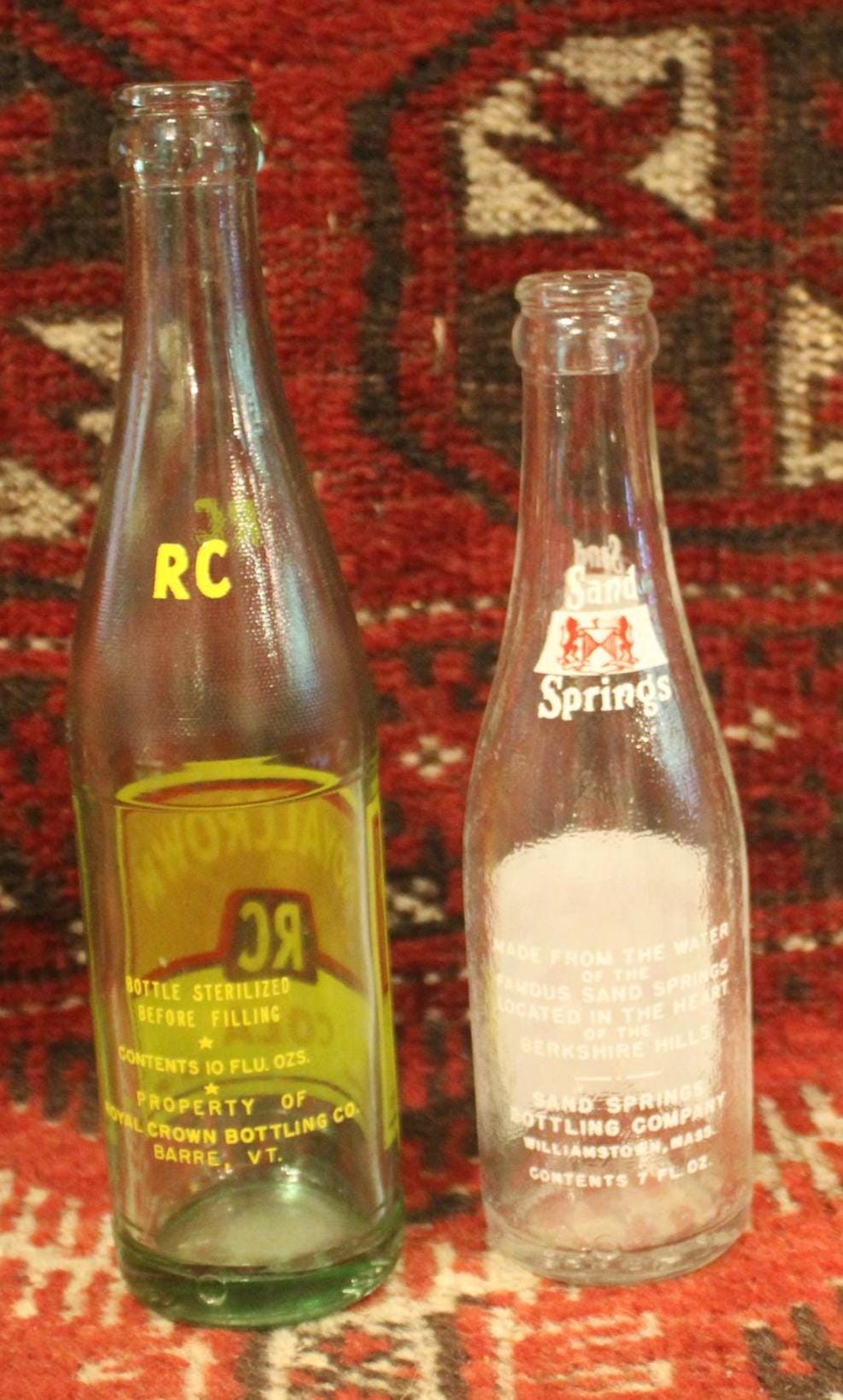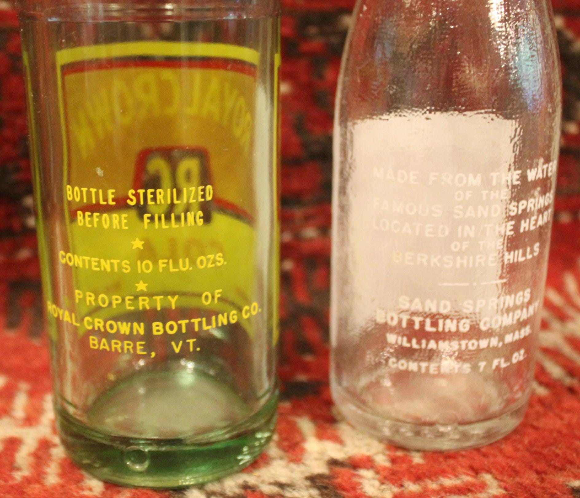 These Two Bottles : A Sand Springs Bottle from Berkshire Hills, Williamstown, Mass. and a Royal Crown Cola from Barre Vermont would be such a great addition to your bottle collection! Each is very clean with wonderful bright graphics. The Royal Crown is 9.75" tall and the Sand Springs is 8.25" tall. There are no chips or cracks. We are selling them together. Please message us if you have any questions- Thanks for looking!