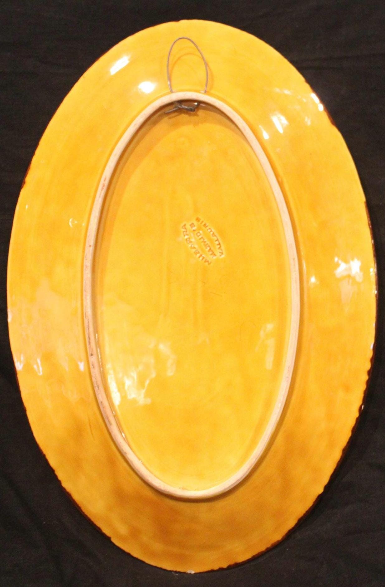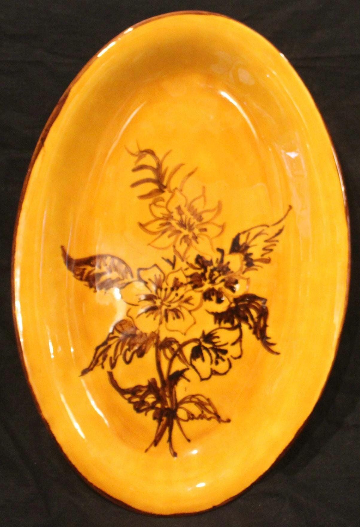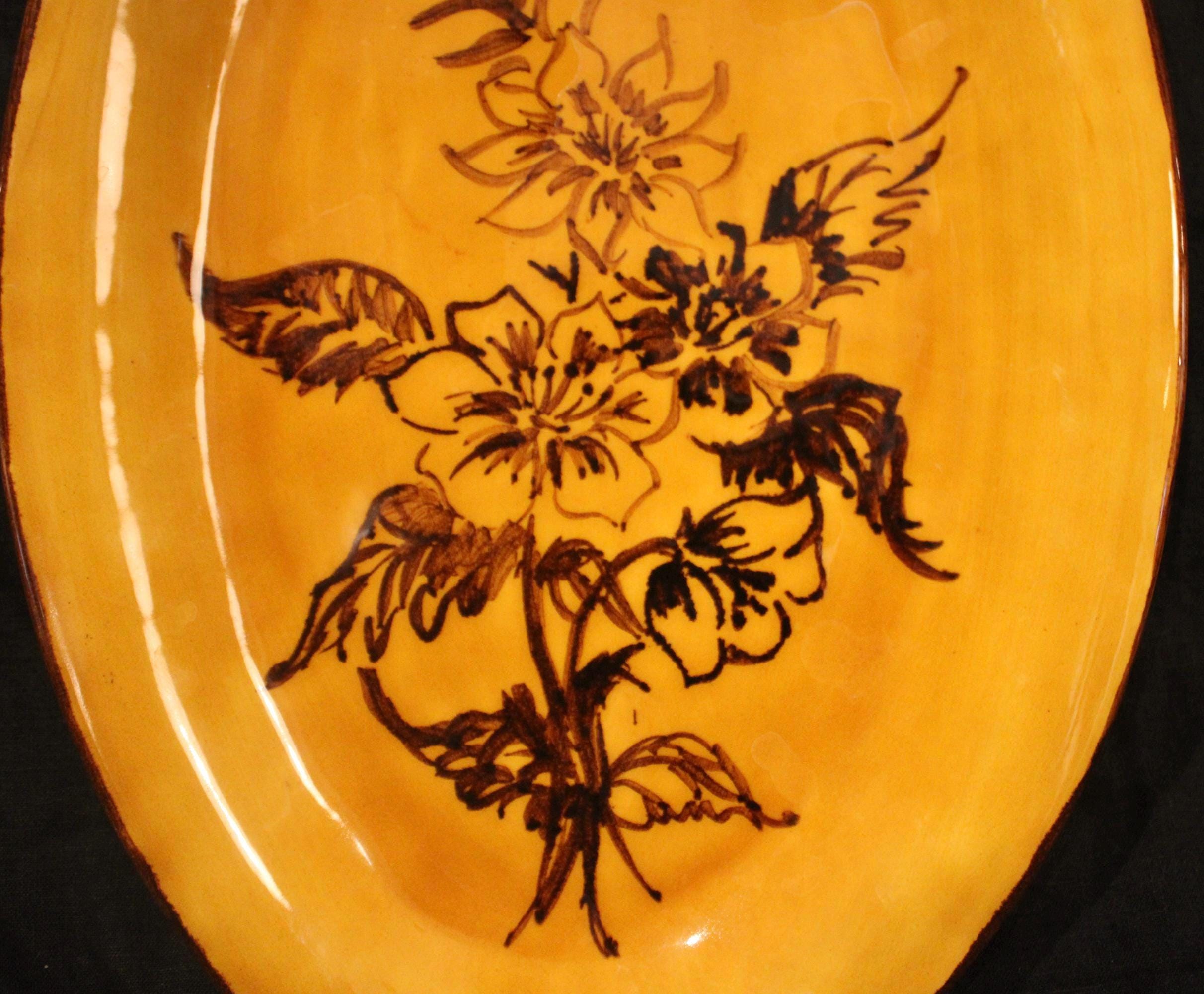 This Marius Musarra Mabyjo Oval Plate made in Vallauris, France is available to you! The mustard floral plate will add the perfect pop of color to any room. There is a hanging ring on the underside of the plate that has been incorporated by the artist. The plate measures 15" long x 10" wide. There are two tiny chips to the underside of the rim which cannot be seen when the plate is hung. Please message us if you have any questions- Thanks for looking!