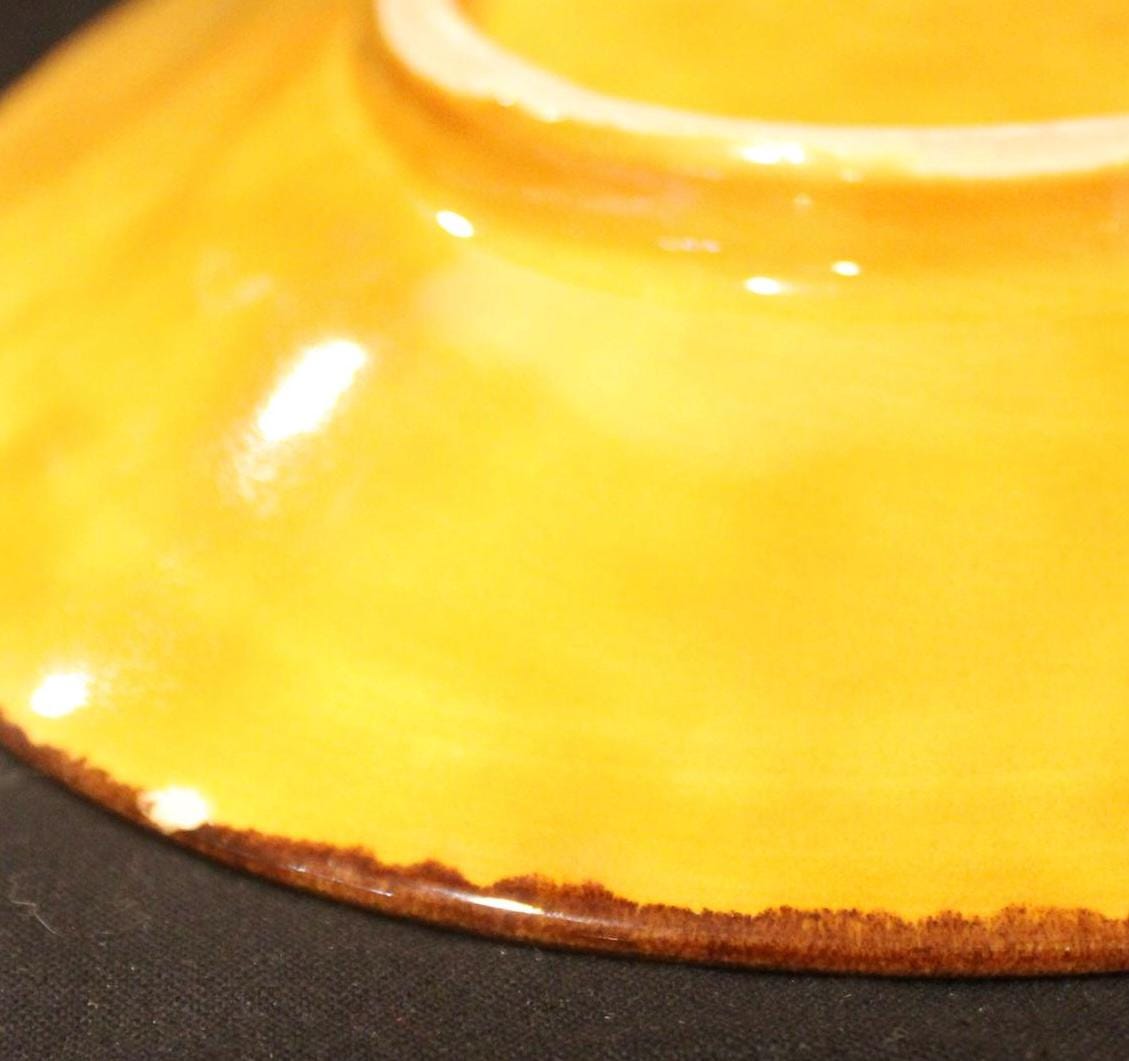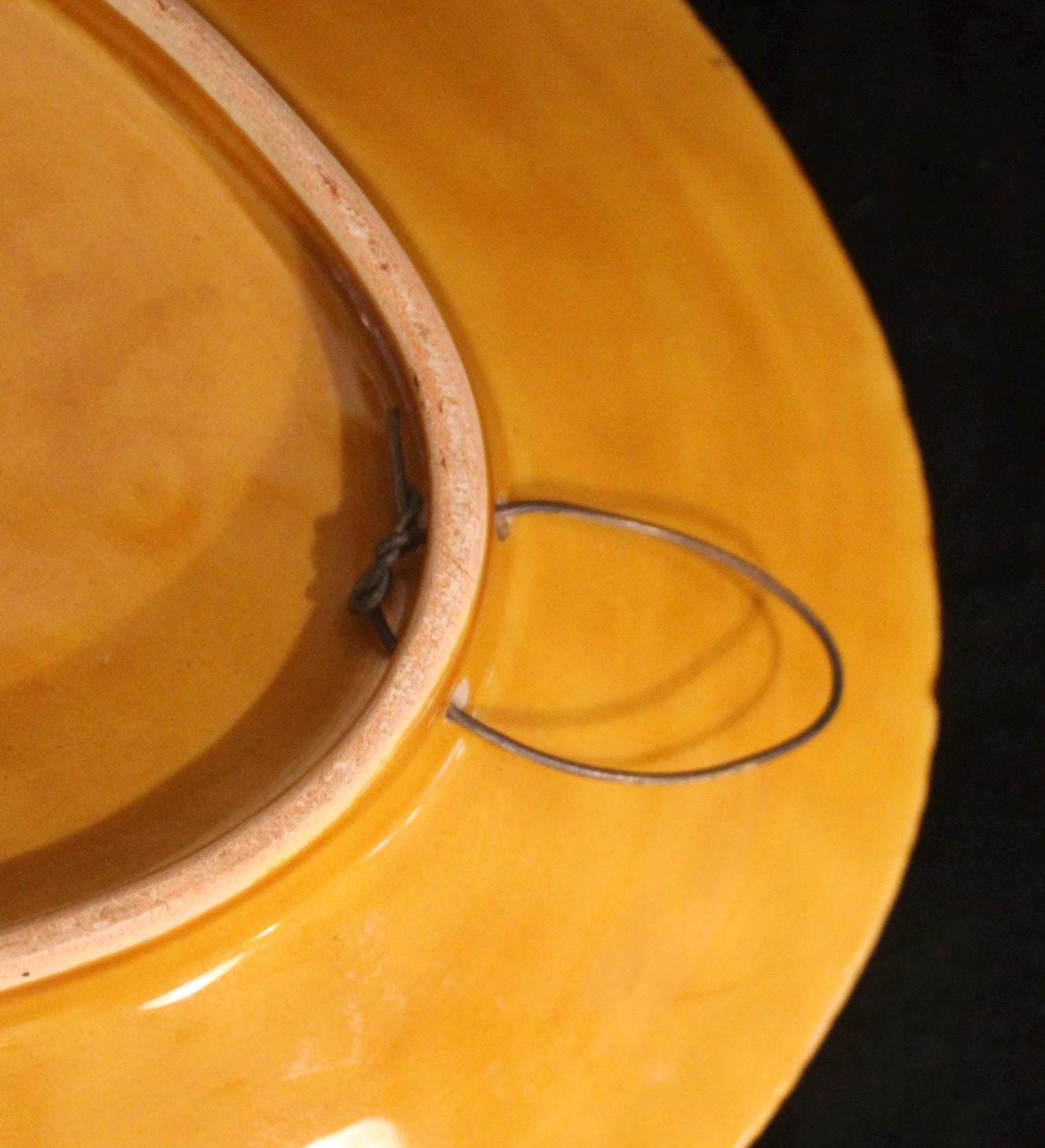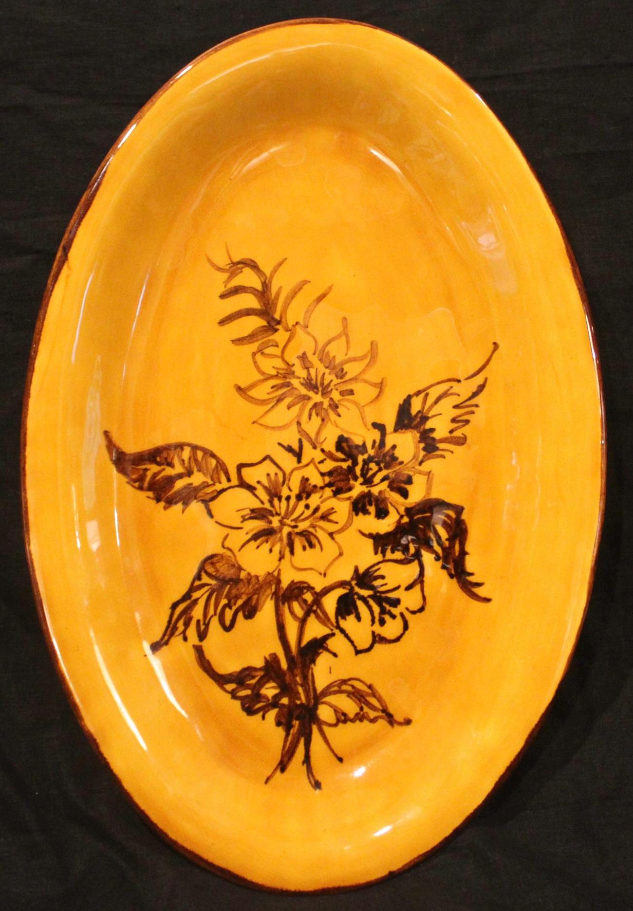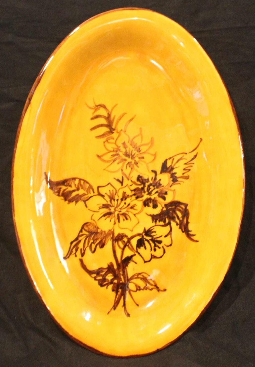 This Marius Musarra Mabyjo Oval Plate made in Vallauris, France is available to you! The mustard floral plate will add the perfect pop of color to any room. There is a hanging ring on the underside of the plate that has been incorporated by the artist. The plate measures 15" long x 10" wide. There are two tiny chips to the underside of the rim which cannot be seen when the plate is hung. Please message us if you have any questions- Thanks for looking!