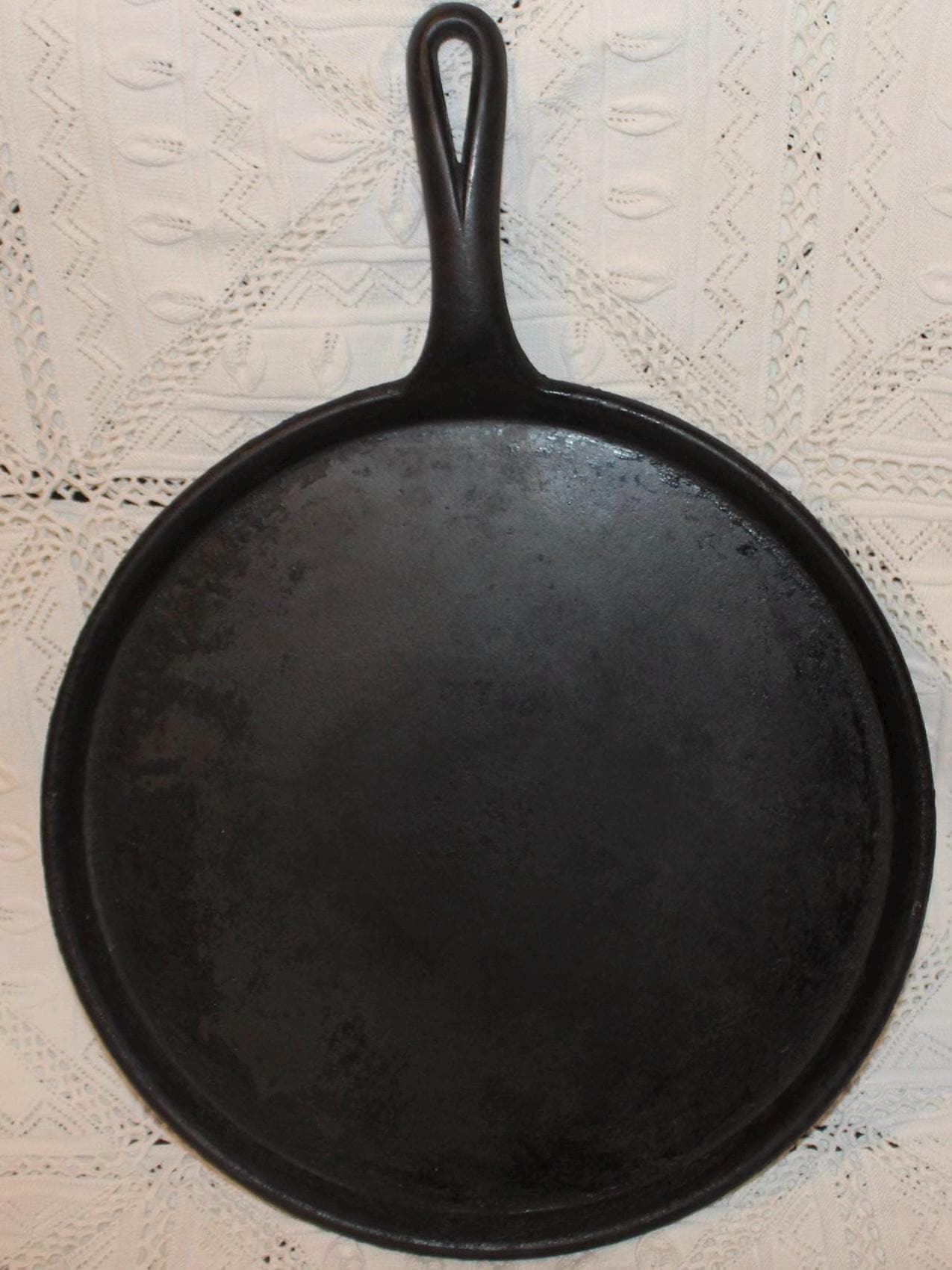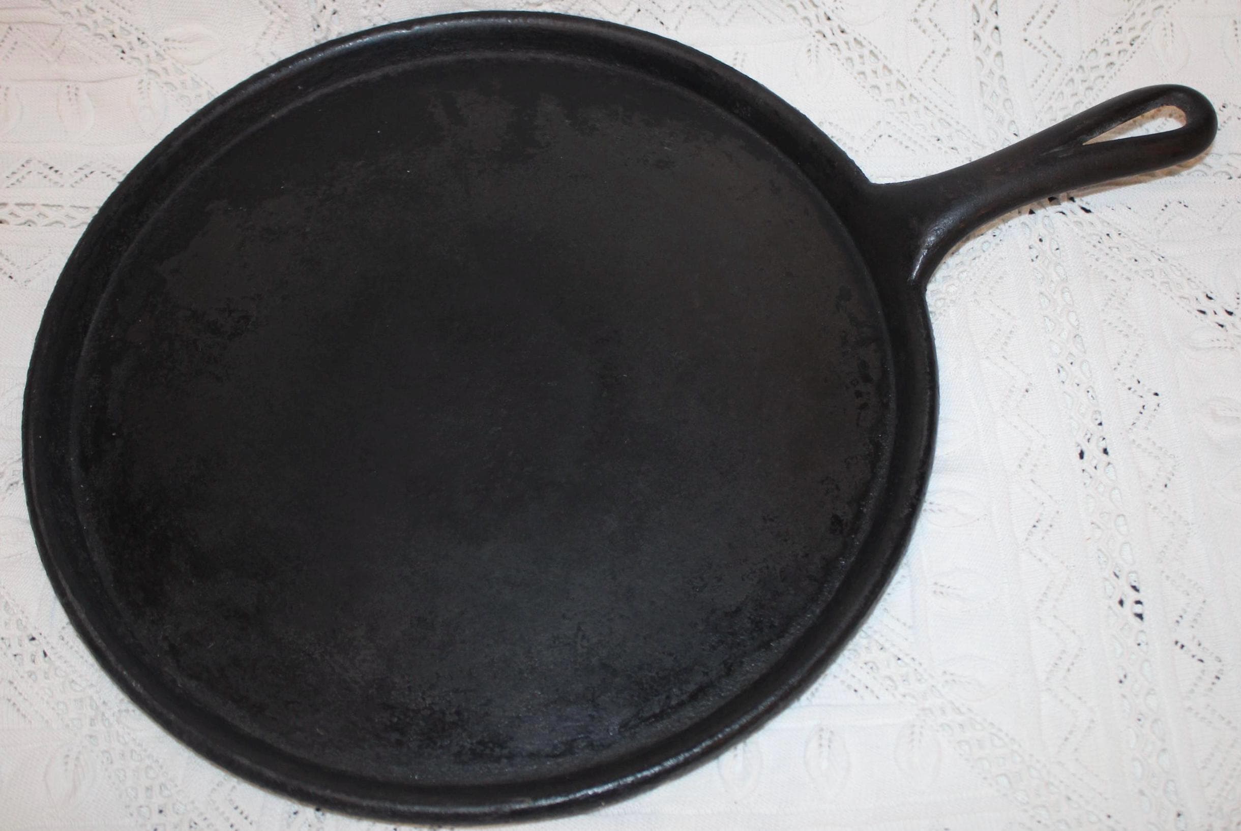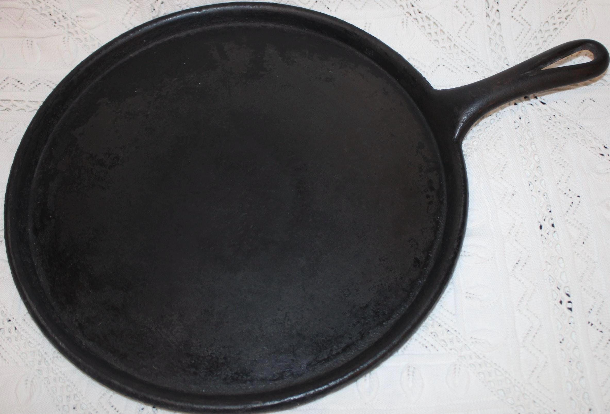 This Antique Flat Cast Iron Griddle is in great condition and marked with “NE 8” on the underside. It is a fabulous pan to use at home or on a campfire- Perfect for a pancake breakfast- bacon never tasted so good! It measures 13” in diameter with a 5.25” long handle. There are no chips or cracks; the pan lays flat. Please message us if you have any questions- Thanks for loo