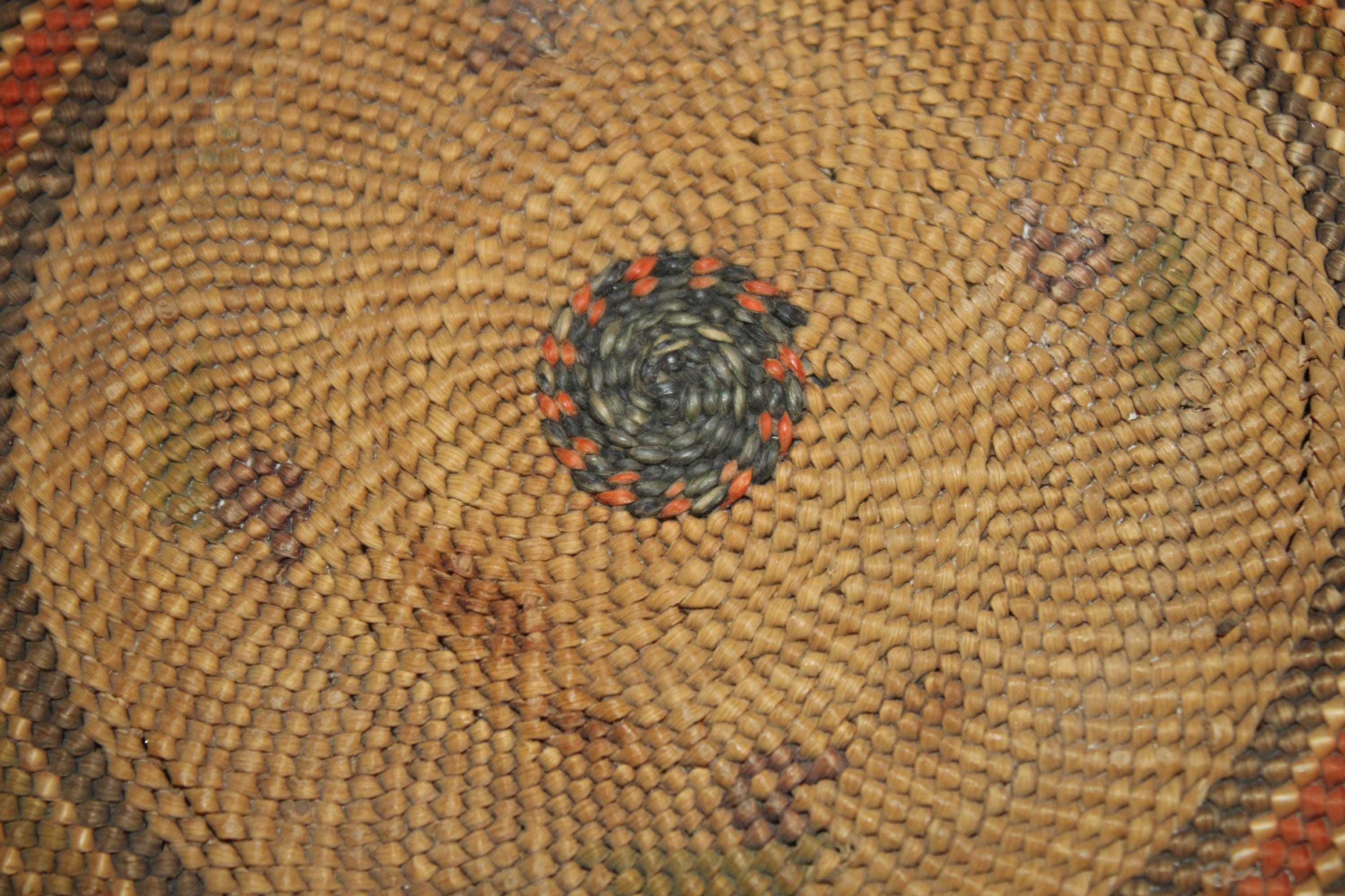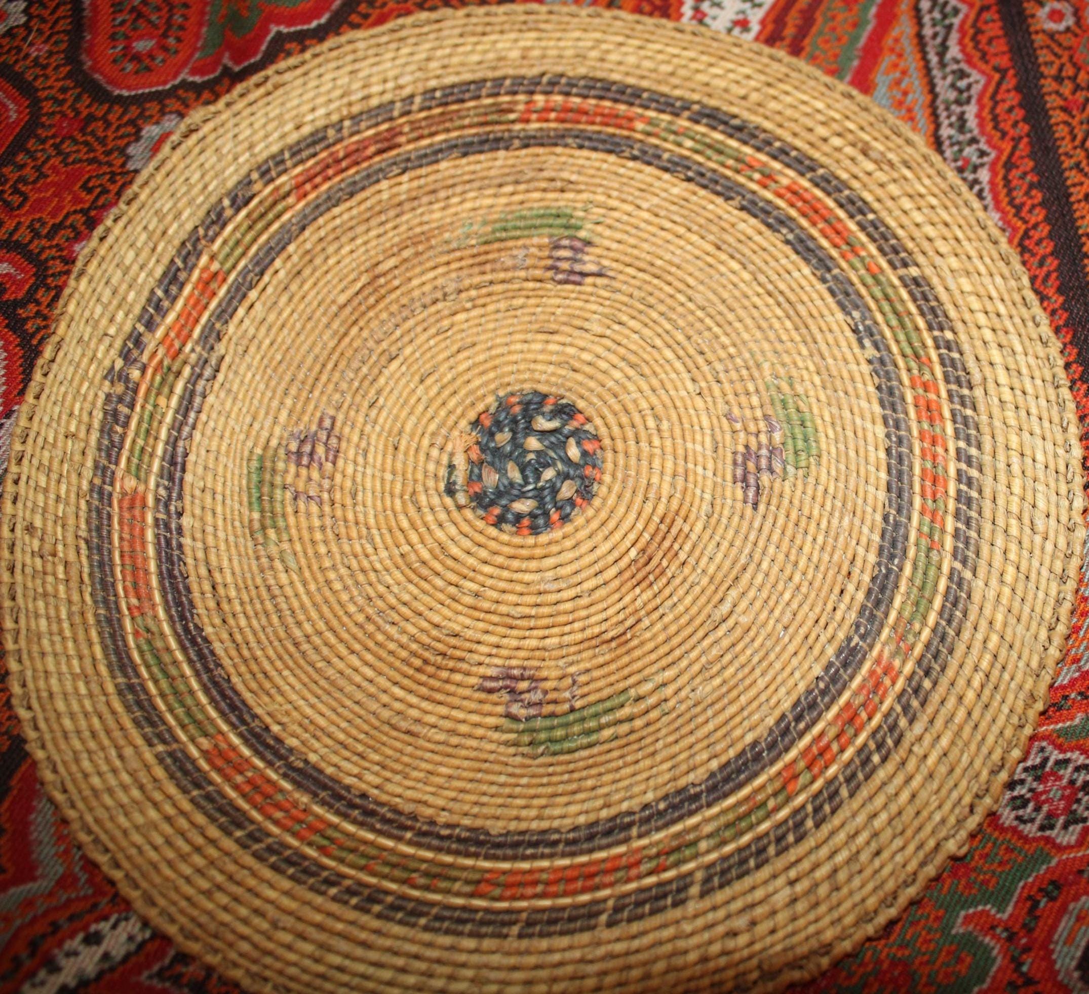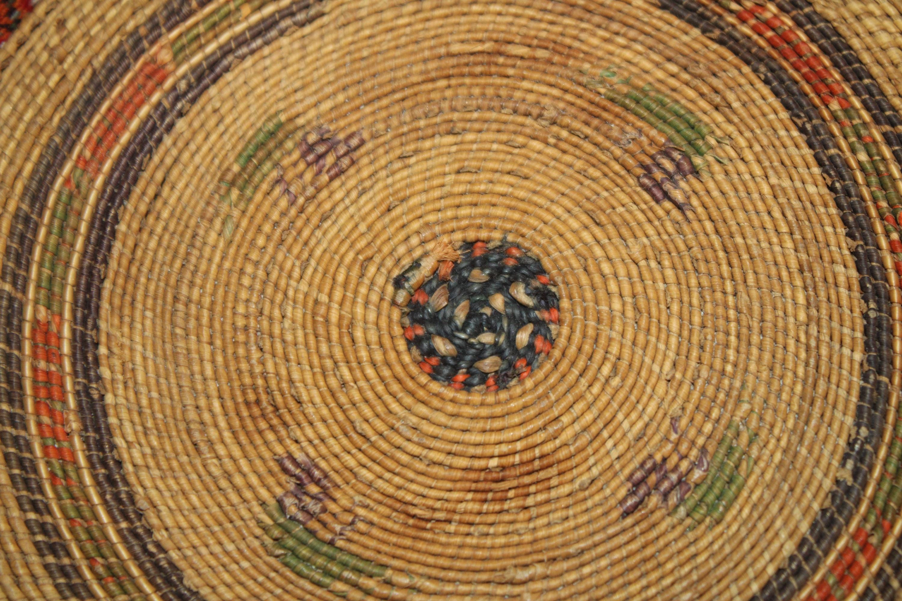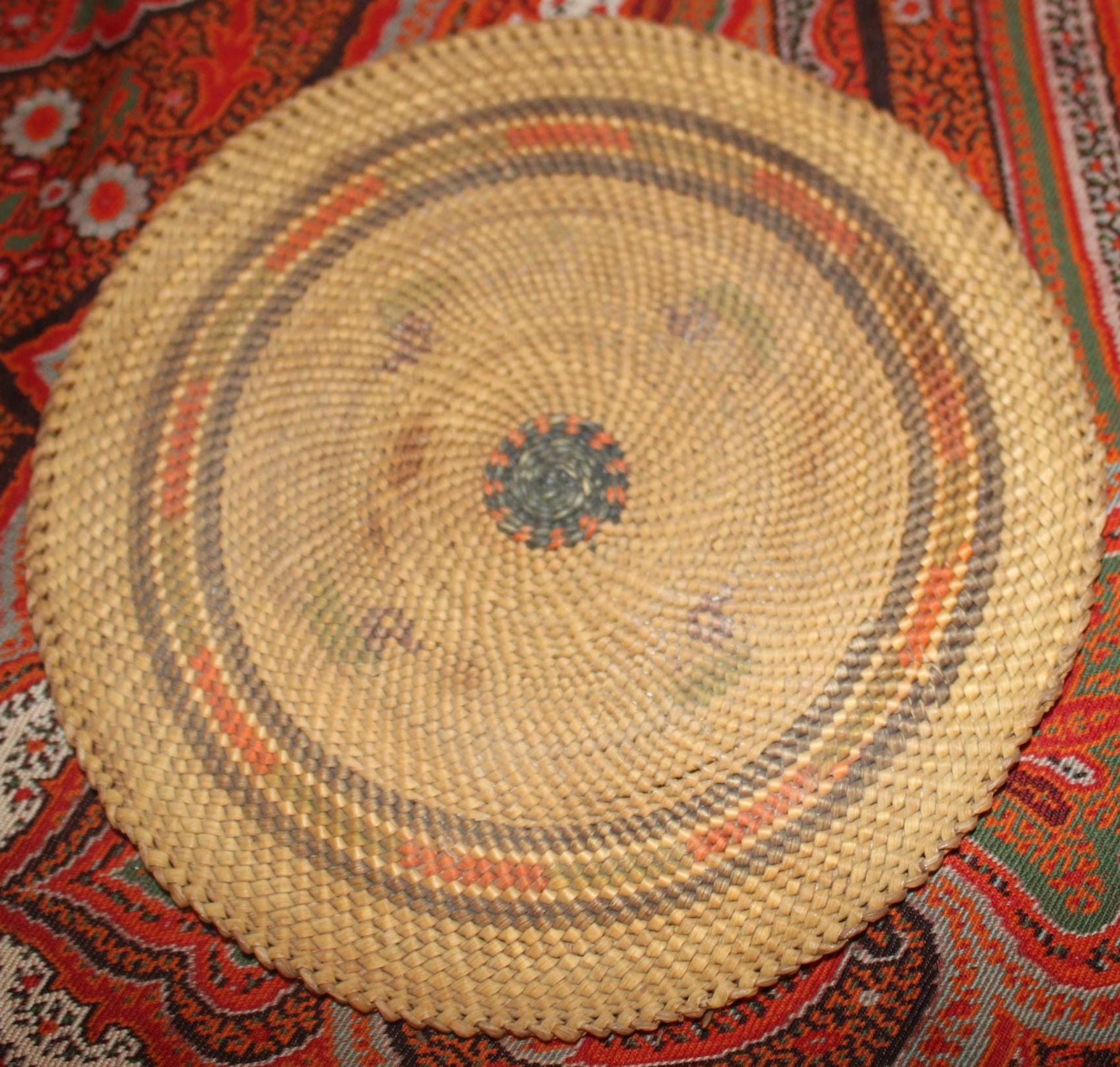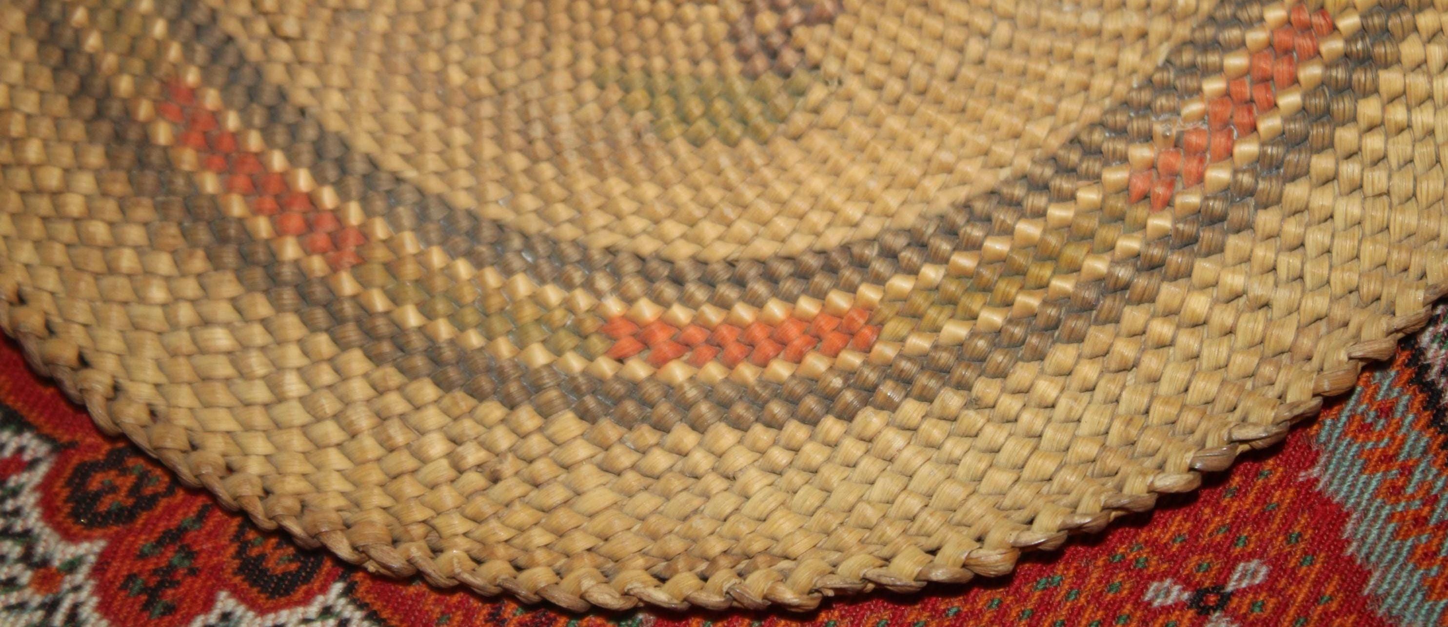 This Antique 19th century Northwest Coast Twined Mat Miniature Winnowing Tray is such a beautiful example of the intricate and masterful weaving accomplished by the Nuu-chah-nulth of Vancouver Island. The age darkened tray with natural dyed colors of red, green, and black are faded; there are a few spotted stains. It is 5.75" in diameter with no breaks. Please message us if you have any questions- Thanks for looking!