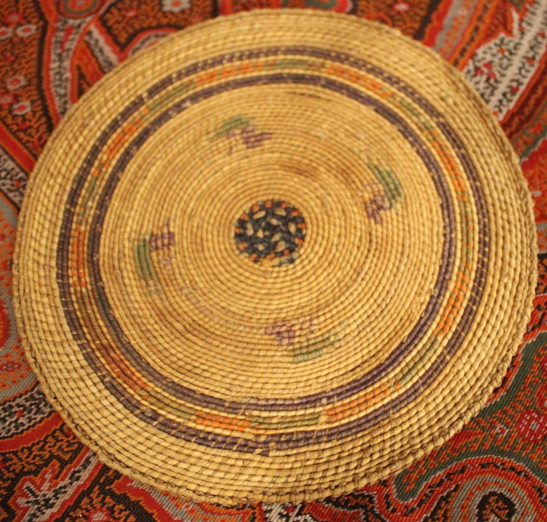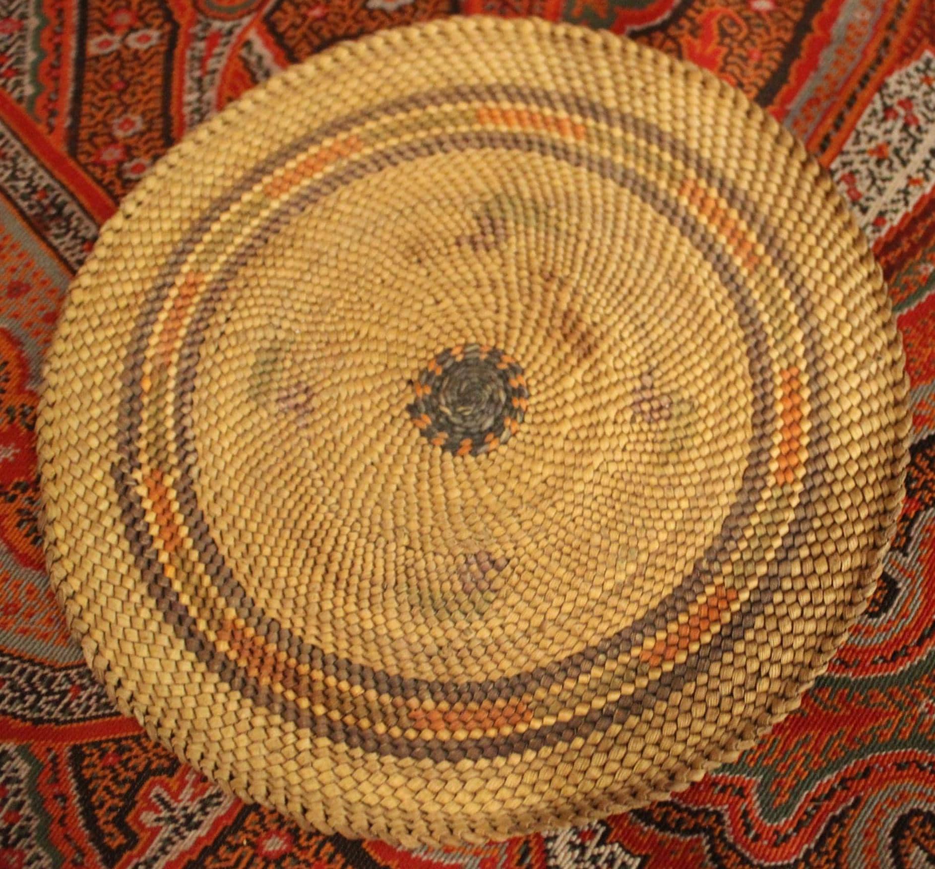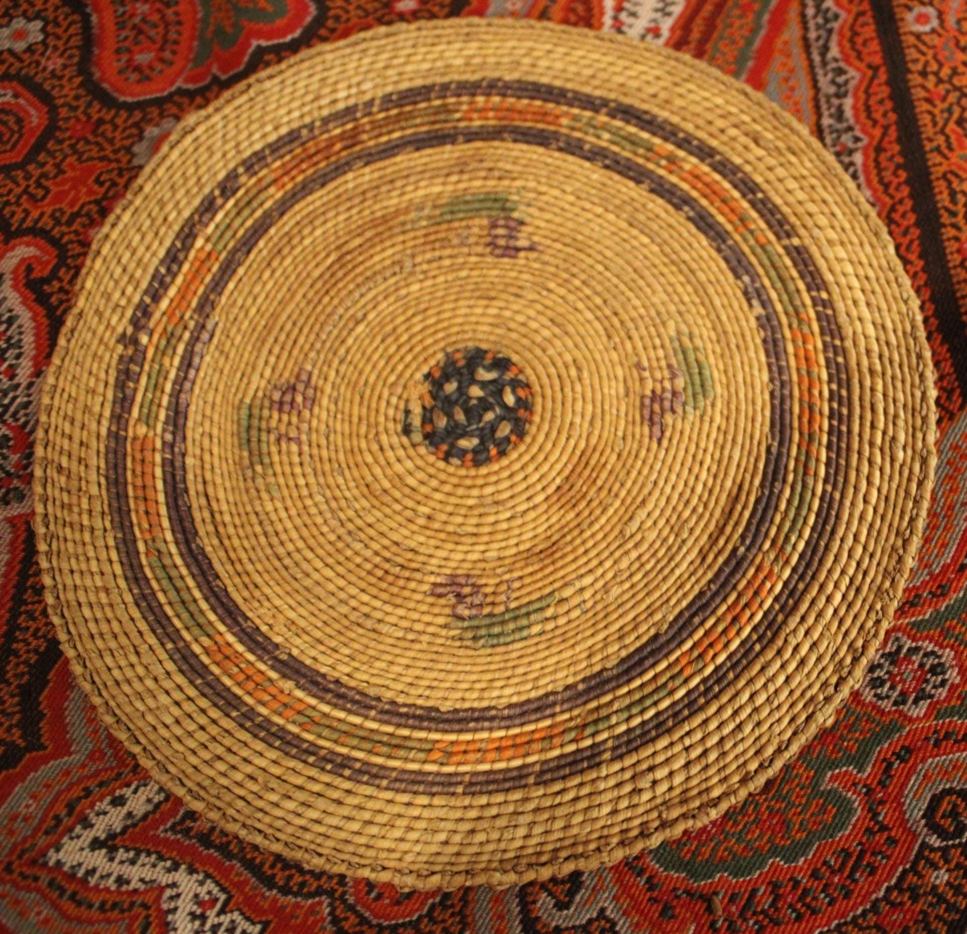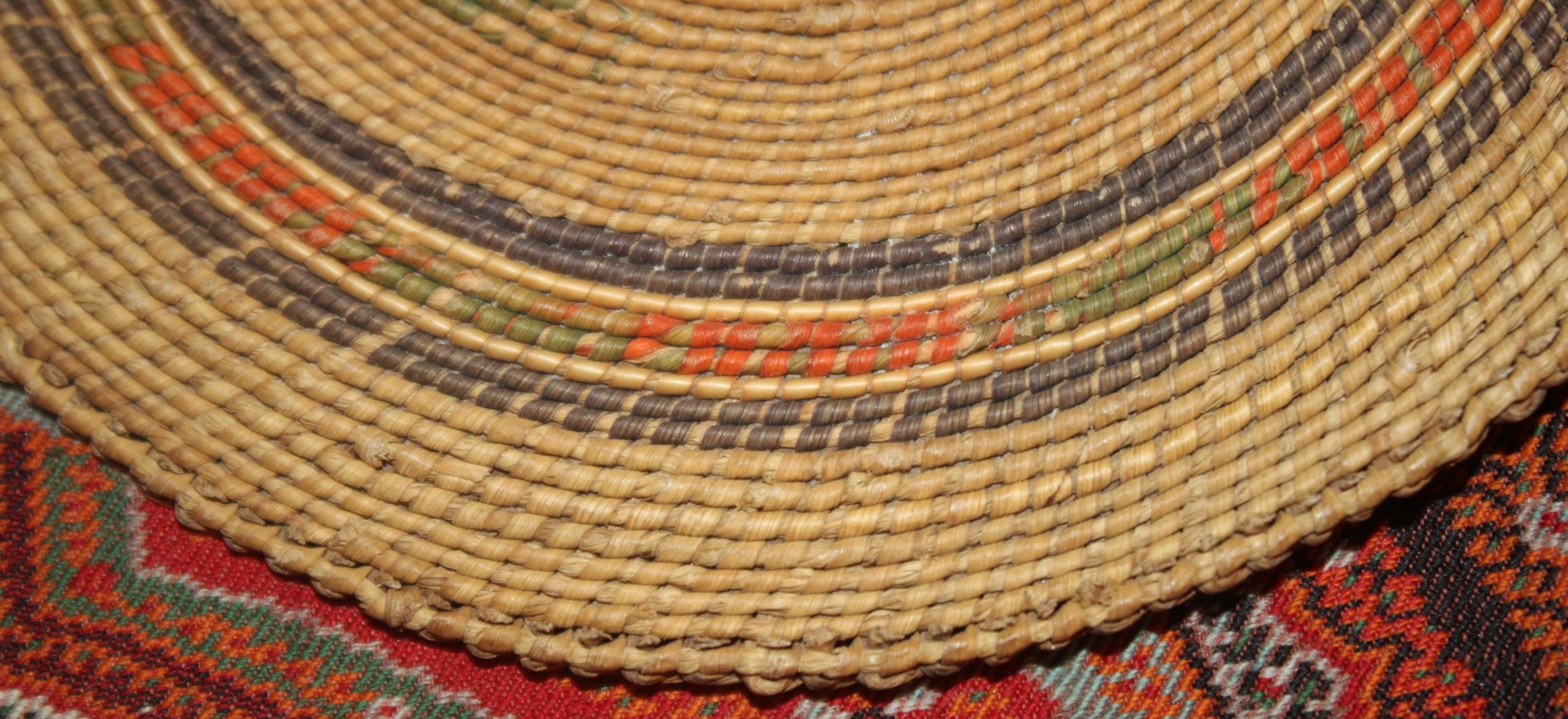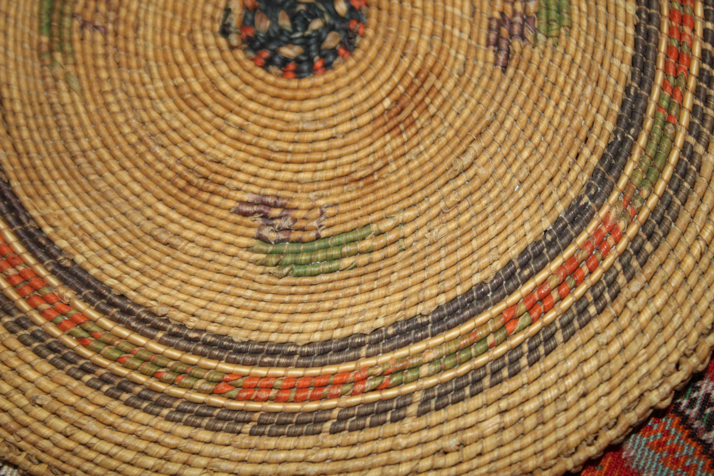 This Antique 19th century Northwest Coast Twined Mat Miniature Winnowing Tray is such a beautiful example of the intricate and masterful weaving accomplished by the Nuu-chah-nulth of Vancouver Island. The age darkened tray with natural dyed colors of red, green, and black are faded; there are a few spotted stains. It is 5.75" in diameter with no breaks. Please message us if you have any questions- Thanks for looking!
