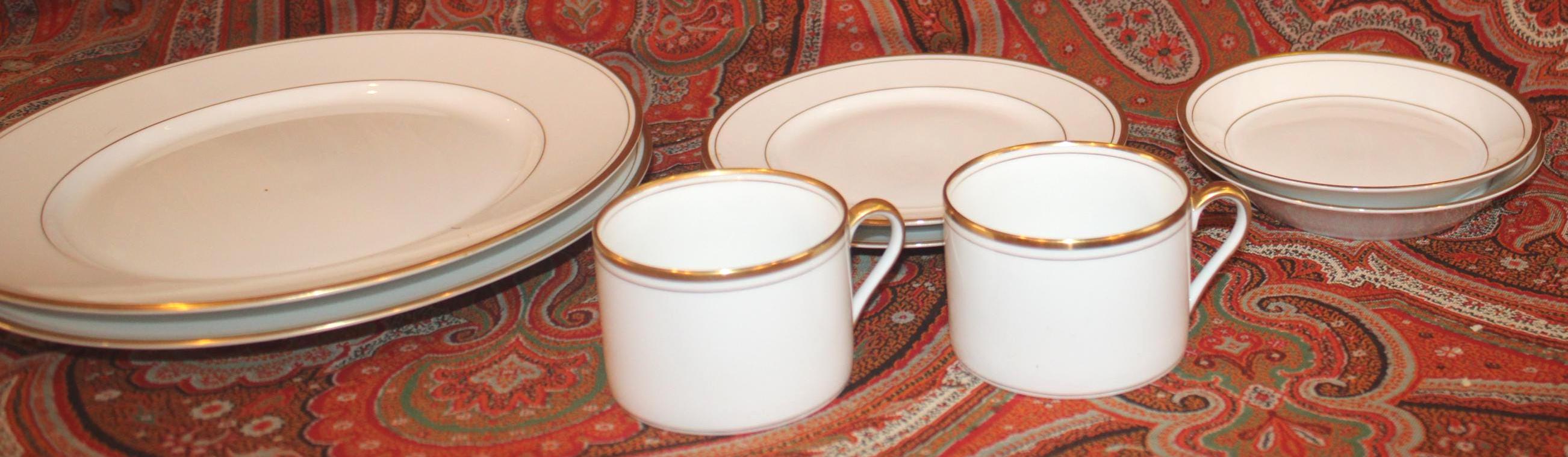 White Fitz and Floyd Palais Gold Trimmed 4 Piece Place Setting-Dinner Plate, Bread Plate, Cup, and Bowl/Saucer- Family/Holiday Dinner