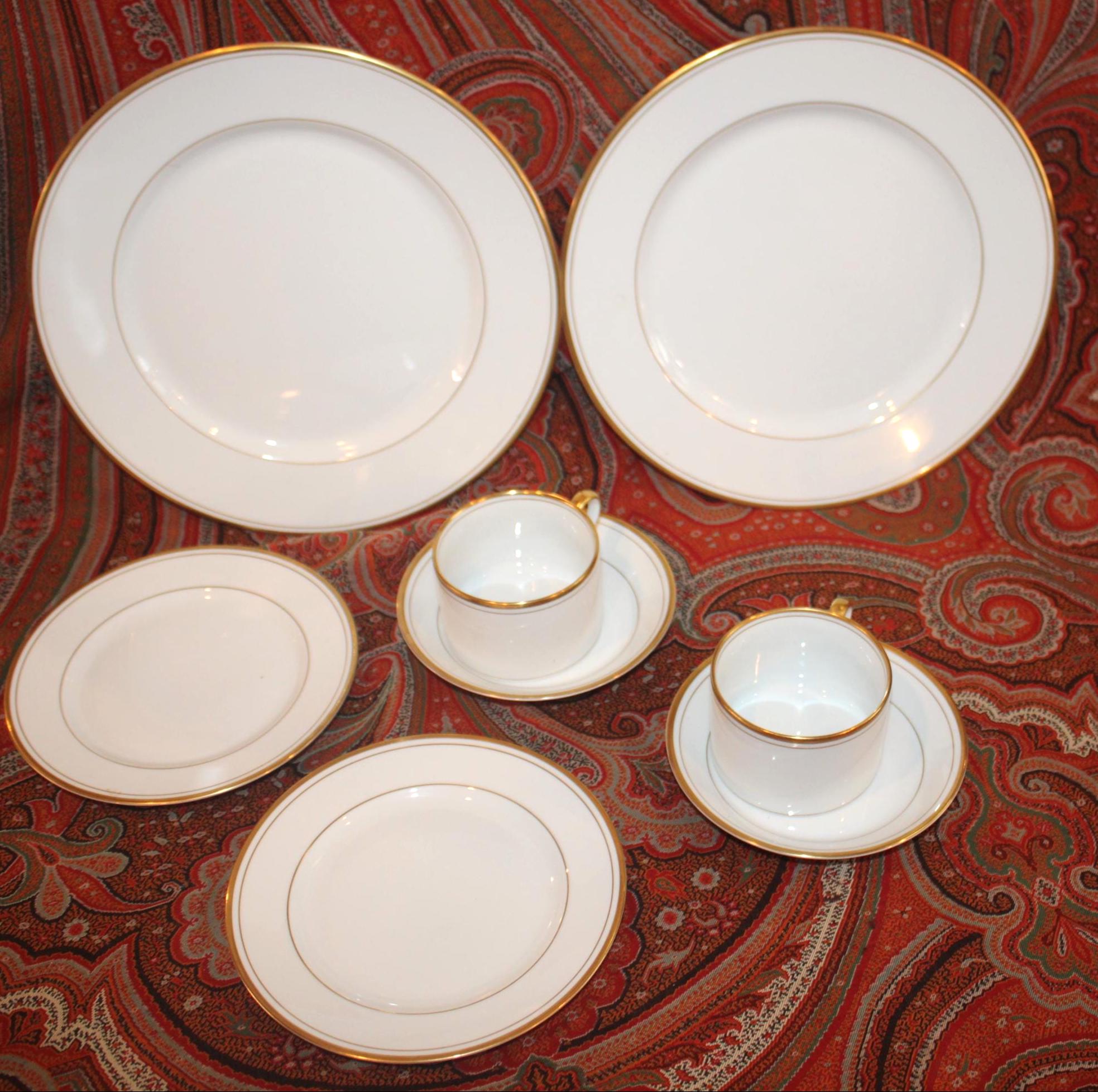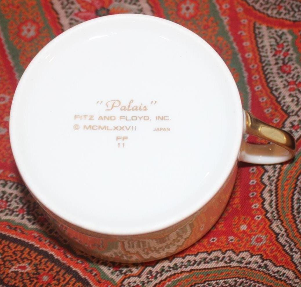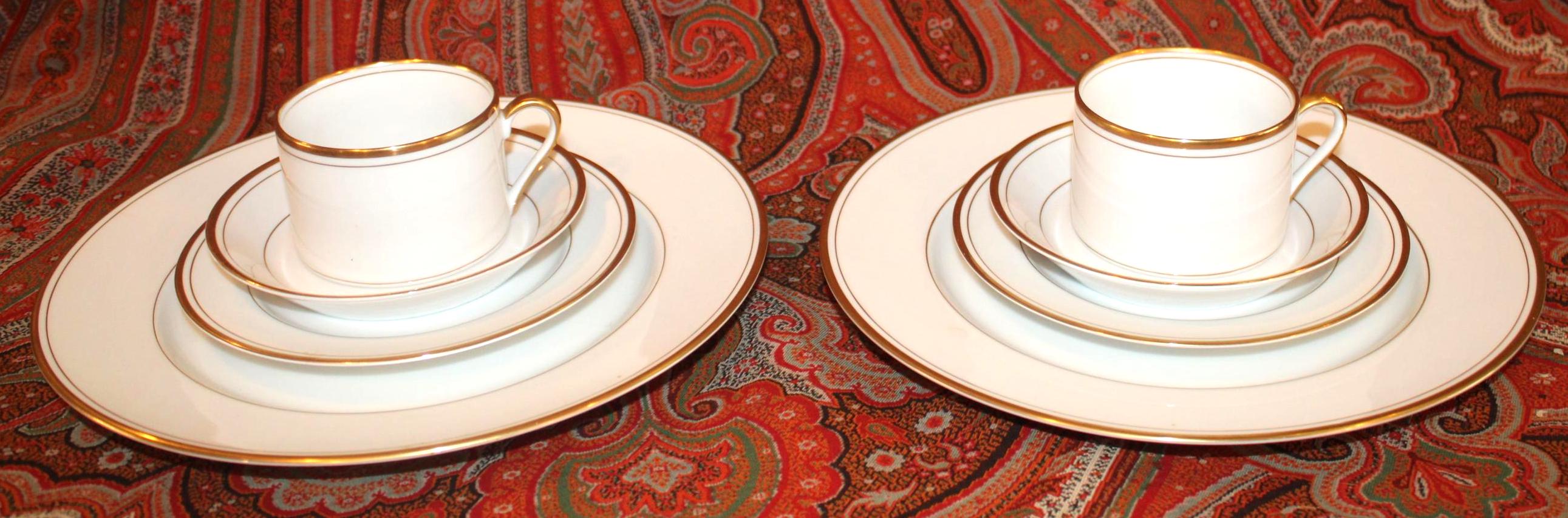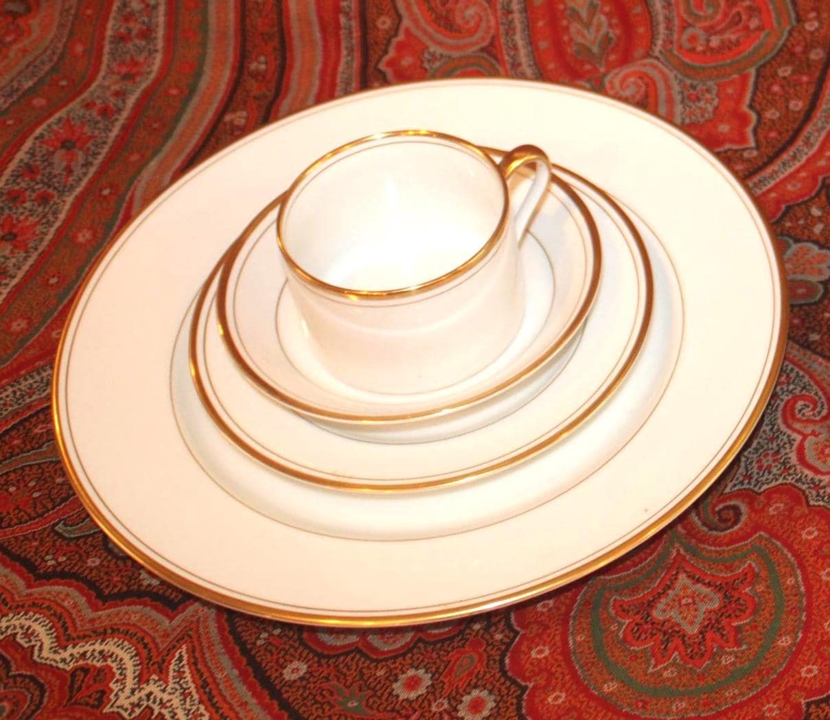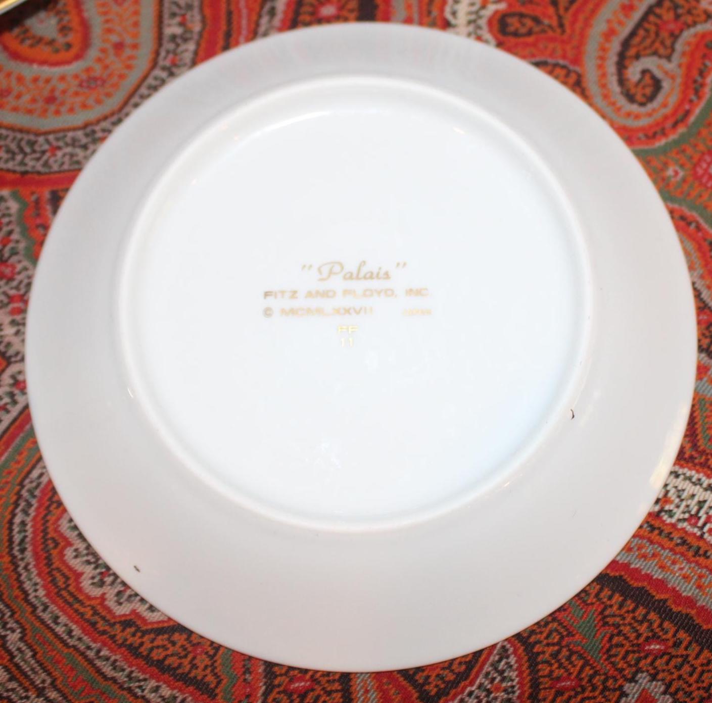This Fitz & Floyd "Palais" place setting is so simple and gorgeous- perfect for your holiday table! Included is a 10 inch Dinner Plate, a 6 1/2 inch Bread Plate and a Cup and Saucer. There are no chips or cracks, the gold gilt is in excellent condition. We have two place settings available; the price is for one set. Please message us if you have any questions- Thanks for looking!