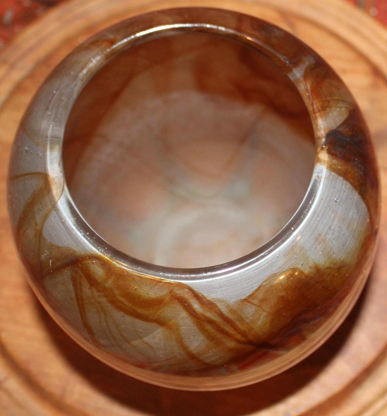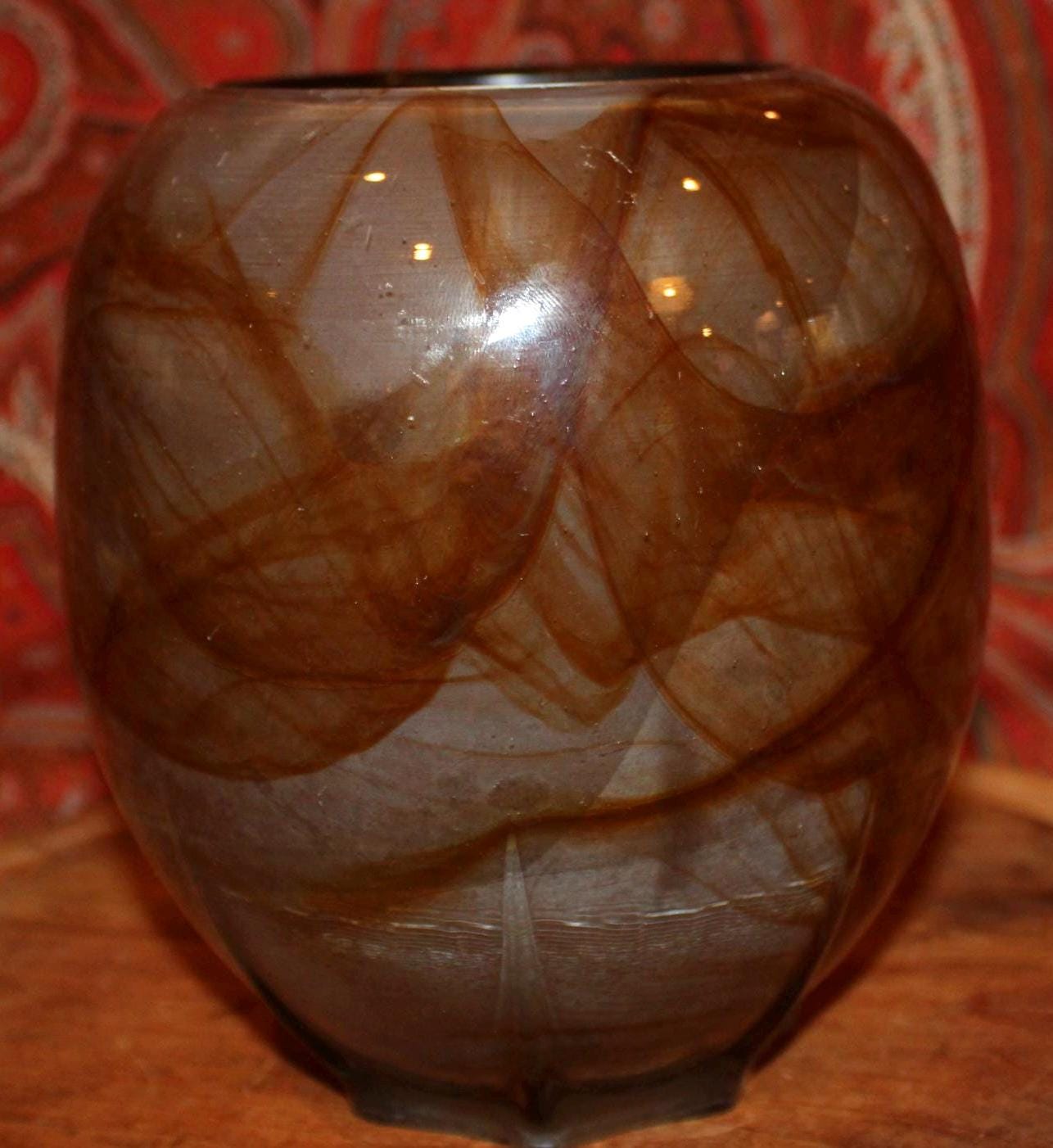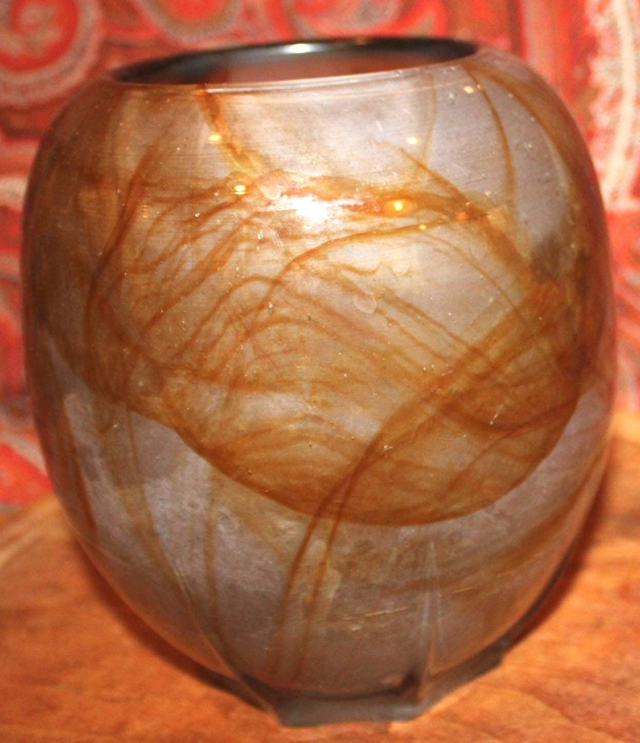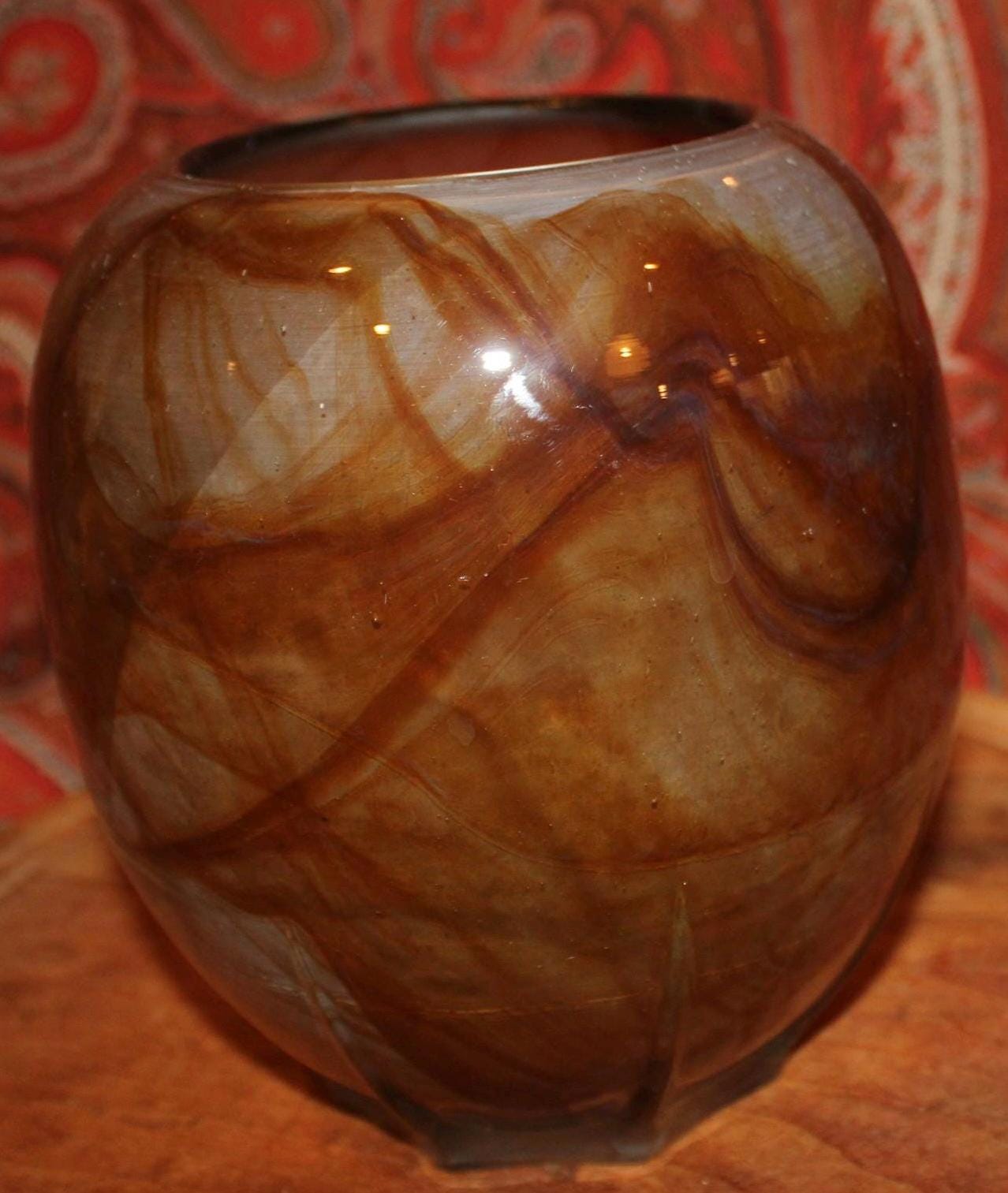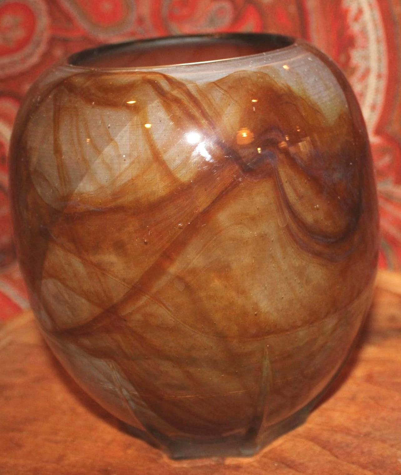 This Midcentury Modern Unsigned Swirled Butterscotch Art Glass Vase is fantastic- it’s sleek design will add a refined element to your decor! It measures 6.5" tall x 5.5" in diameter with no cracks or chips; it does have wear and scratching on the underside base which is reflective of its age. Please message us if you have any questions- Thanks for looking!