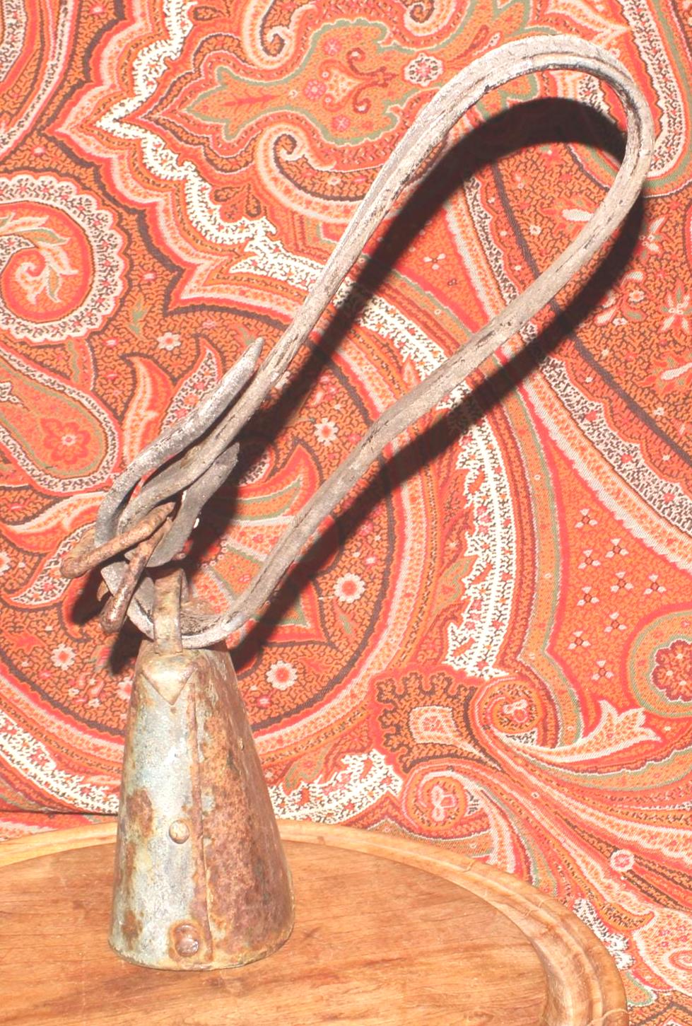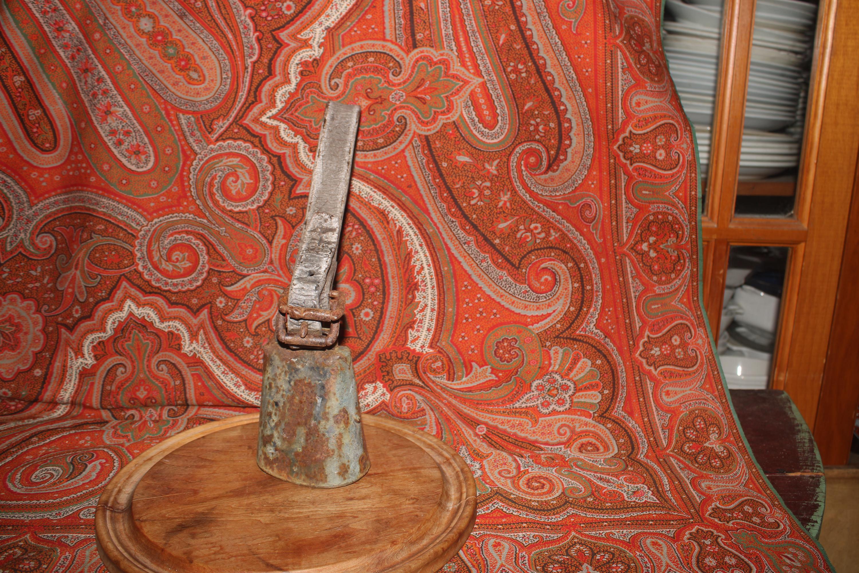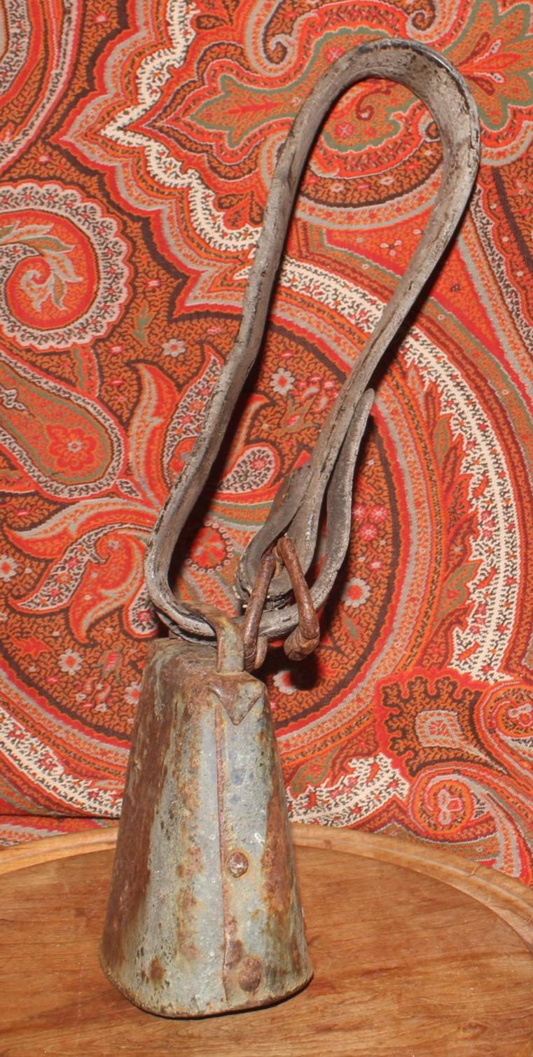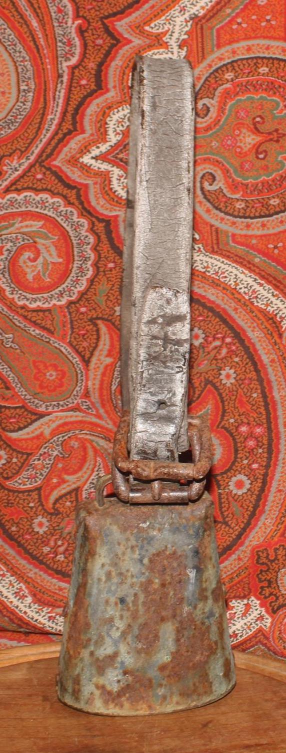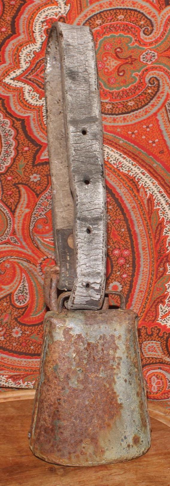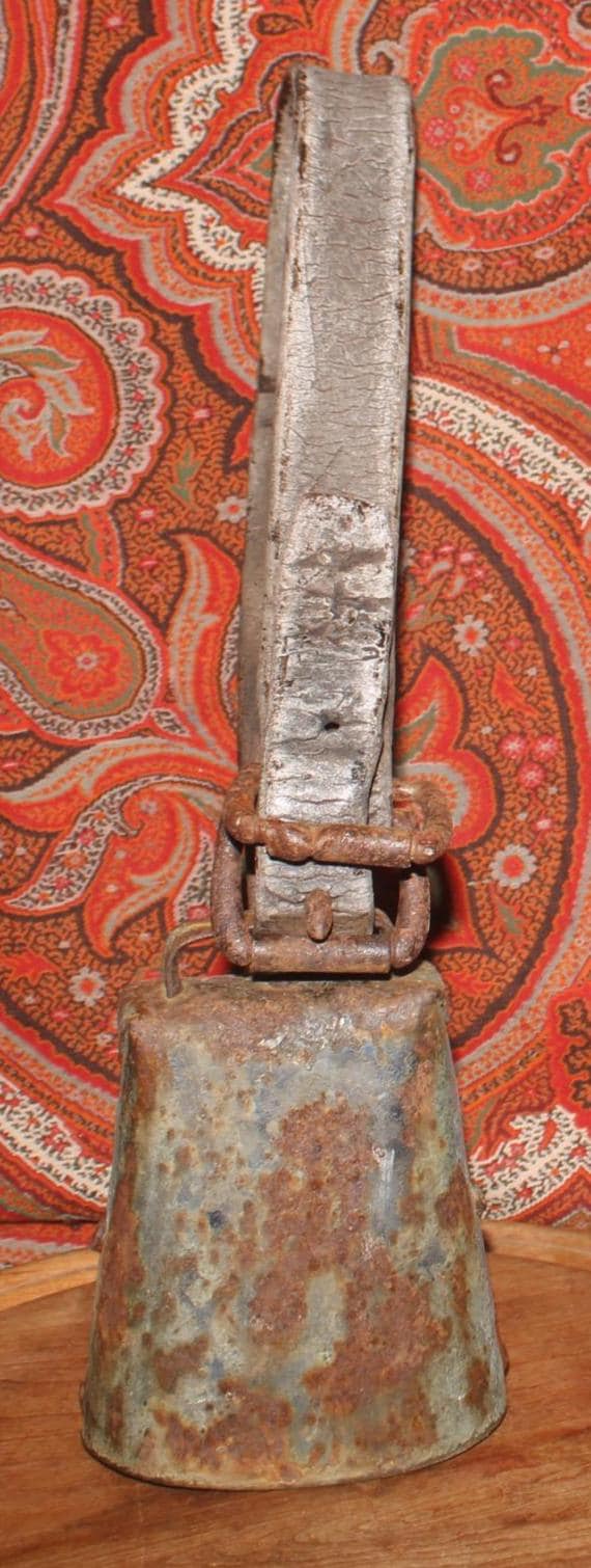 This Old Iron Goat/Cow Bell with the Original Leather Collar would be such a great addition to your country decor! The bell is about 5" tall x 3.75" wide at the base, the leather strap is about 22" inches (extends 9.5" from the bell when doubled) The metal bell and buckle exhibit a rusted patina consistent with their age and previous use-perfect primitive decor! Please message us if you have any questions- Thanks for stopping in!