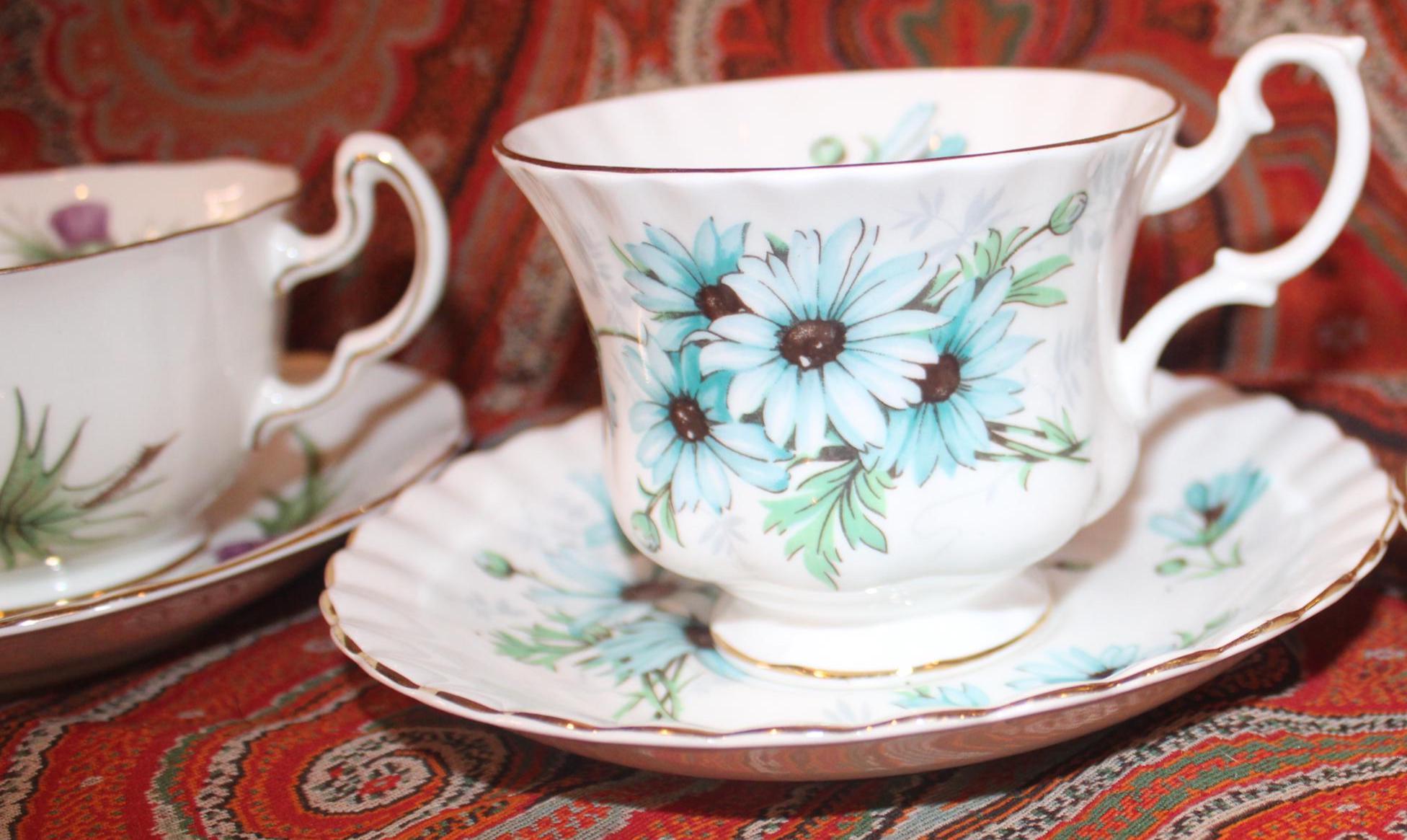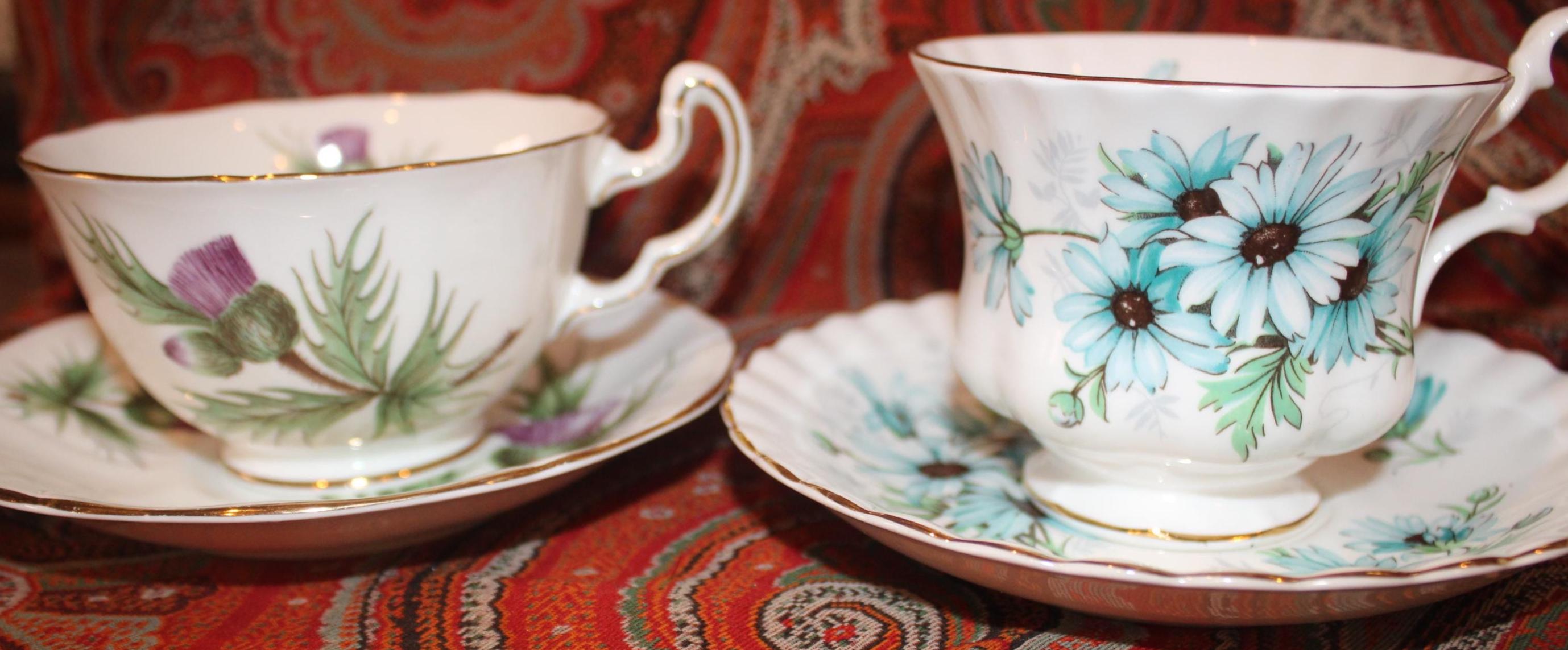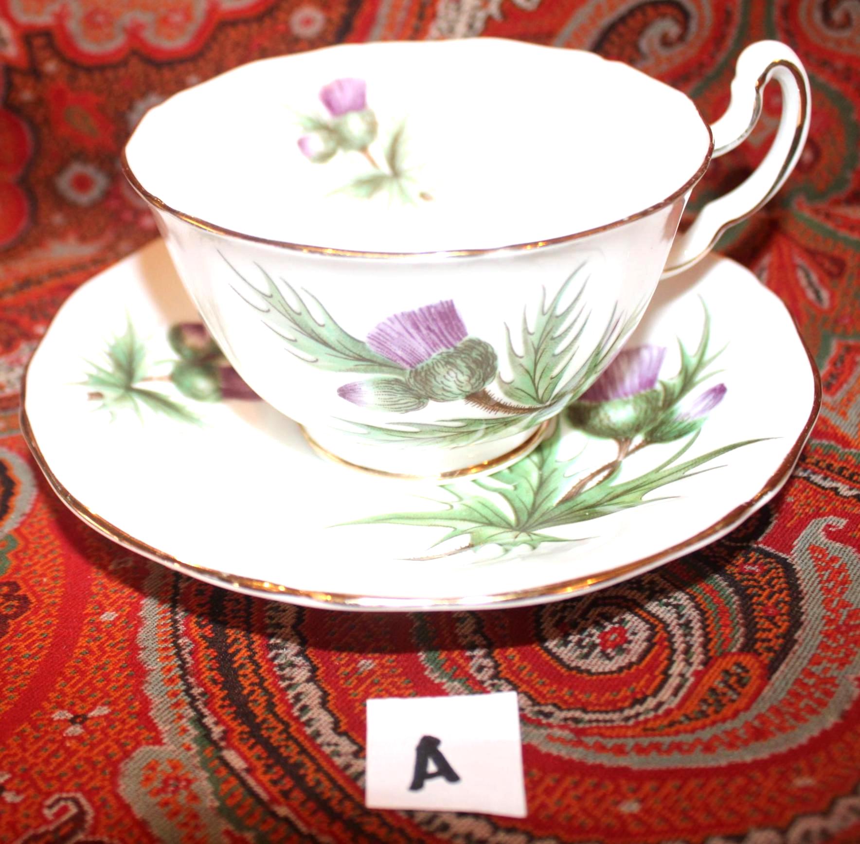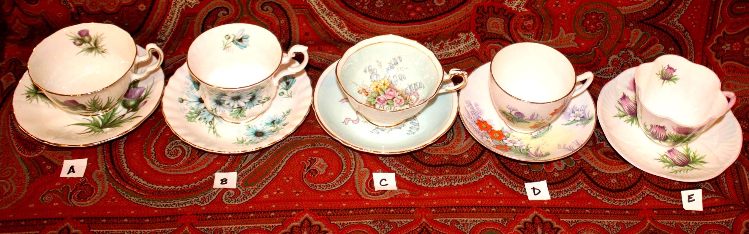 Teacups: Adderley"Thistle", Royal Albert"Marquerite",Paragon Powder Blue"Mother", Royal Vale, or Shelley "Thistle"-Bone China/England