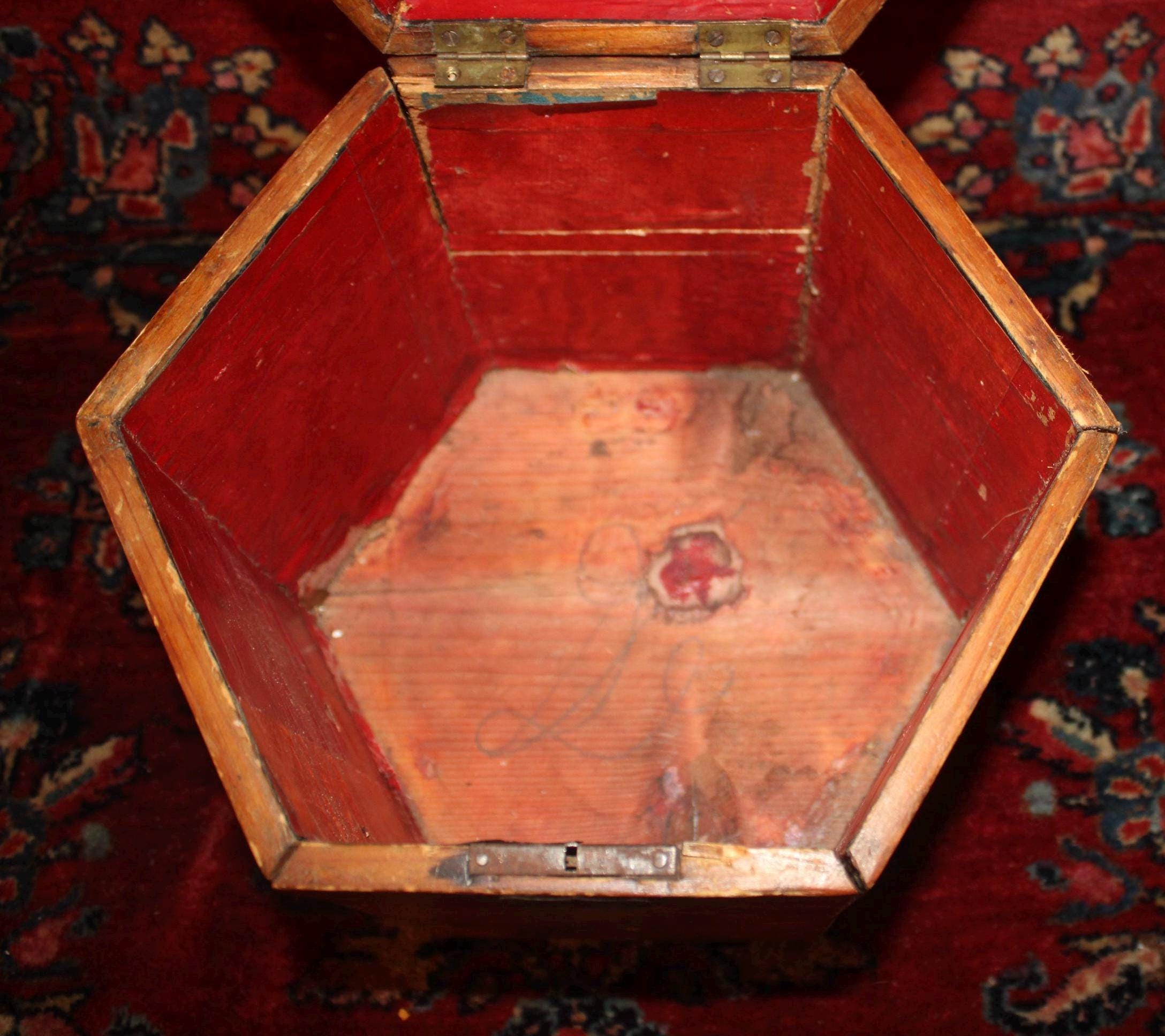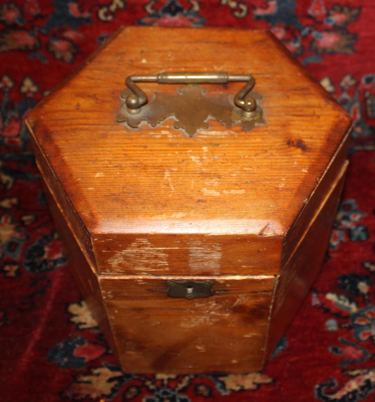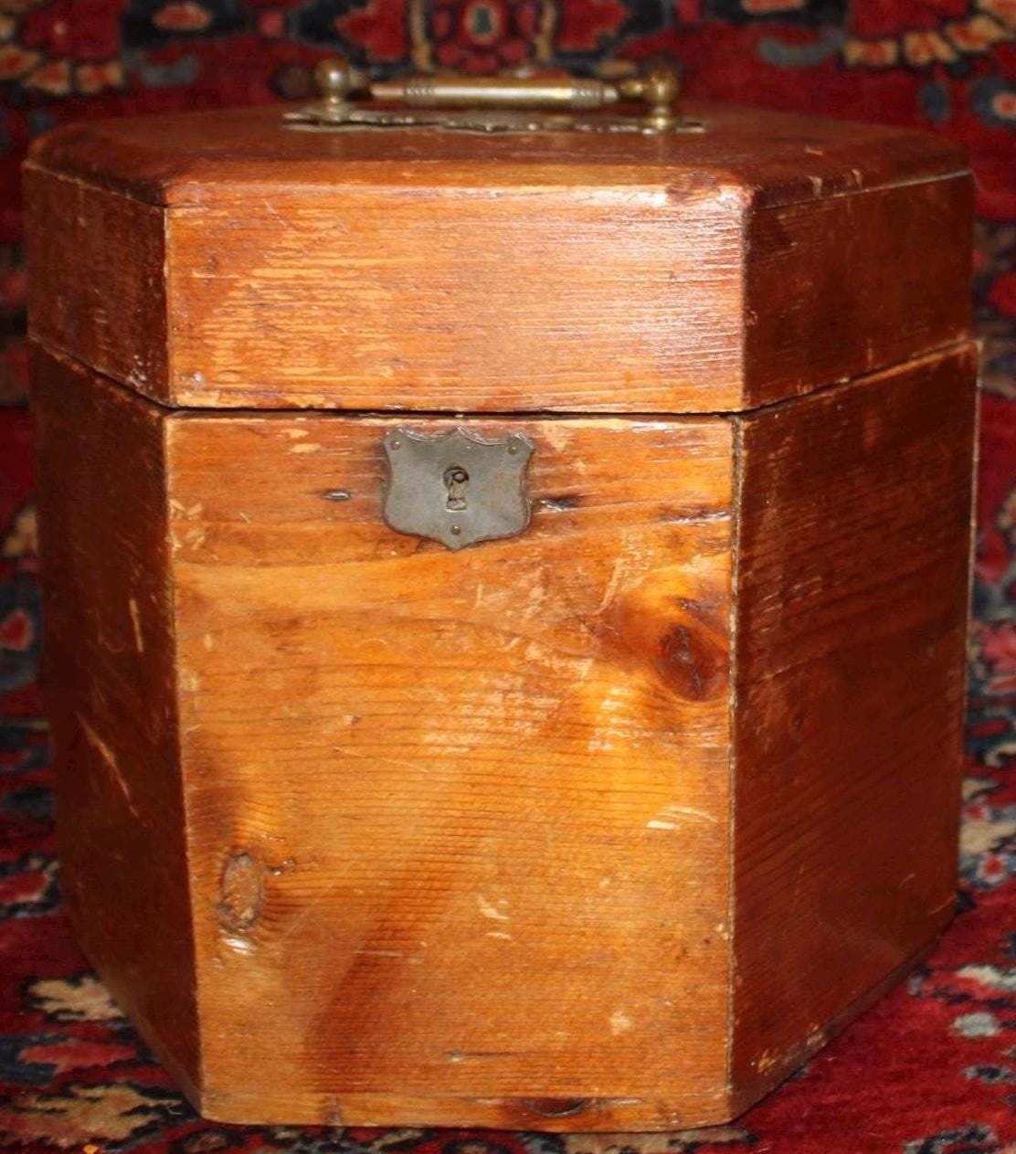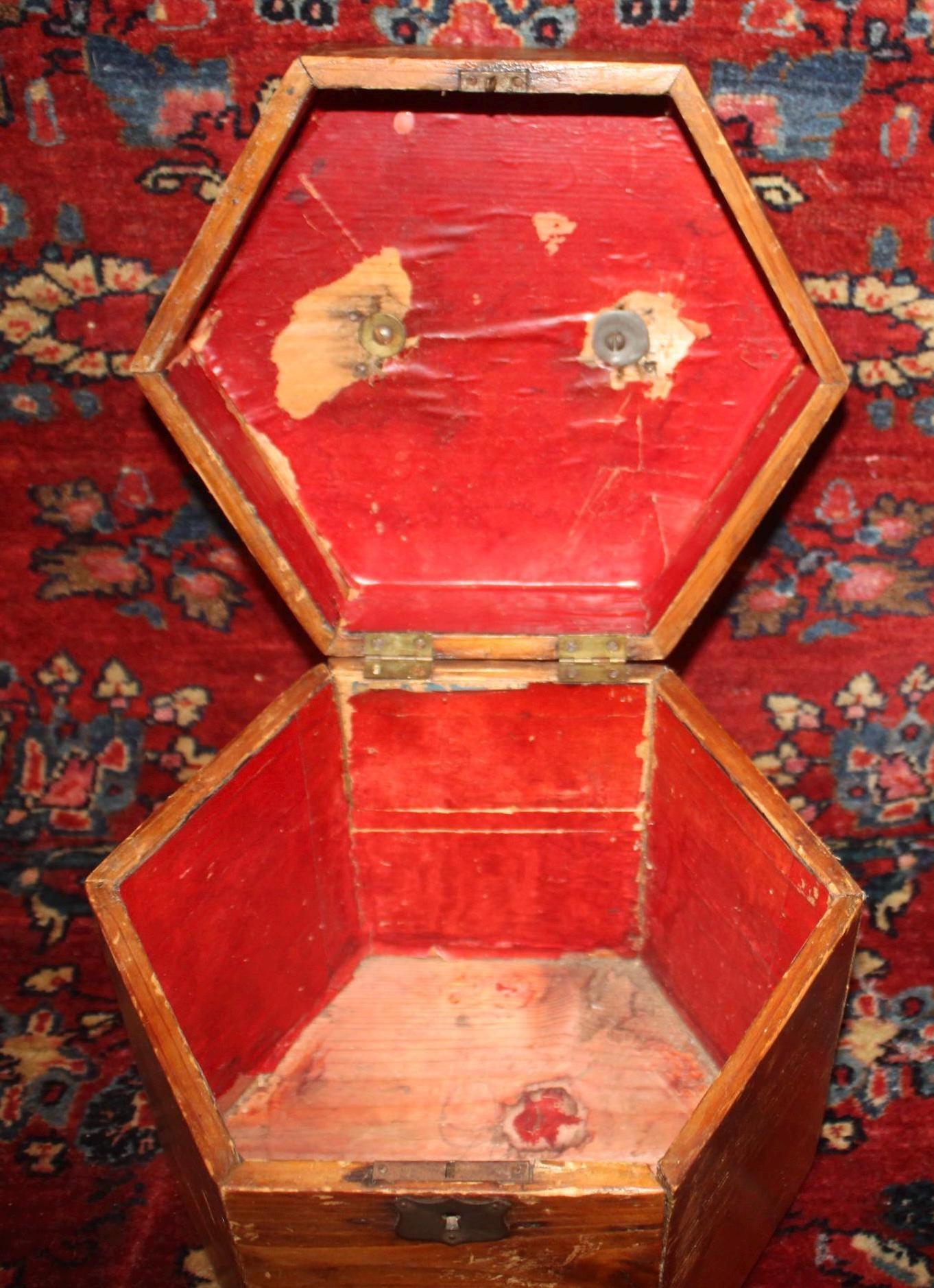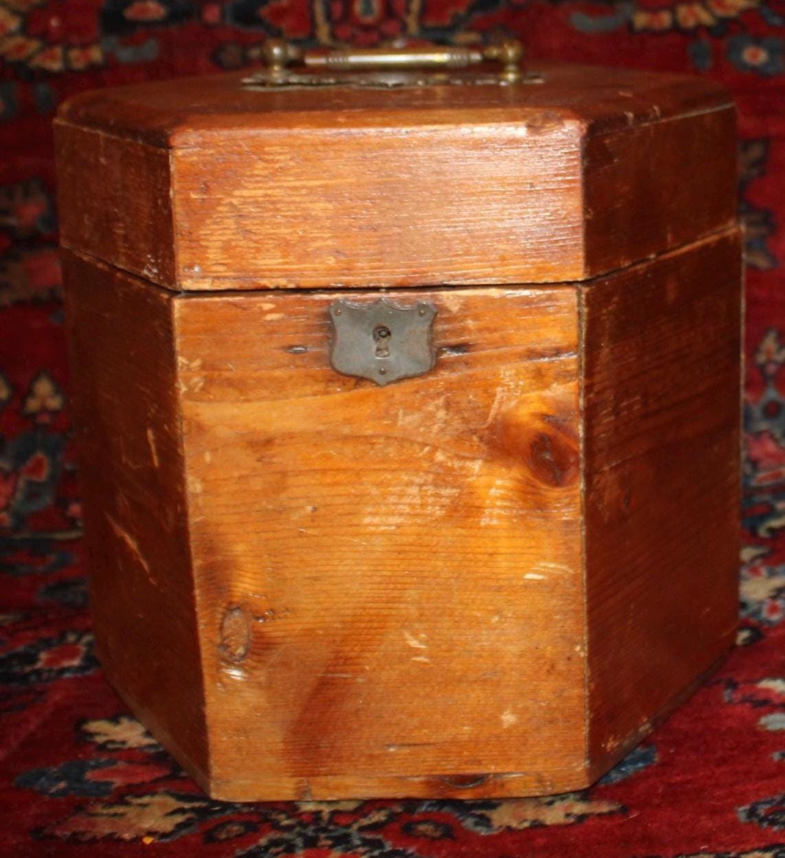 This Vintage Pine Hexagonal Box would be great for storage! Originally made to carry a concertina- the box measures 8.5" in diameter x 8.25" in height. It retains its original brass hardware- handle, hinges, and lock (no key)- with a nice red papered interior (there are some tears to the interior paper- please see our photos). The rich rustic patina of the pine is gorgeous- a perfect piece to add to your farmhouse decor! Please message us if you have any questions- Thanks for looking!