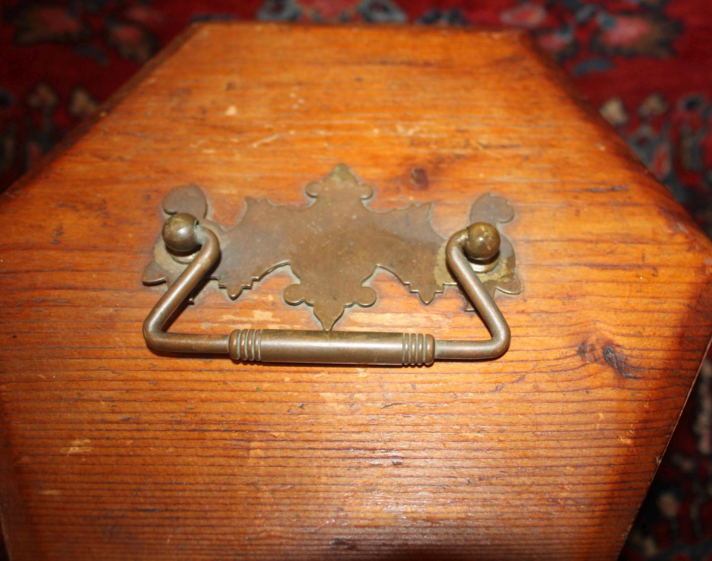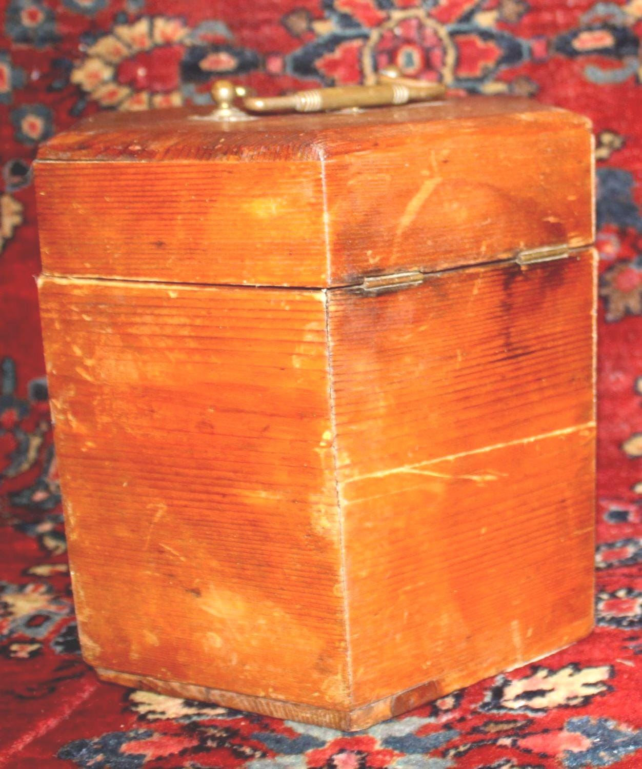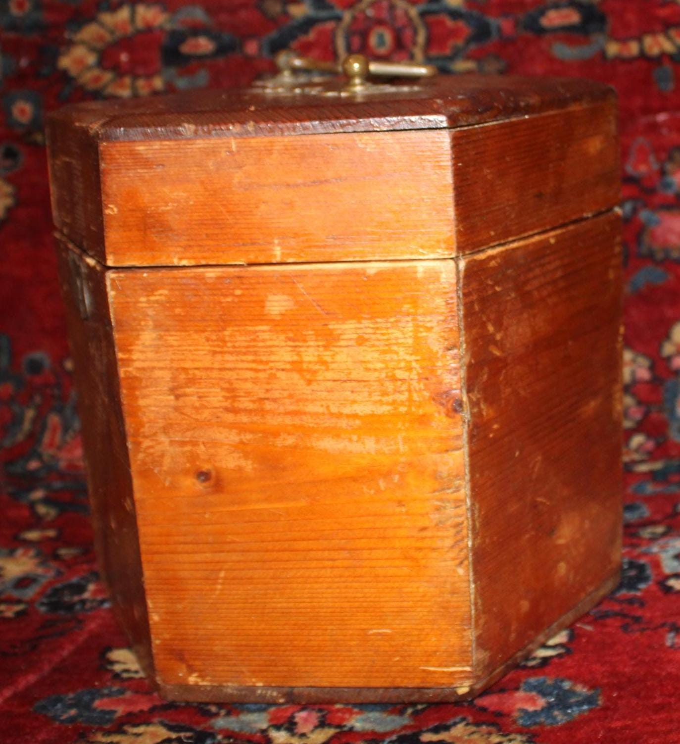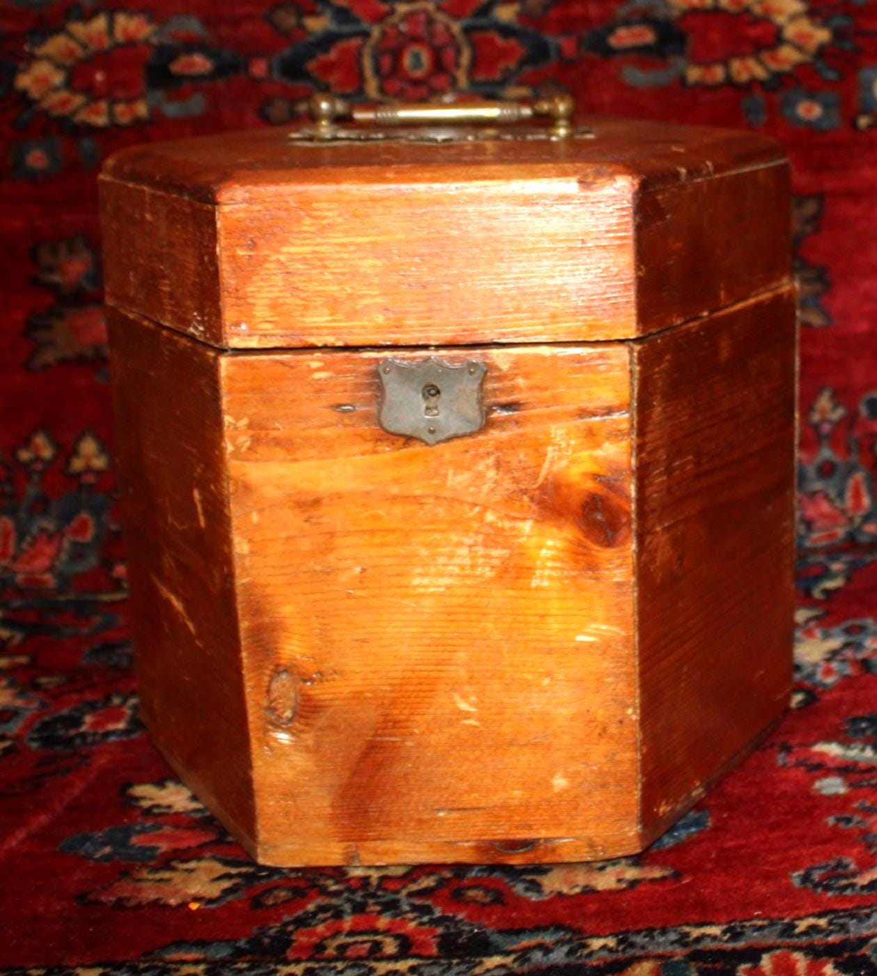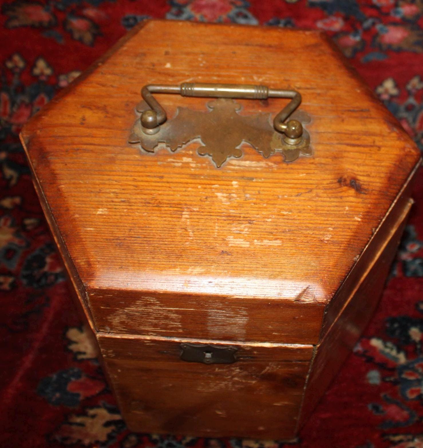 This Vintage Pine Hexagonal Box would be great for storage! Originally made to carry a concertina- the box measures 8.5" in diameter x 8.25" in height. It retains its original brass hardware- handle, hinges, and lock (no key)- with a nice red papered interior (there are some tears to the interior paper- please see our photos). The rich rustic patina of the pine is gorgeous- a perfect piece to add to your farmhouse decor! Please message us if you have any questions- Thanks for looking!