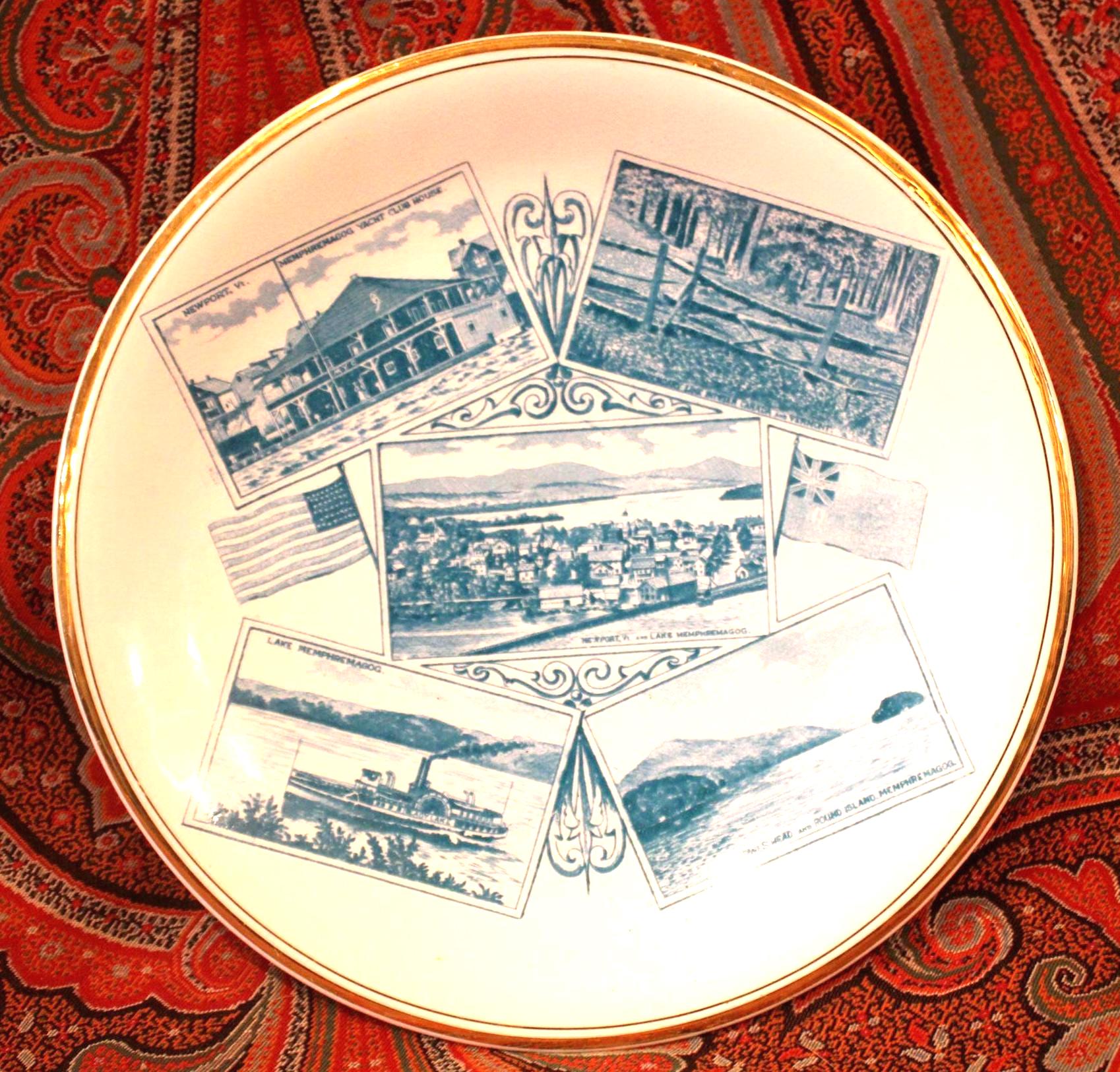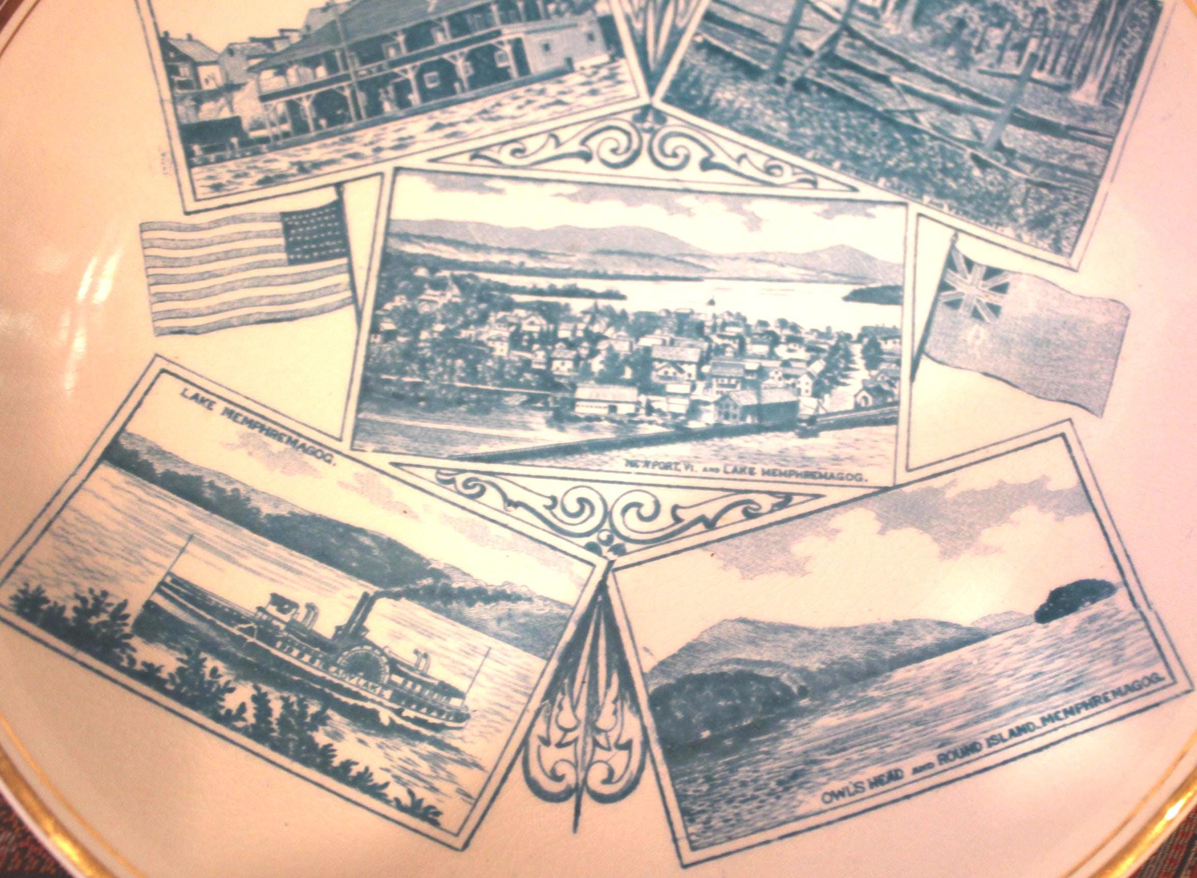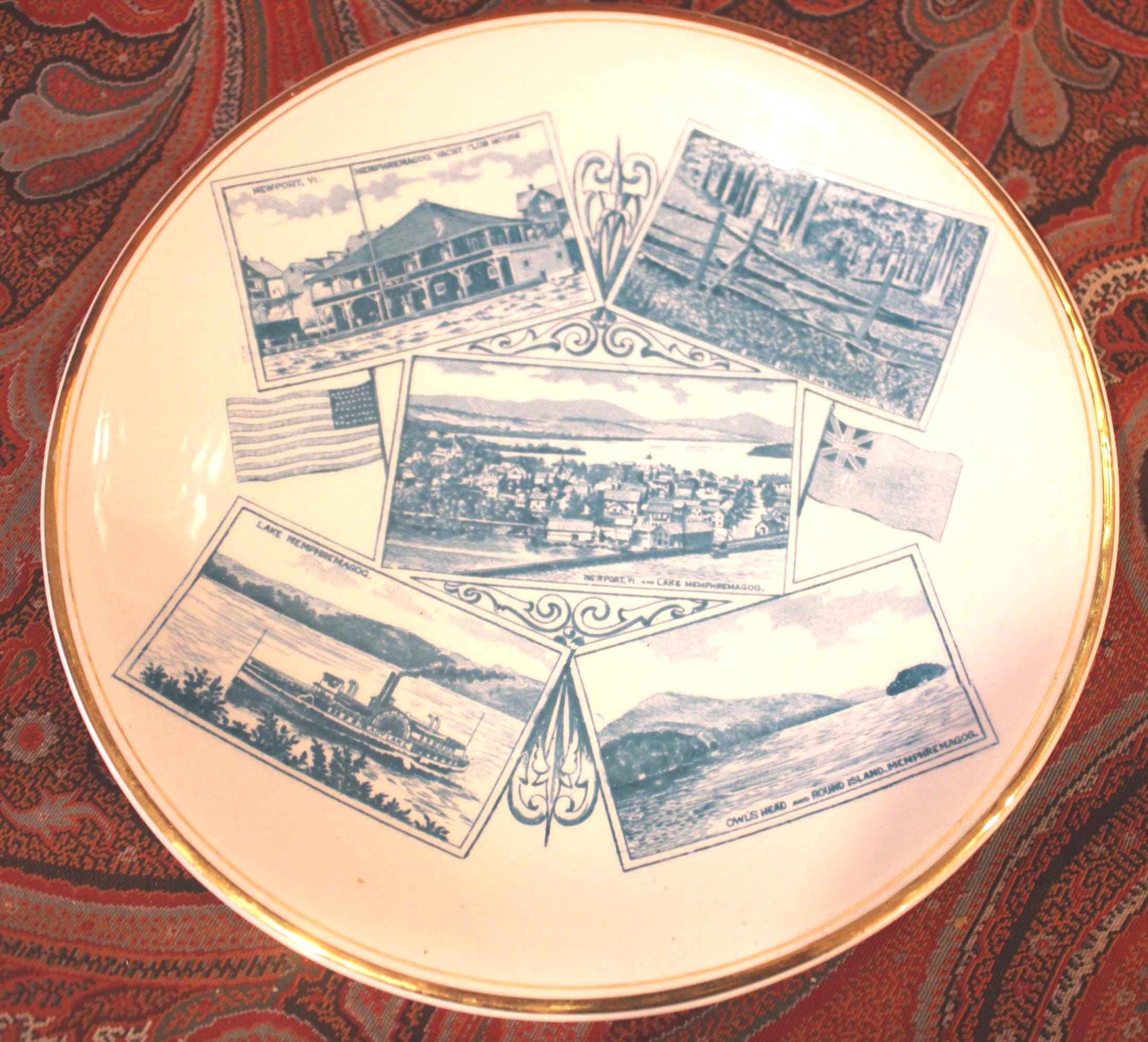 Newport Vermont Souvenir Plate for True and Blanchard Co. by Harker's- Memphremagog, Owl's Head, Round Island- Historical Plate