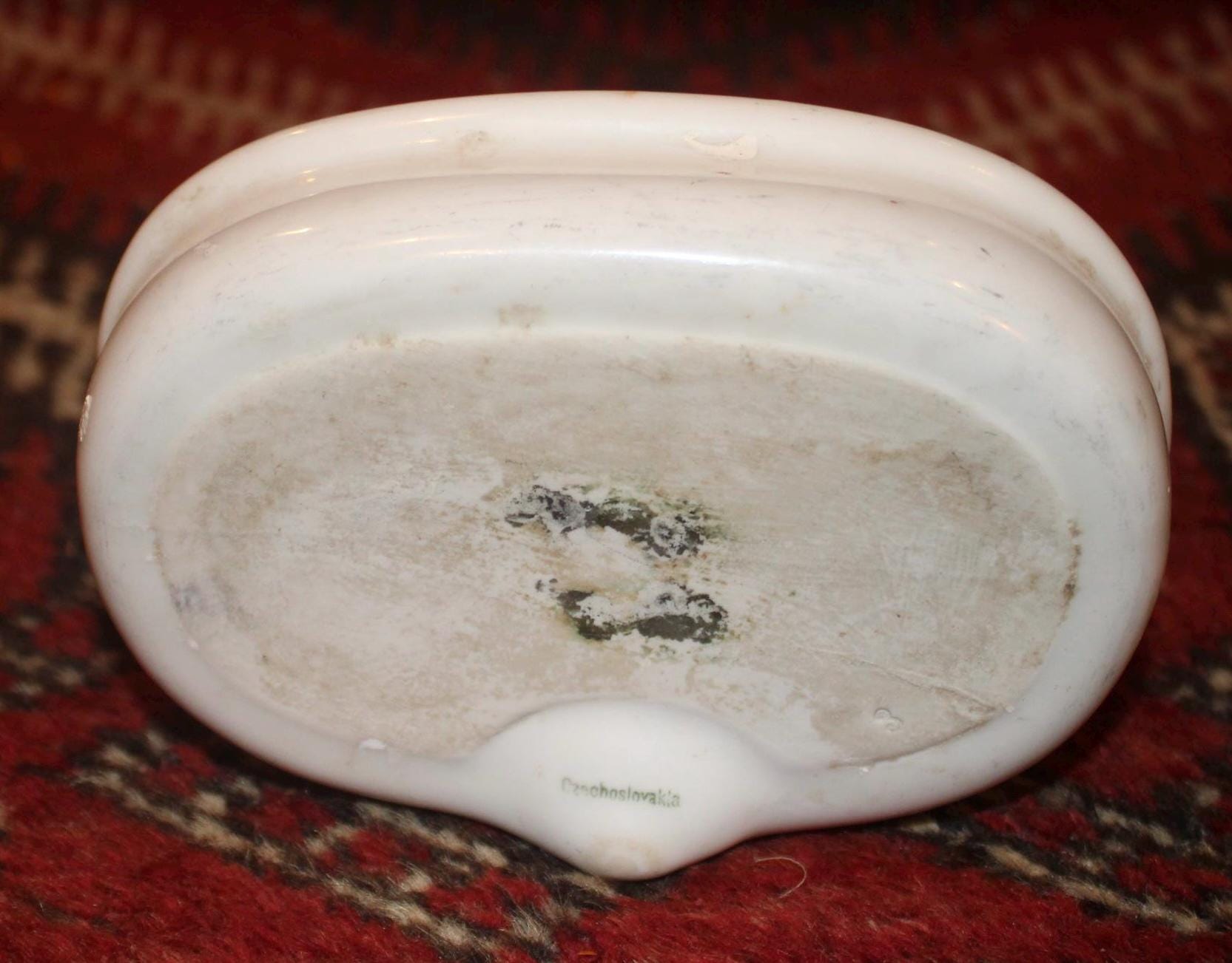 This Ironstone Czechoslovakia Soap dish would be a great addition to any bathroom, kitchen, or laundry room. It does not lay flat- It measures 5.5"x 3.75"; the depth is 1 5/8" with a 1.75" depth on the drainage side. There are no chips, cracks, or discoloration.