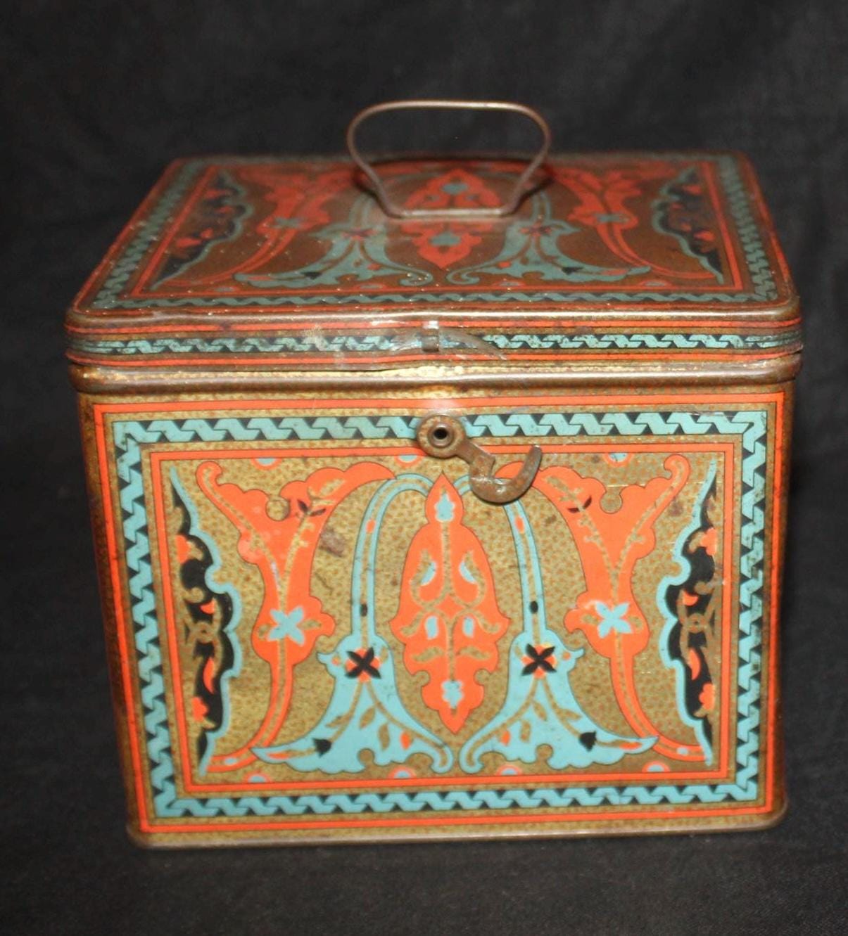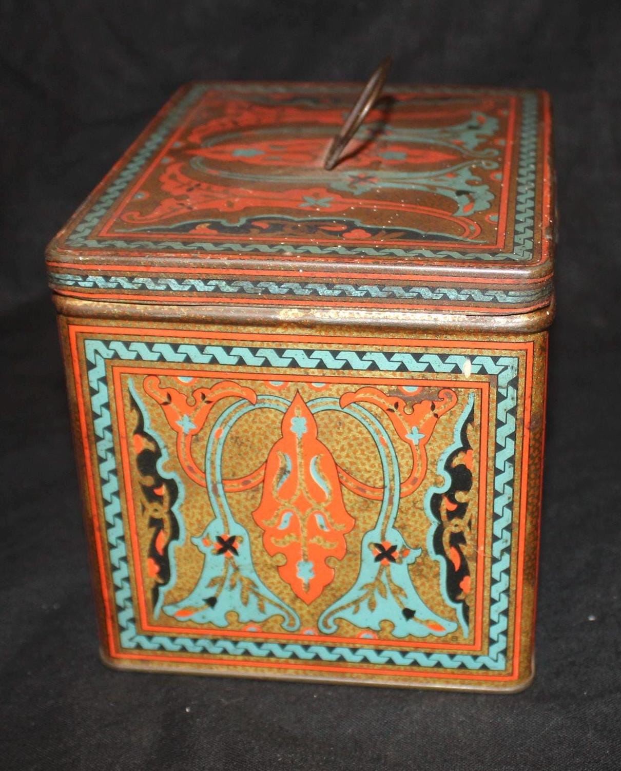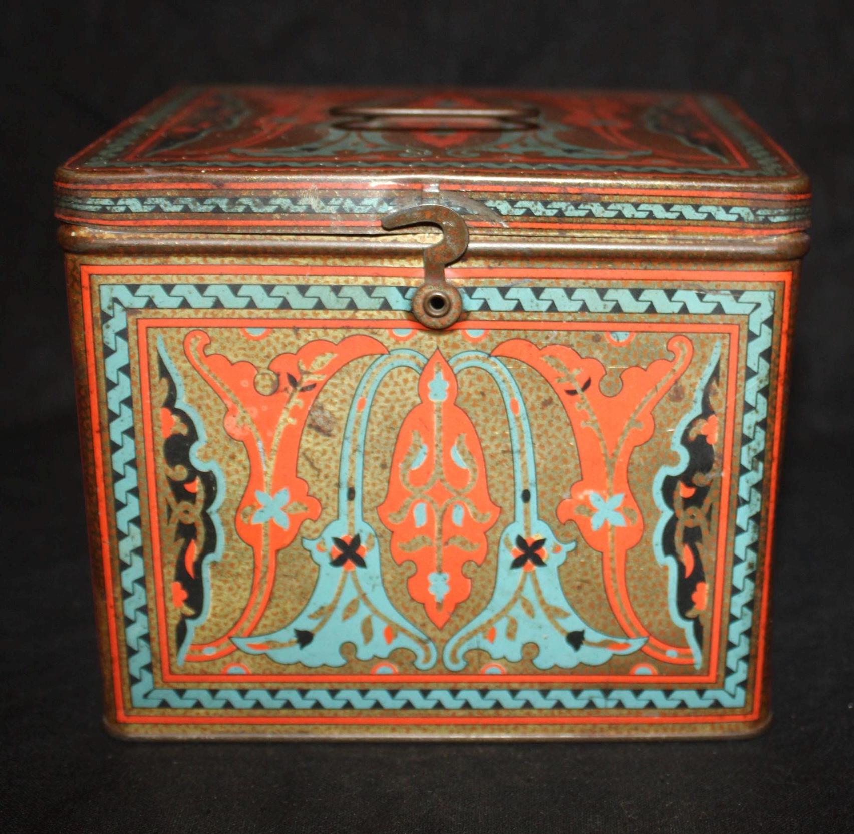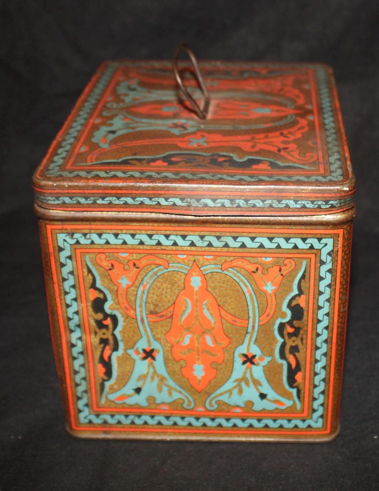 This Antique Nabisco Cookie Cracker Company Tin is stunning with a gorgeous art nouveau lithographed body in turquoise blue, gold, black, and red. It measures 5.75" x 4.75" x 4.5" and has little wear- the hinges, handle , and latch are all in great condition. Please message us if you have any questions- Thanks for looking!