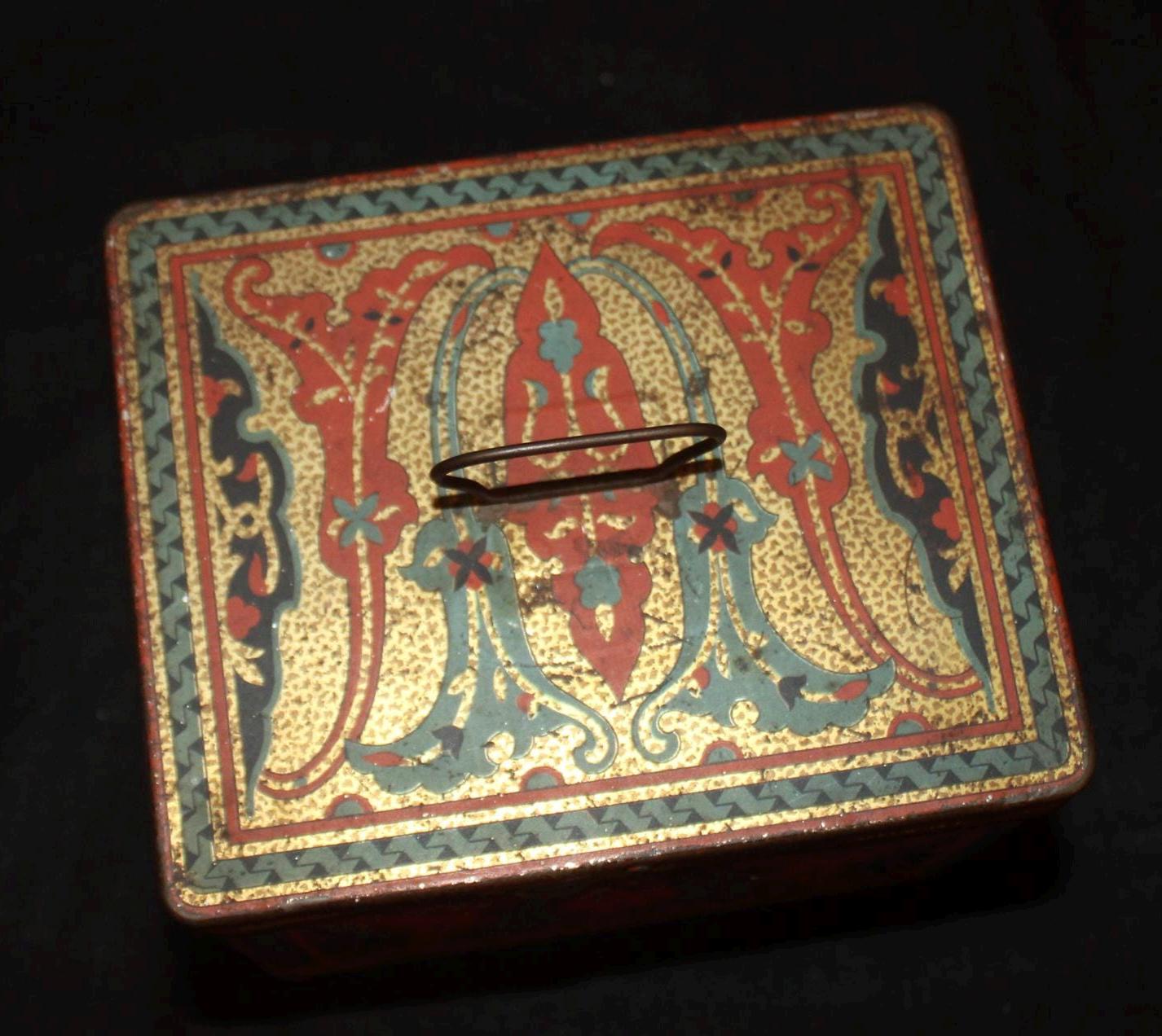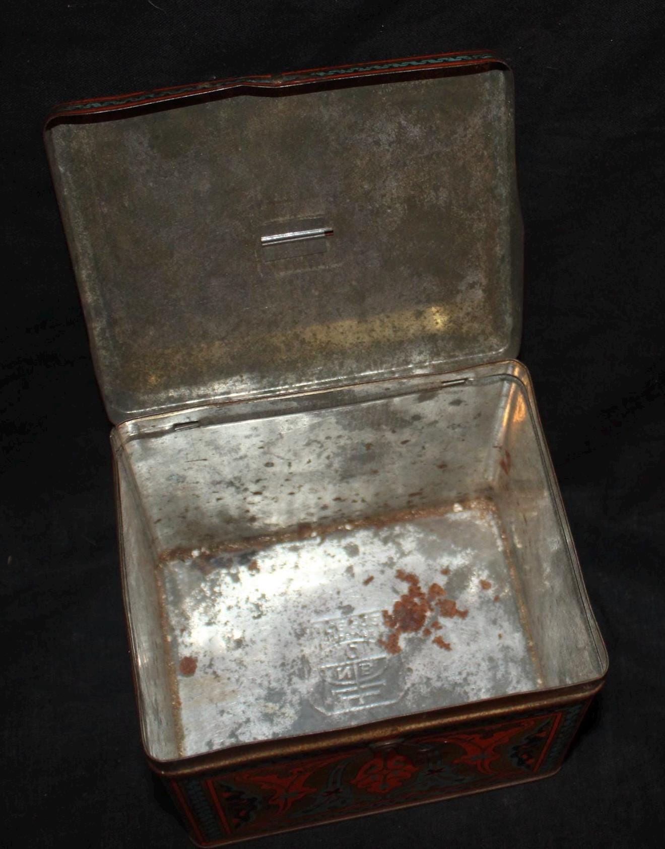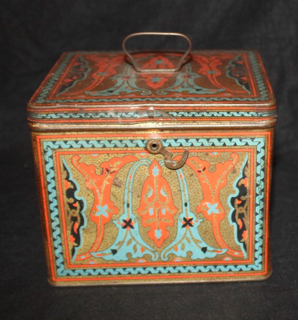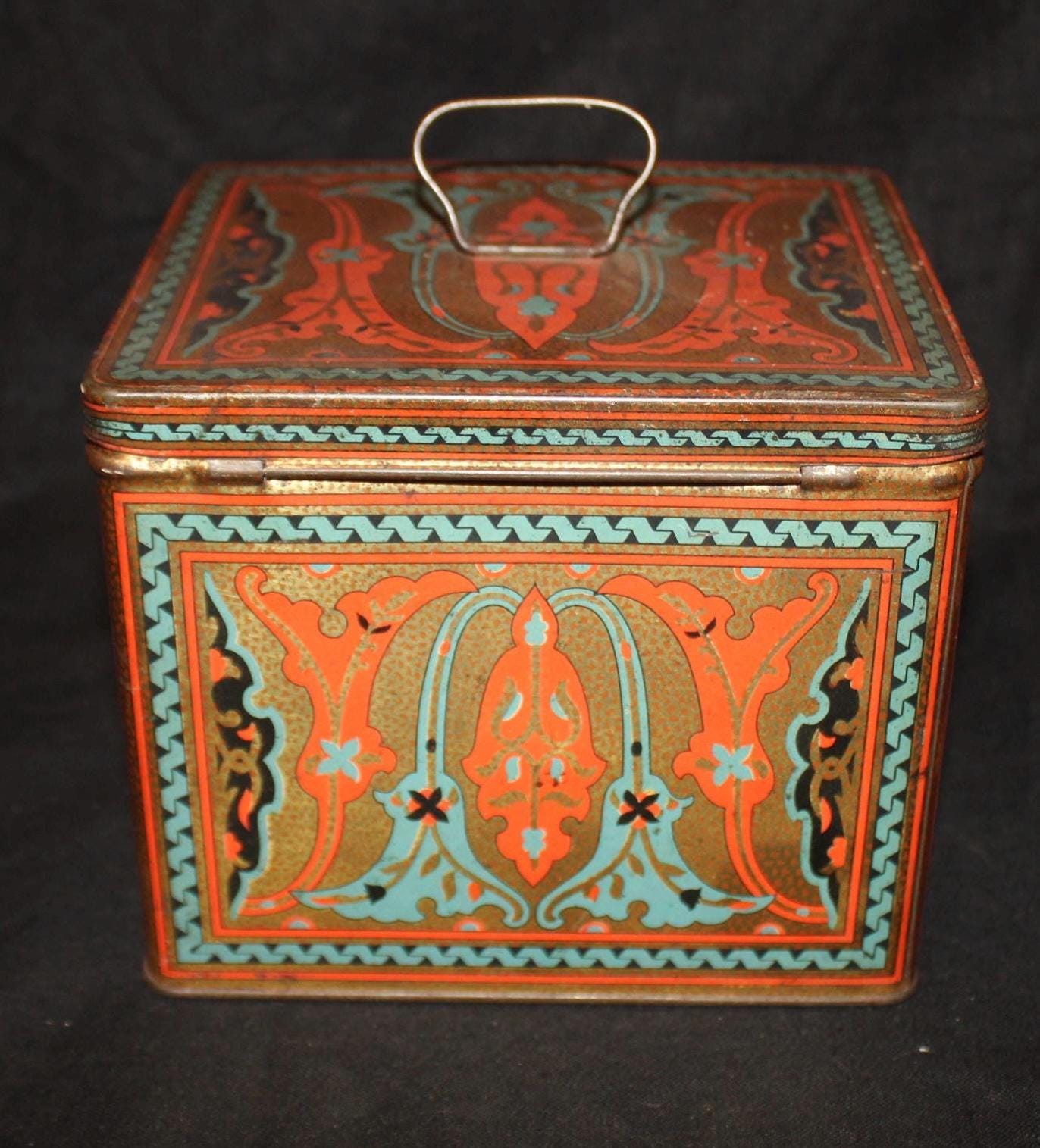 This Antique Nabisco Cookie Cracker Company Tin is stunning with a gorgeous art nouveau lithographed body in turquoise blue, gold, black, and red. It measures 5.75" x 4.75" x 4.5" and has little wear- the hinges, handle , and latch are all in great condition. Please message us if you have any questions- Thanks for looking!