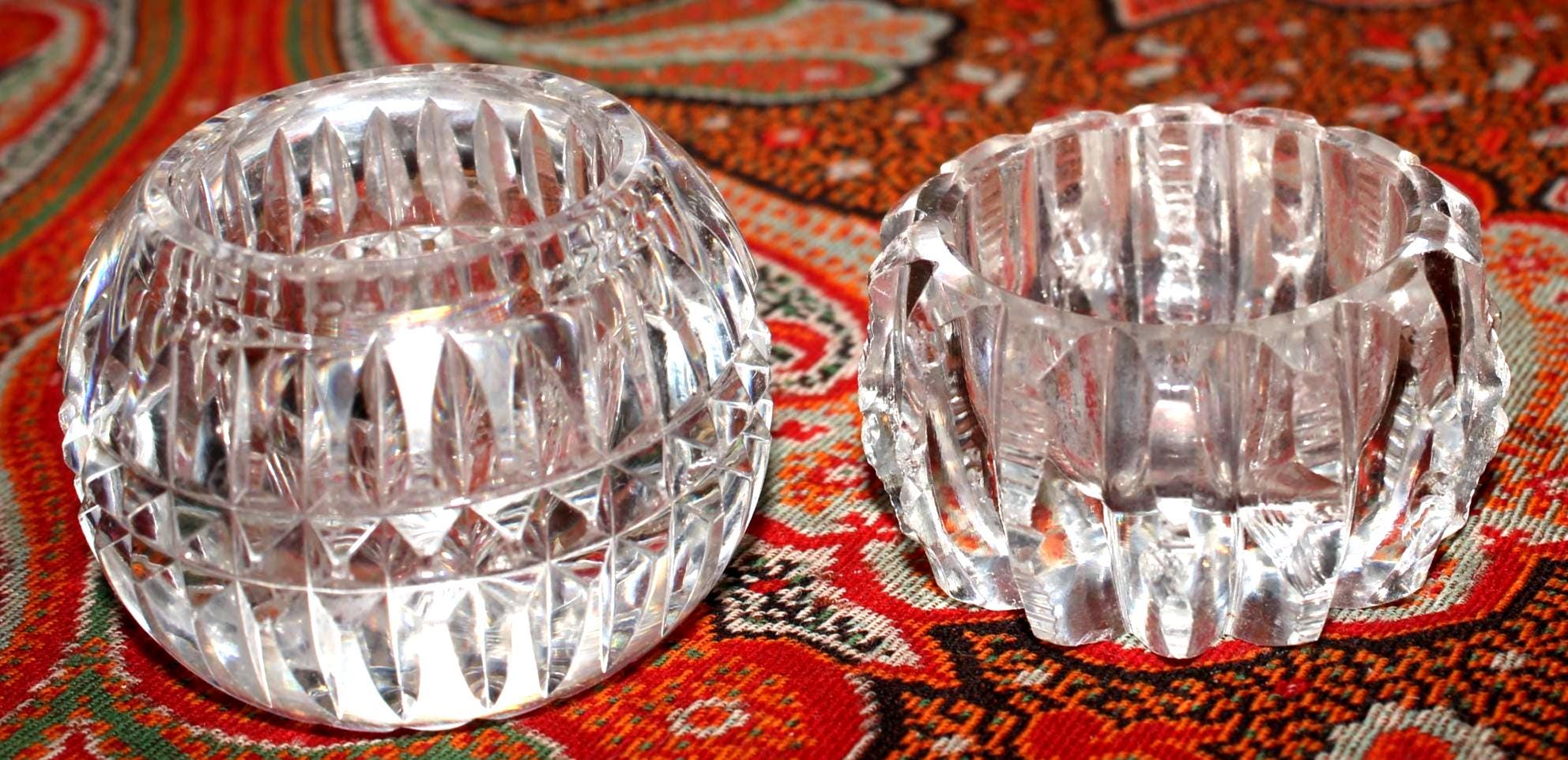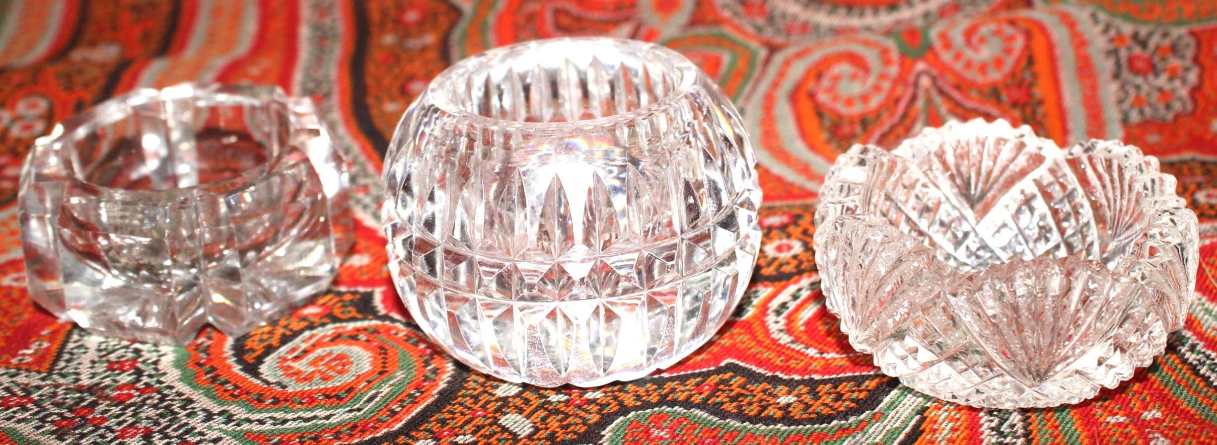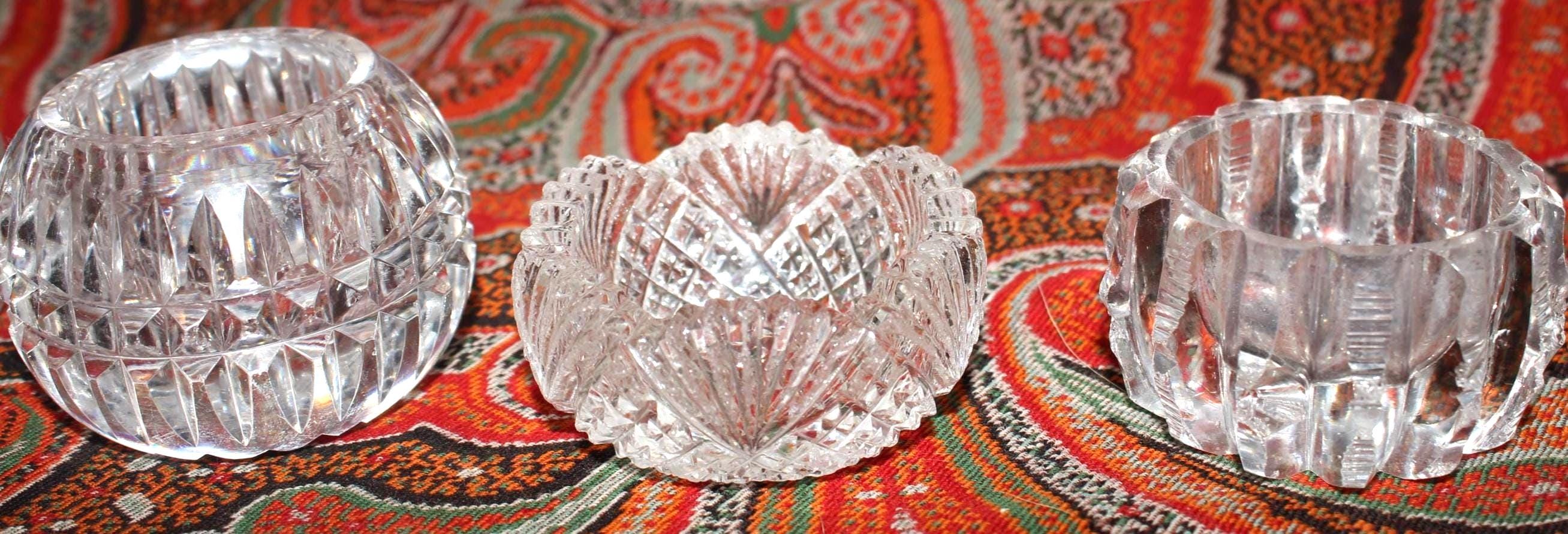 This Stunning Set of 7 Mismatched Cut Crystal Salt/Caviar Cellars would look gorgeous on your table! Each cellar is approximately 1.5" in diameter x 1" tall. There is a tiny bit of chipping when viewed under a magnifying glass. Please message us if you have any questions- Thanks for looking!