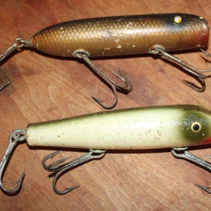 This Very Cool Vintage Hand painted wooden Heddon Head-On Basser Fishing Lure with Glass Eyes is available to you and would be such a great addition to your collection! It is marked on the metal face plate and retains its original glass eyes (one is cracked)-please see our photos. The paint is old with wear that is reflective of use (some paint loss). It is 4.25" long.