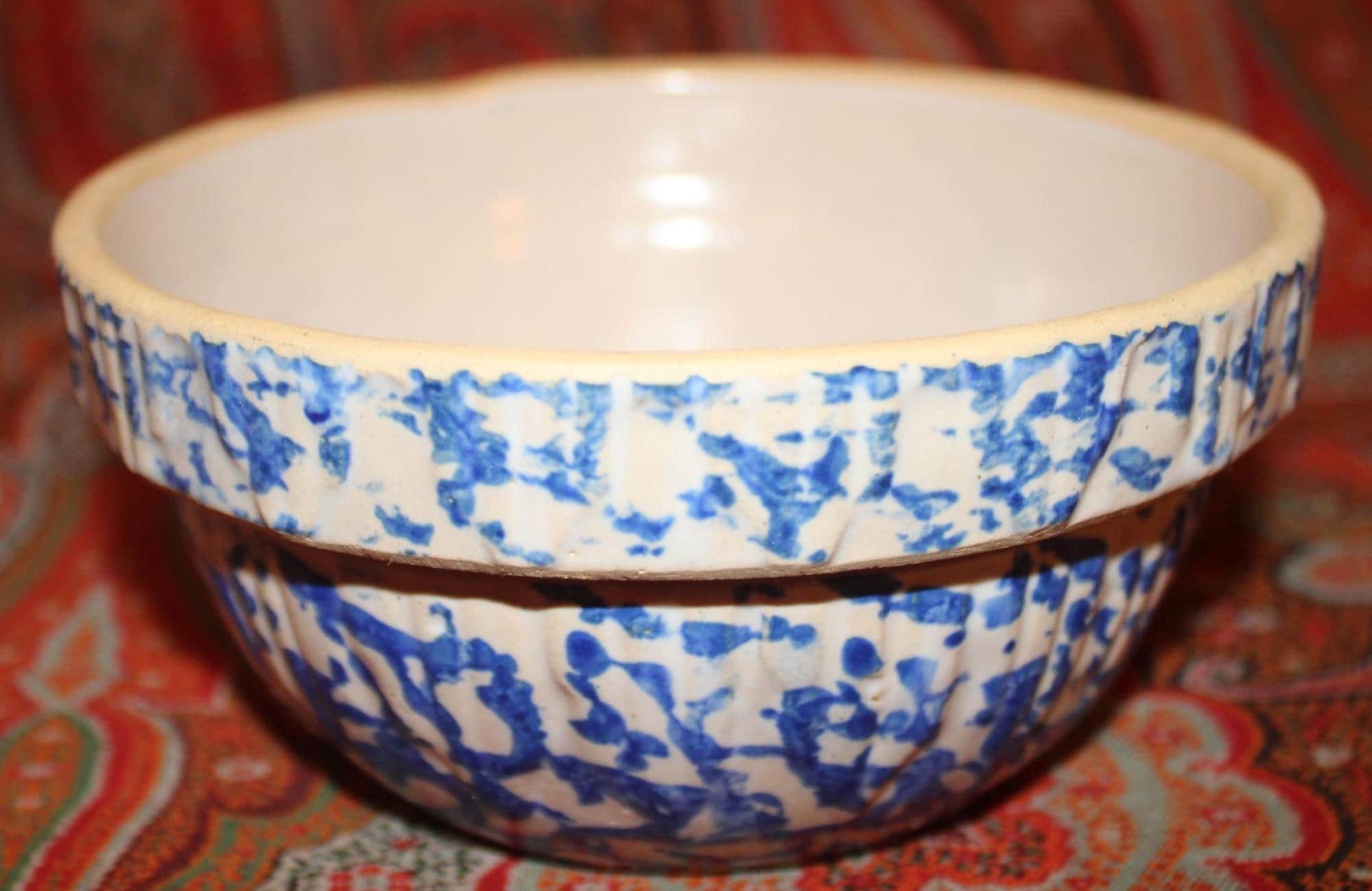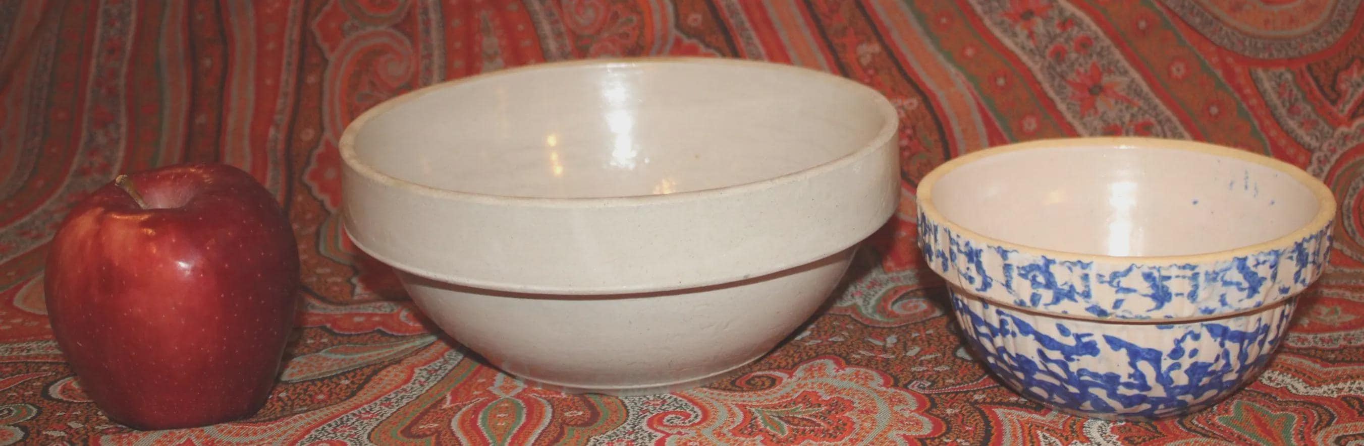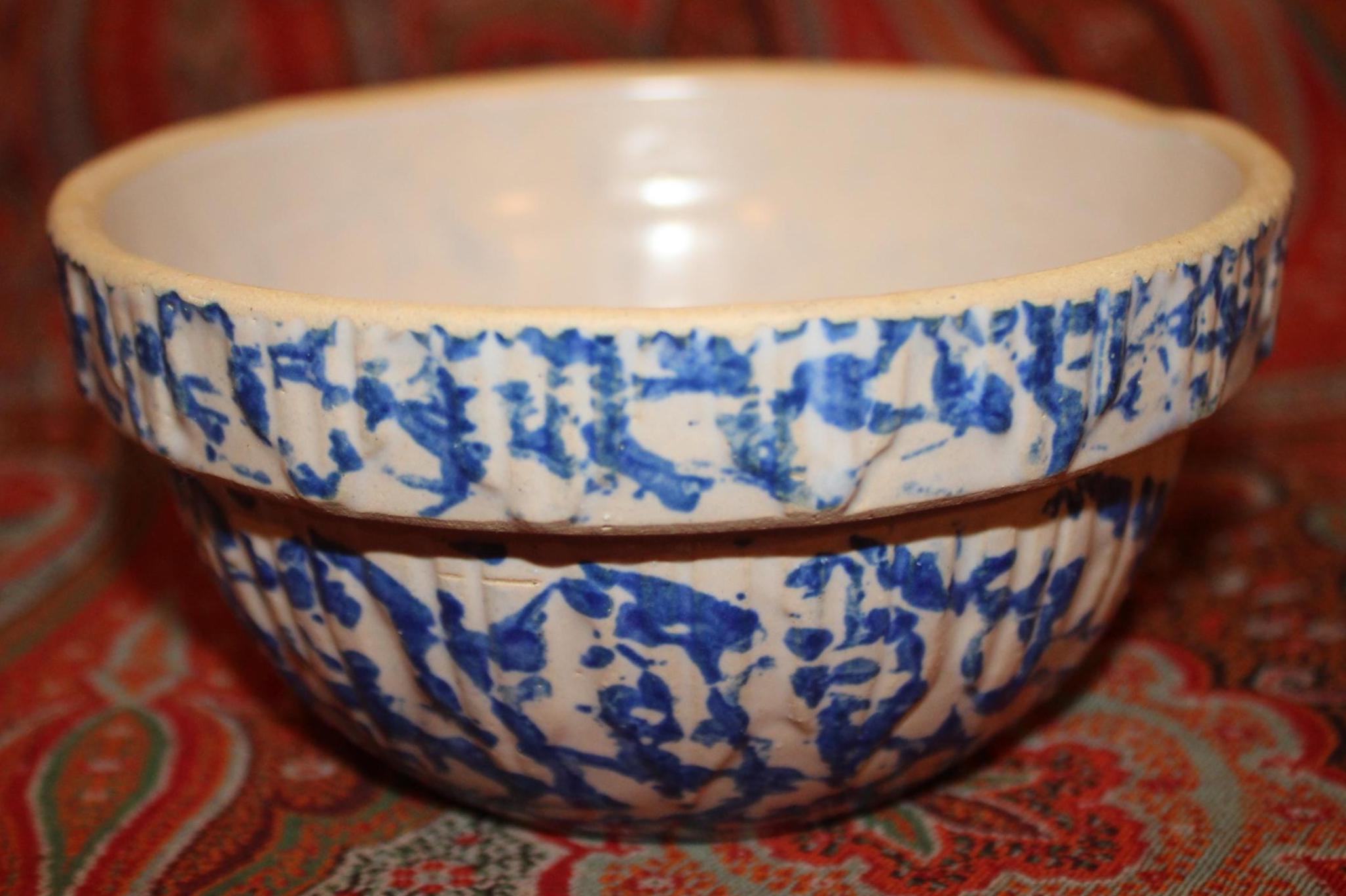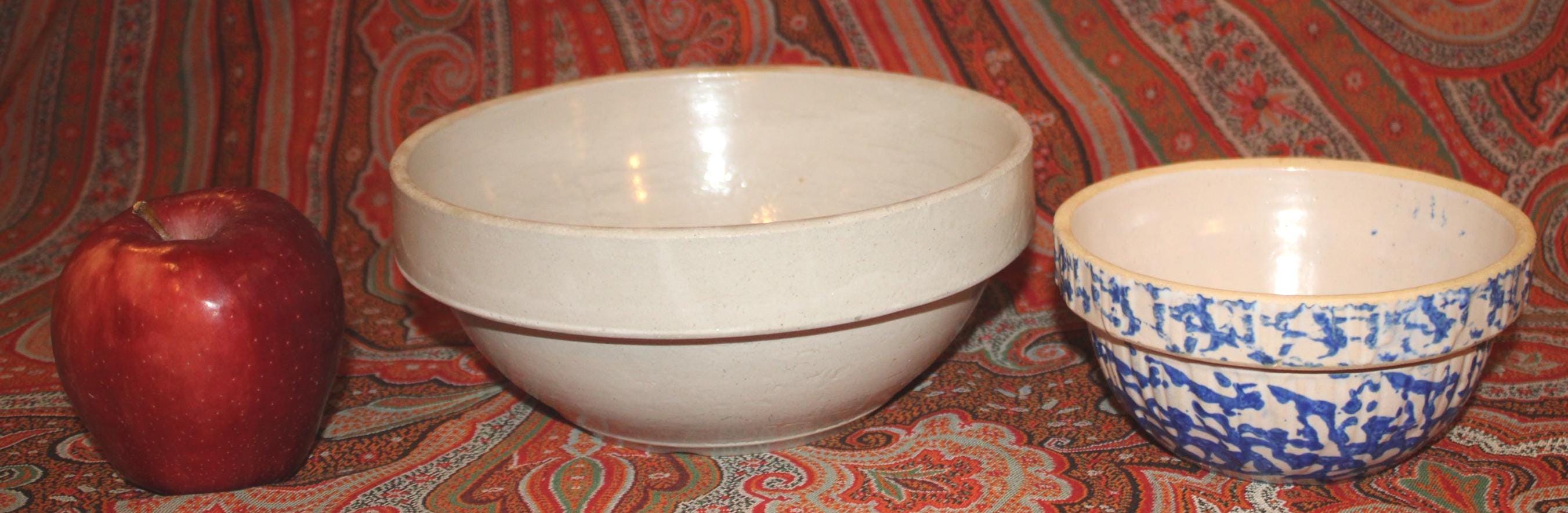 These bowls display so nicely together- we decided to sell them as a set! The larger stoneware crock mixing bowl measures 7.25" in diameter x 3" tall and holds 4 cups. The spongeware mixing bowl with gorgeous cobalt blue spatterware measures 5.25" in diameter x 2.75" tall and holds 1 cup. Both bowls are in great condition with no chips or cracks. These bowls would look great in a cottage or farmhouse kitchen- They also would look phenomenal in an industrial home! Please message us if you have any questions- Thanks for looking!