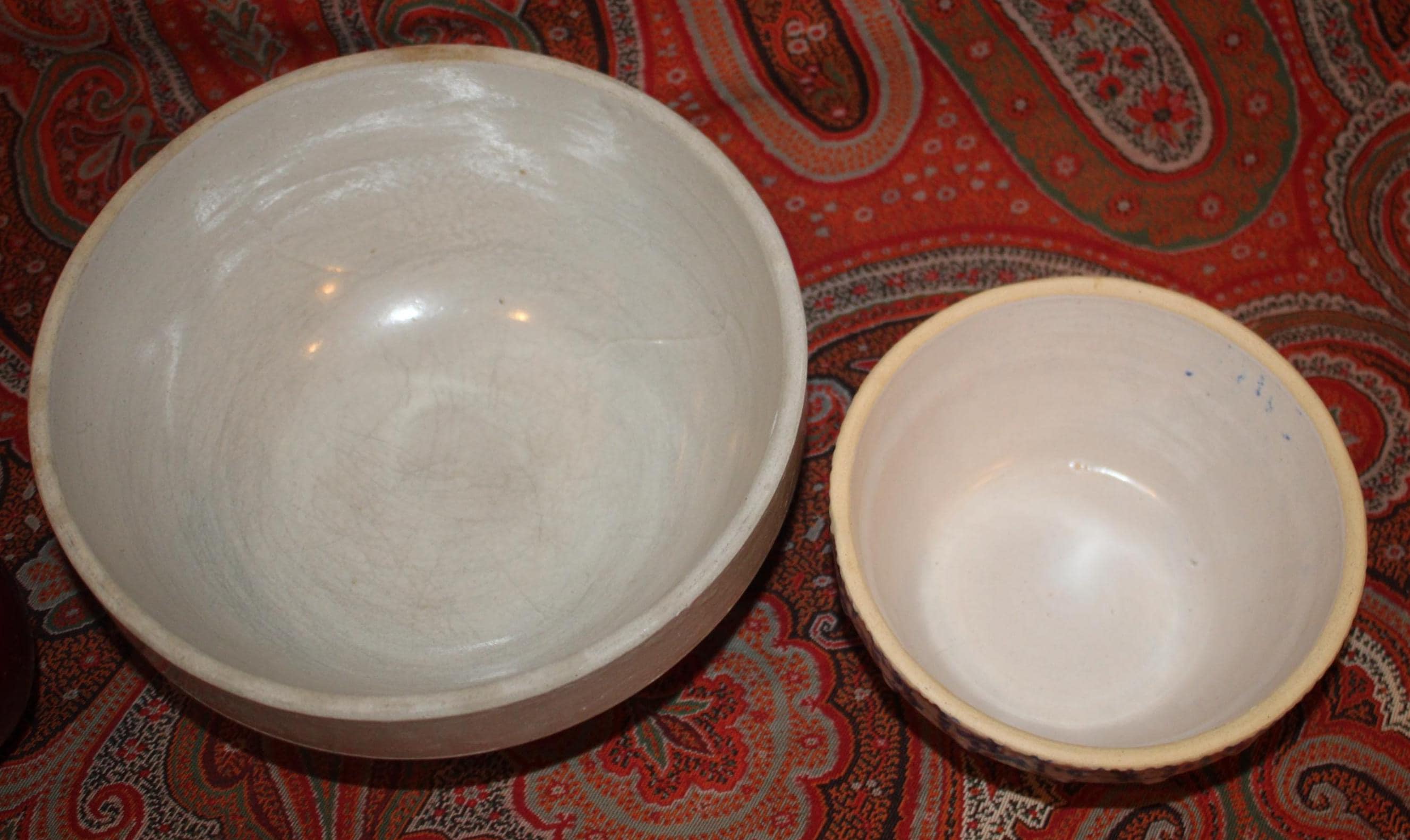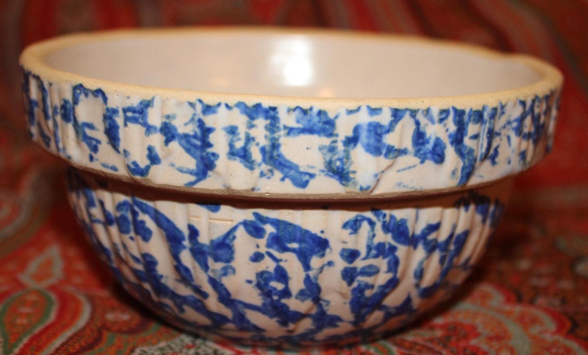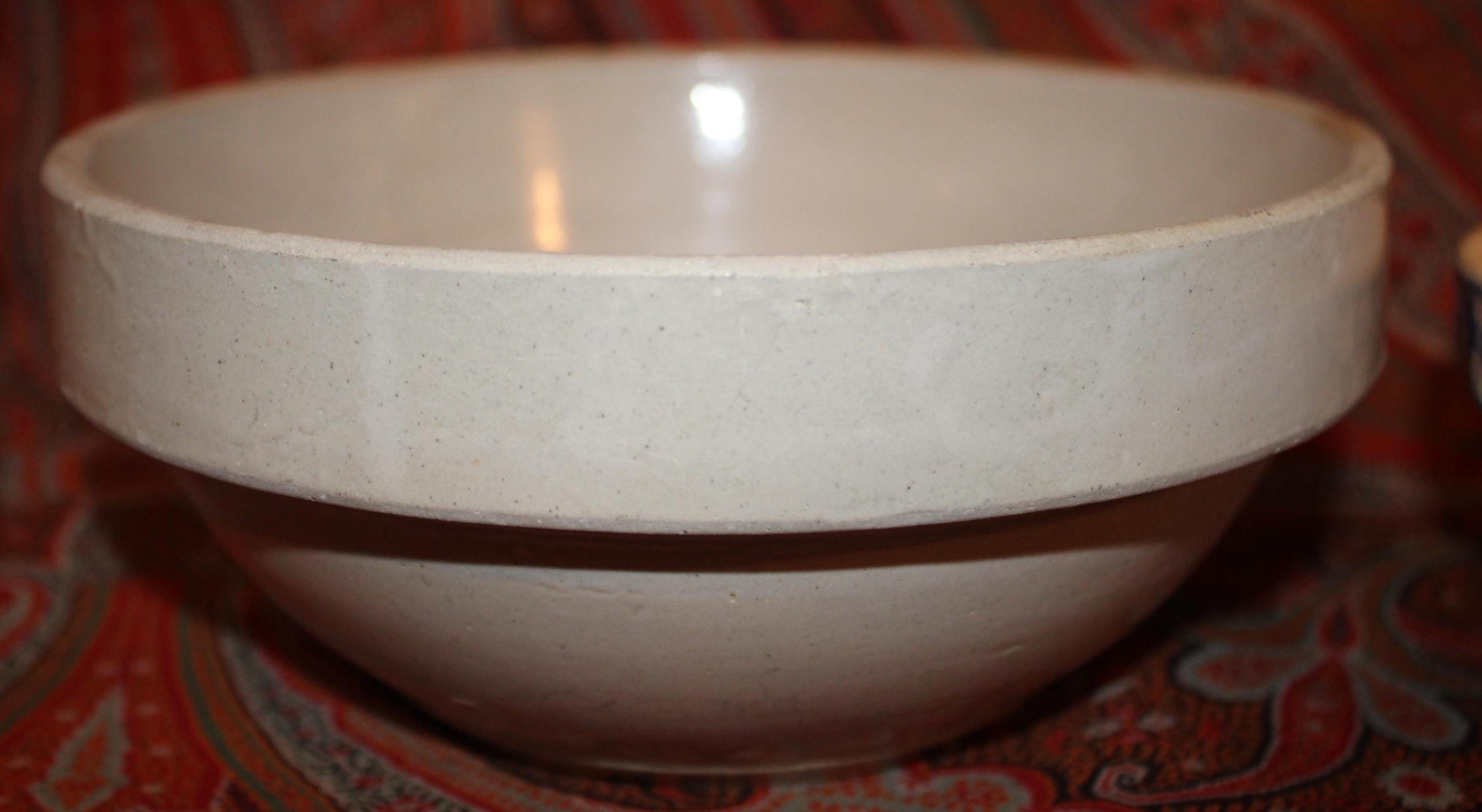 These bowls display so nicely together- we decided to sell them as a set! The larger stoneware crock mixing bowl measures 7.25" in diameter x 3" tall and holds 4 cups. The spongeware mixing bowl with gorgeous cobalt blue spatterware measures 5.25" in diameter x 2.75" tall and holds 1 cup. Both bowls are in great condition with no chips or cracks. These bowls would look great in a cottage or farmhouse kitchen- They also would look phenomenal in an industrial home! Please message us if you have any questions- Thanks for looking!