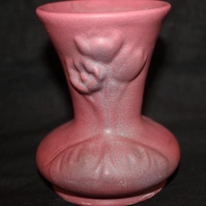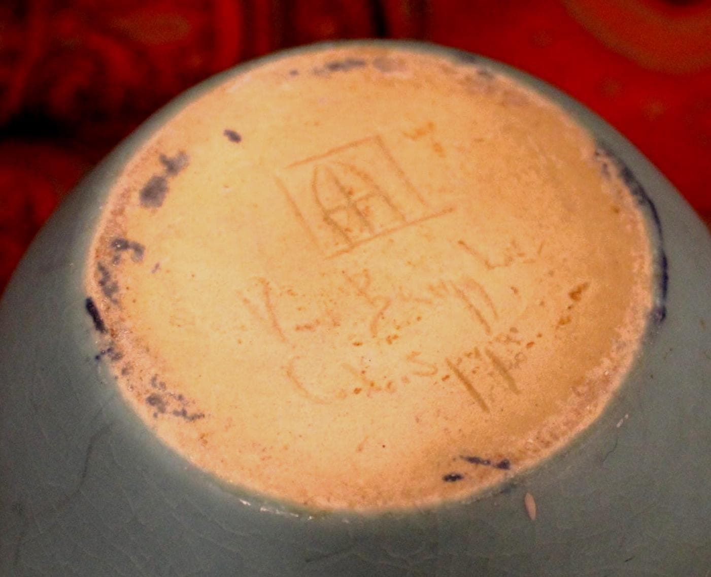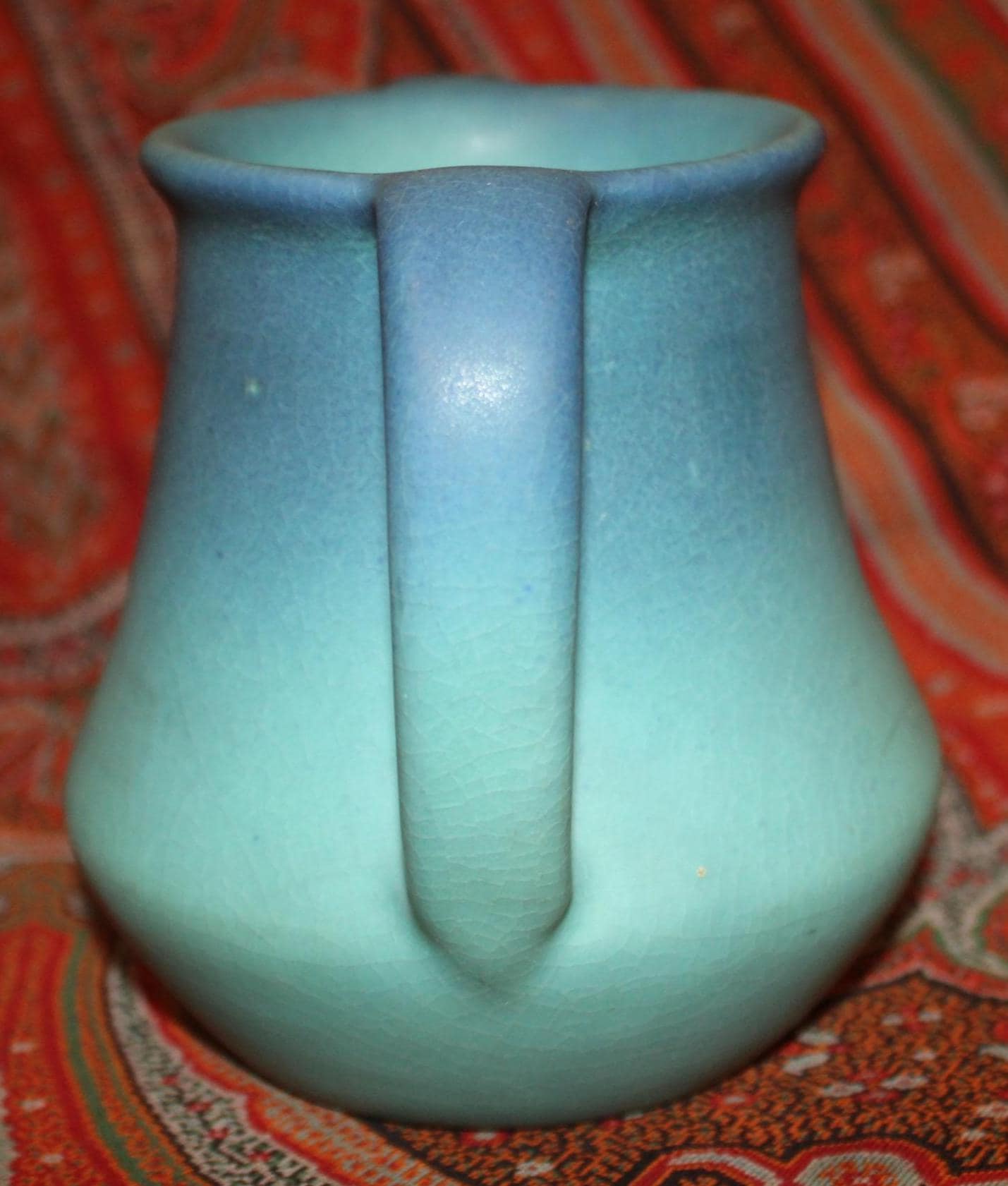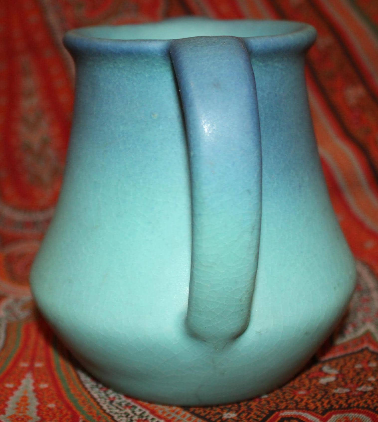 This Gorgeous Art Nouveau Ming Blue Van Briggle Vase would be a wonderful addition to your collection of Art Pottery! It stands approximately 4.75" tall and is 5.5" at its widest point (handle to handle). It is marked with the conjoined double A signature logo as well as "Van Briggle Colo. Spgs." There are no chips or cracks- a beautiful piece! Please message us if you have any questions- Thanks for looking!
