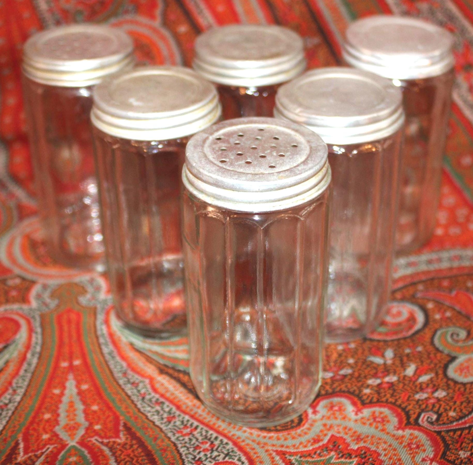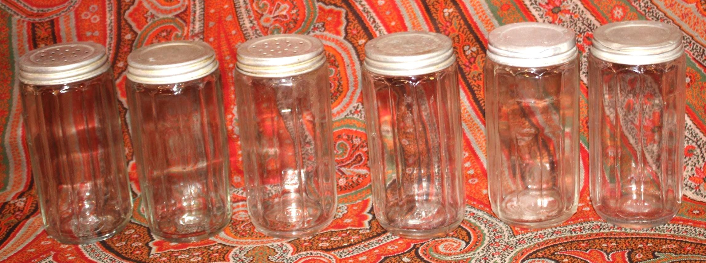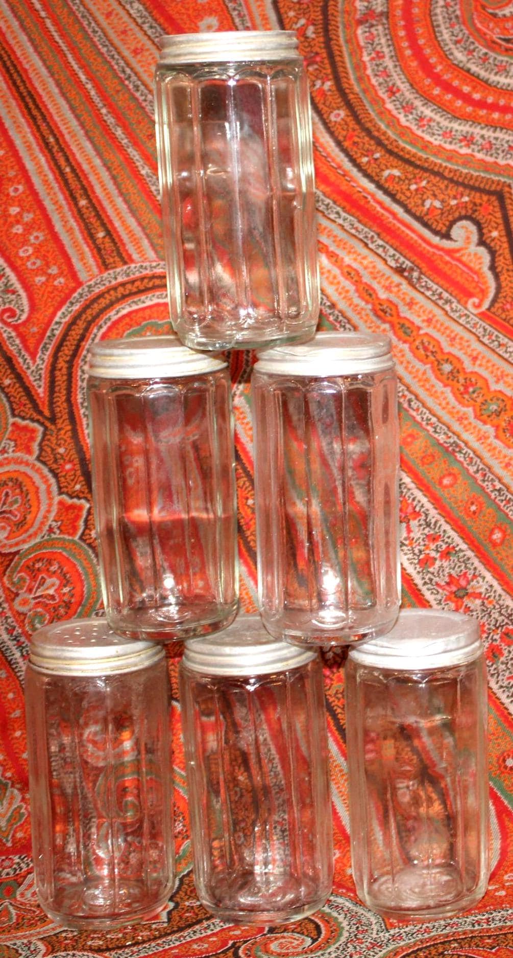 This set of 6 Antique Round 1930's Dodecagon (12-sided) Hoosier spice jars would be fantastic in your retro or farm house kitchen! Each 12-sided spice jar is 4.5" tall x 2.25" wide. There is some nicking to the top of the rims which is hidden when the lids are screwed on; the aluminum lids have some wear and scratching which can be seen in our photos (There are 4 solid tops and 2 shaker tops). Please message us if you have any questions- Thanks for looking!