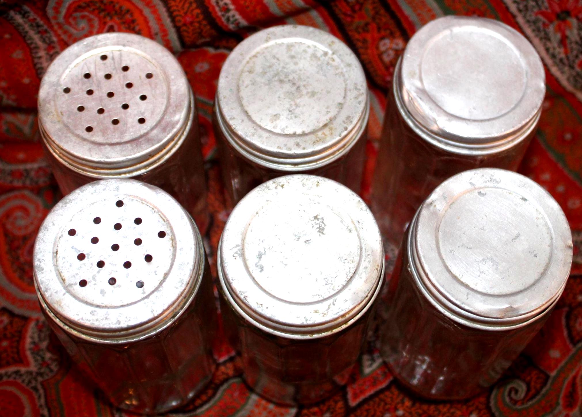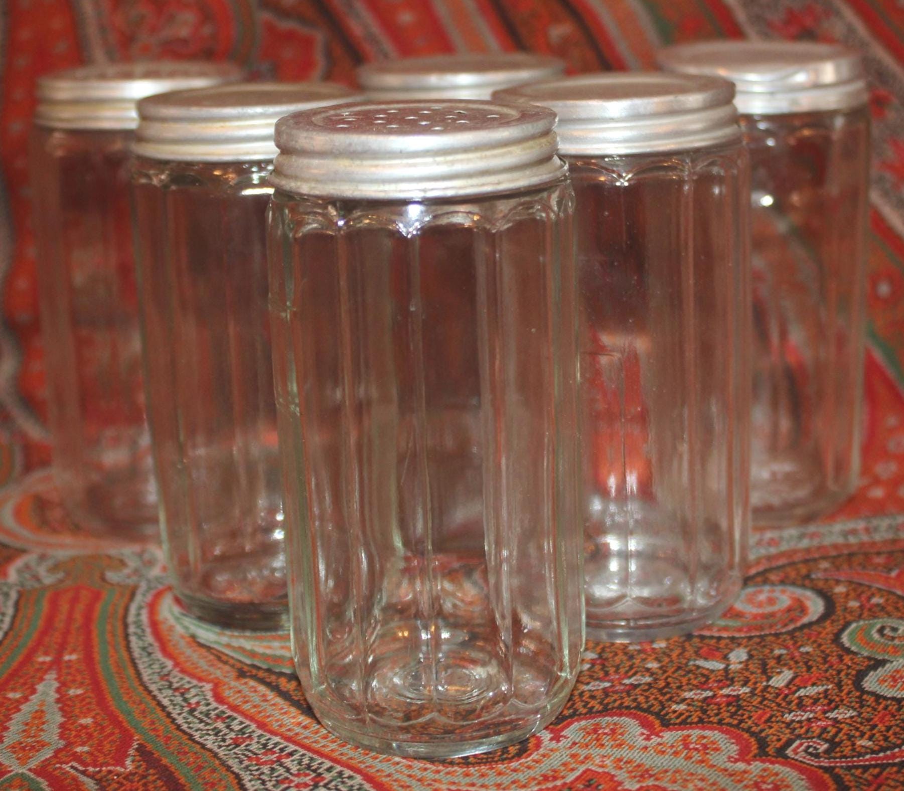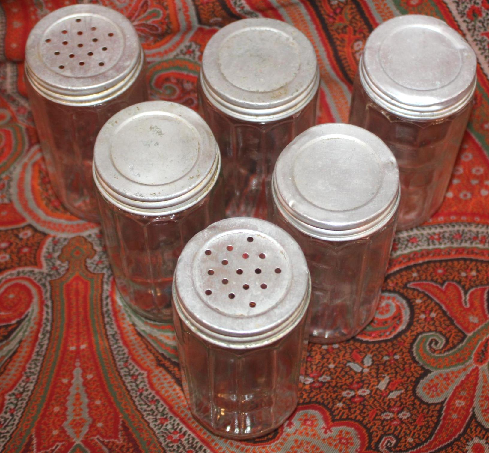 This set of 6 Antique Round 1930's Dodecagon (12-sided) Hoosier spice jars would be fantastic in your retro or farm house kitchen! Each 12-sided spice jar is 4.5" tall x 2.25" wide. There is some nicking to the top of the rims which is hidden when the lids are screwed on; the aluminum lids have some wear and scratching which can be seen in our photos (There are 4 solid tops and 2 shaker tops). Please message us if you have any questions- Thanks for looking!