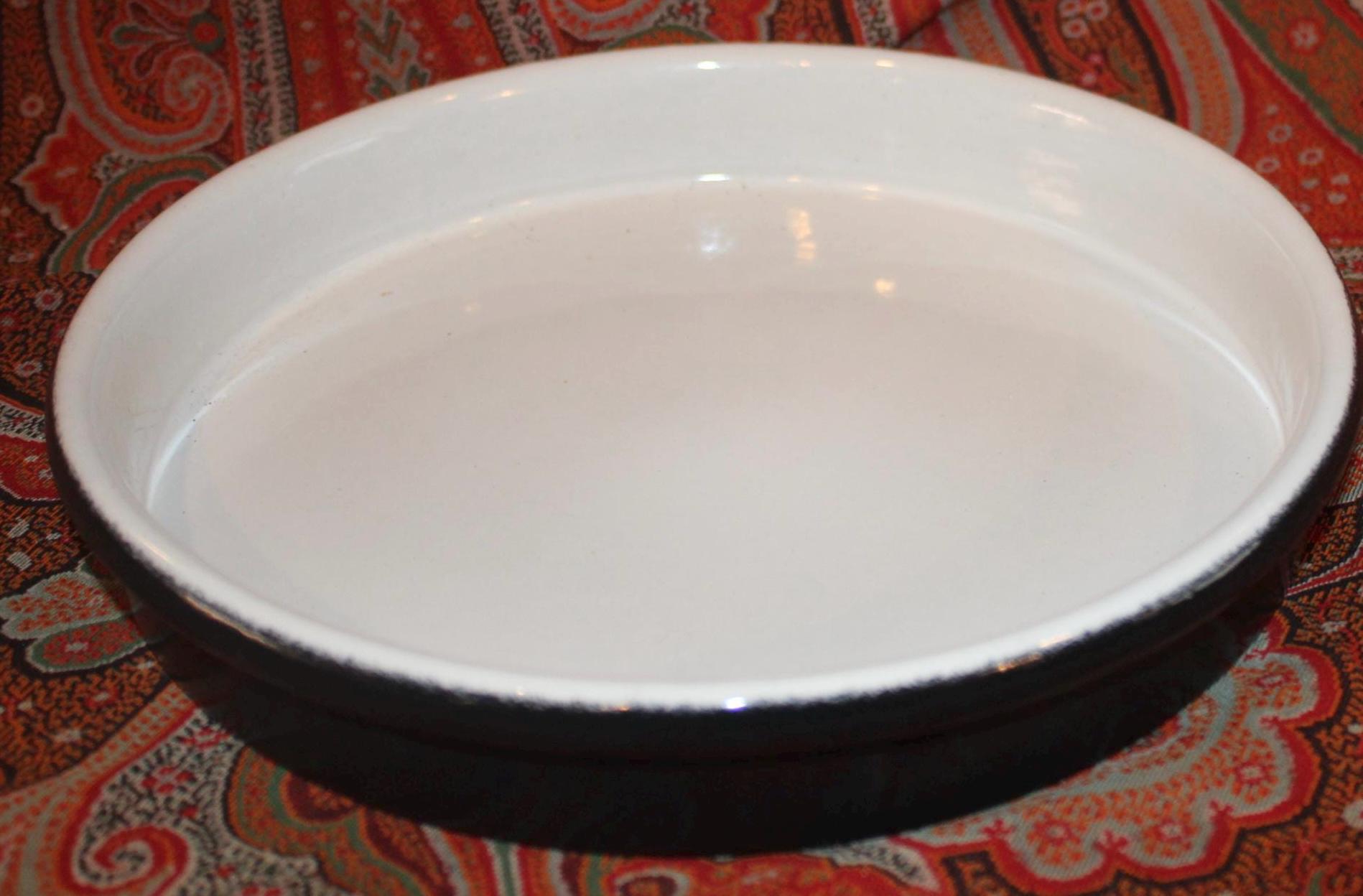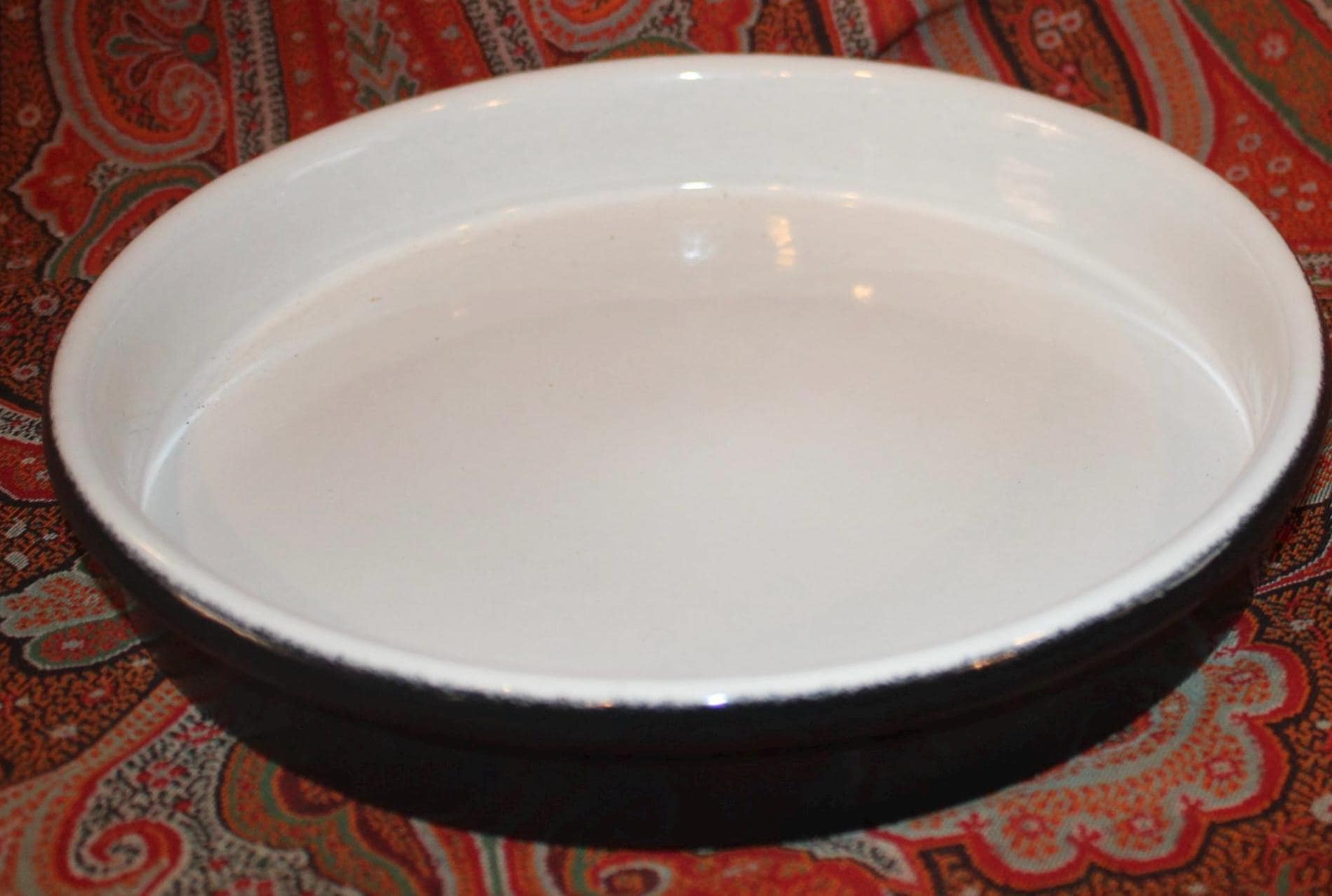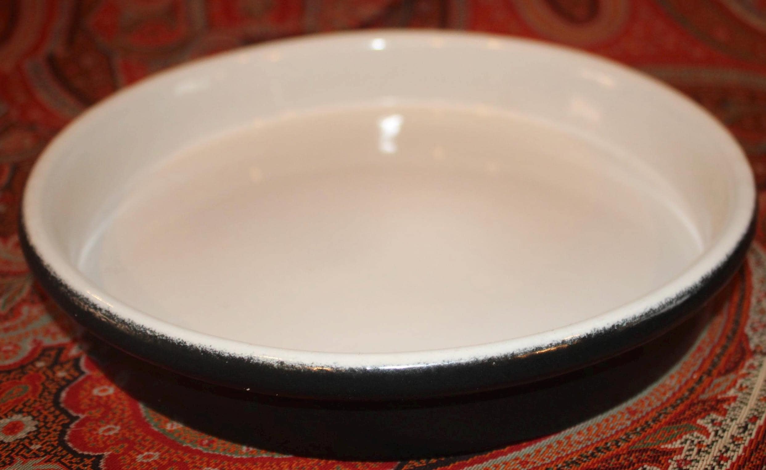 This Bennington Potters Black Stoneware Baking Dish is wonderful to have when you want to bake that perfect quiche! It is 9.5” in diameter x 1.5” tall with no chips or cracks. It has a wonderful black matte exterior with a white interior. Please message us if you have any questions- Thanks for looking!