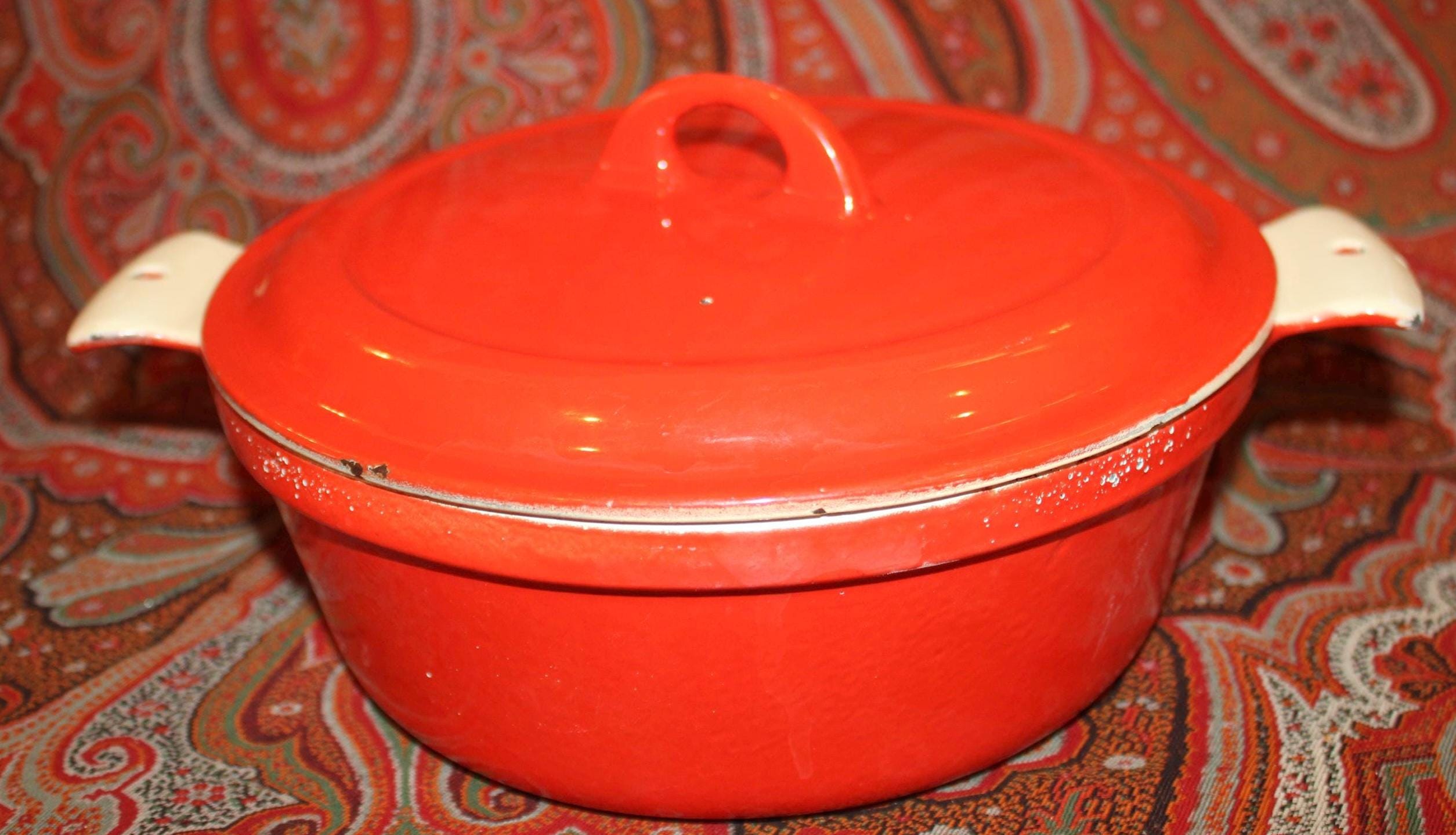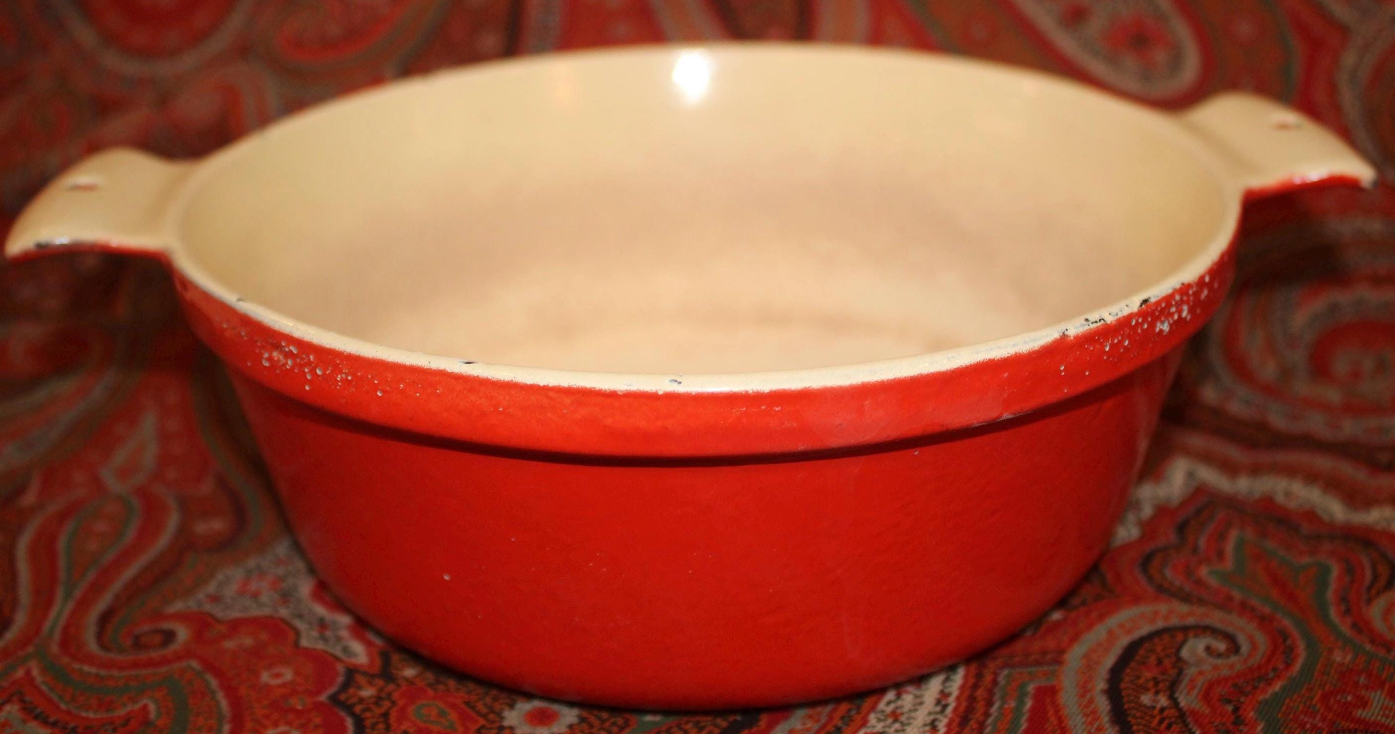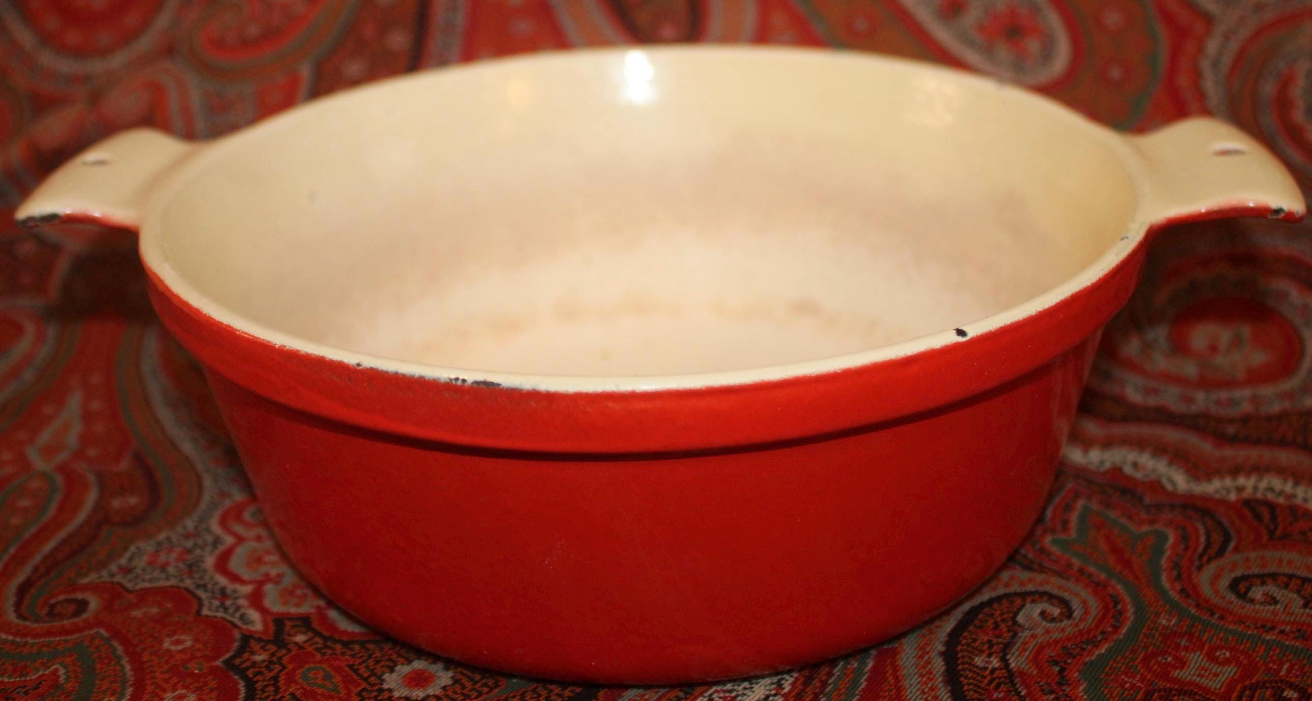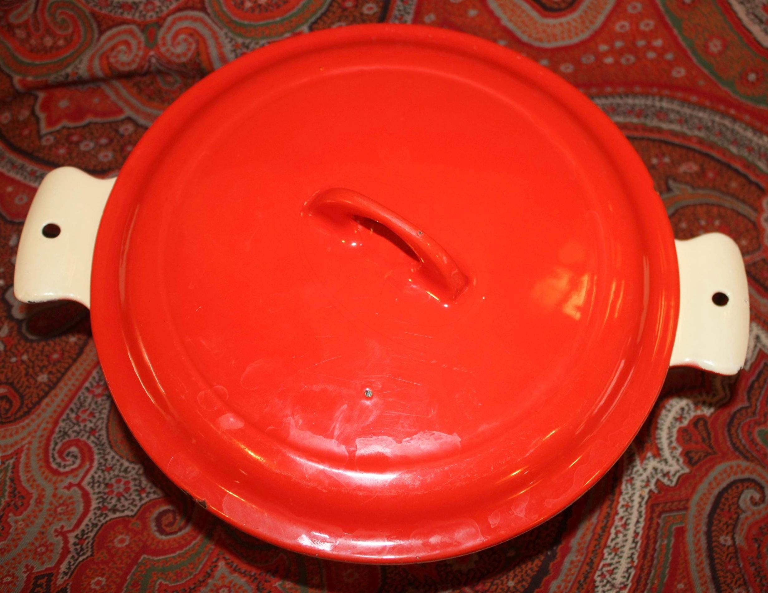 This nice Vintage Red Enamel Griswold Casserole is available to you! Perfect to have on hand in the kitchen for a fabulous soup, stew, or pot roast- It holds over 1 quart and measures 8” in diameter x 5.25" tall with the lid (3" without the lid). It is in great condition and lies flat on the stovetop but it has been used in the past (the interior white is stained) and there are a few small enamelware chips on the exterior