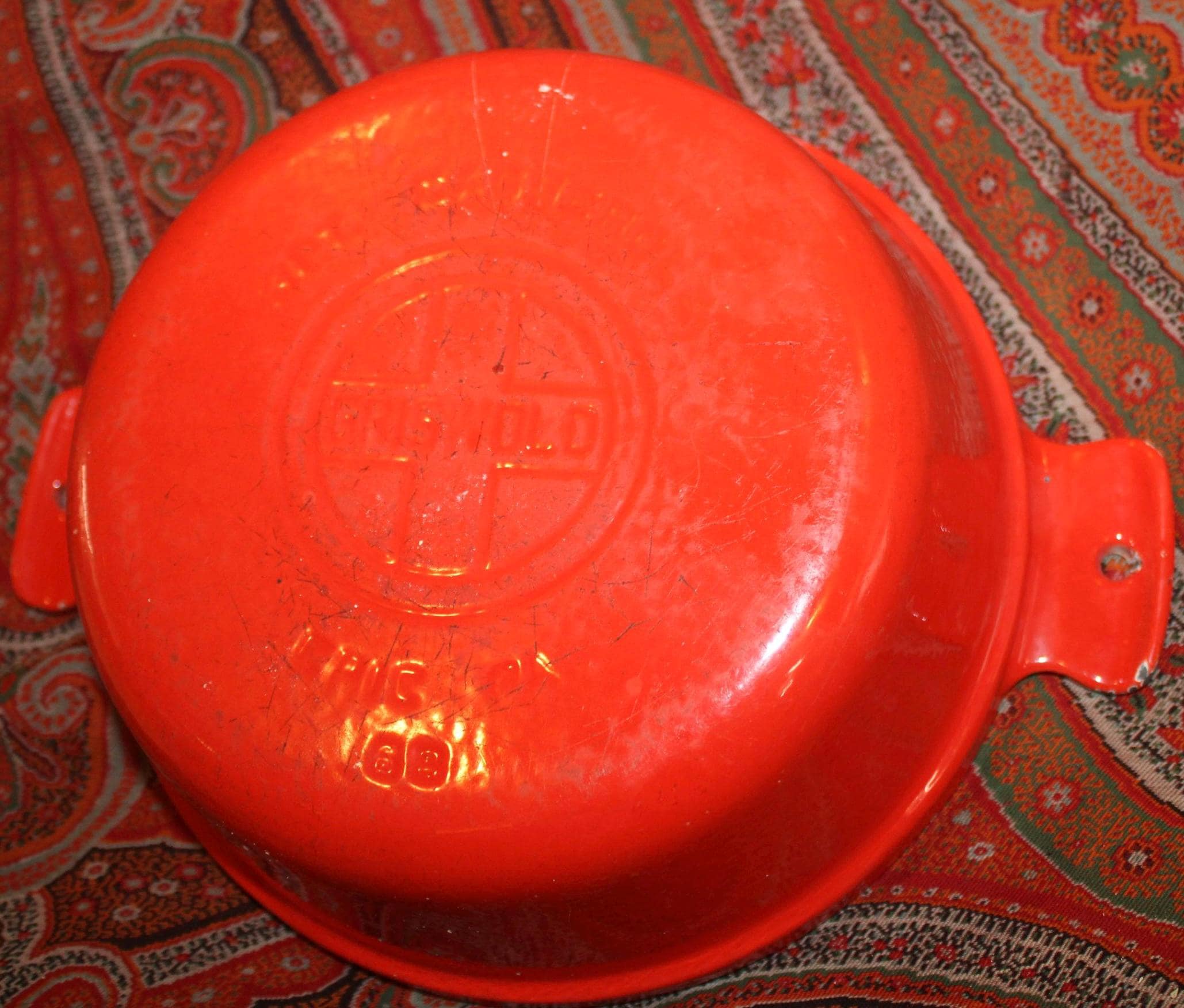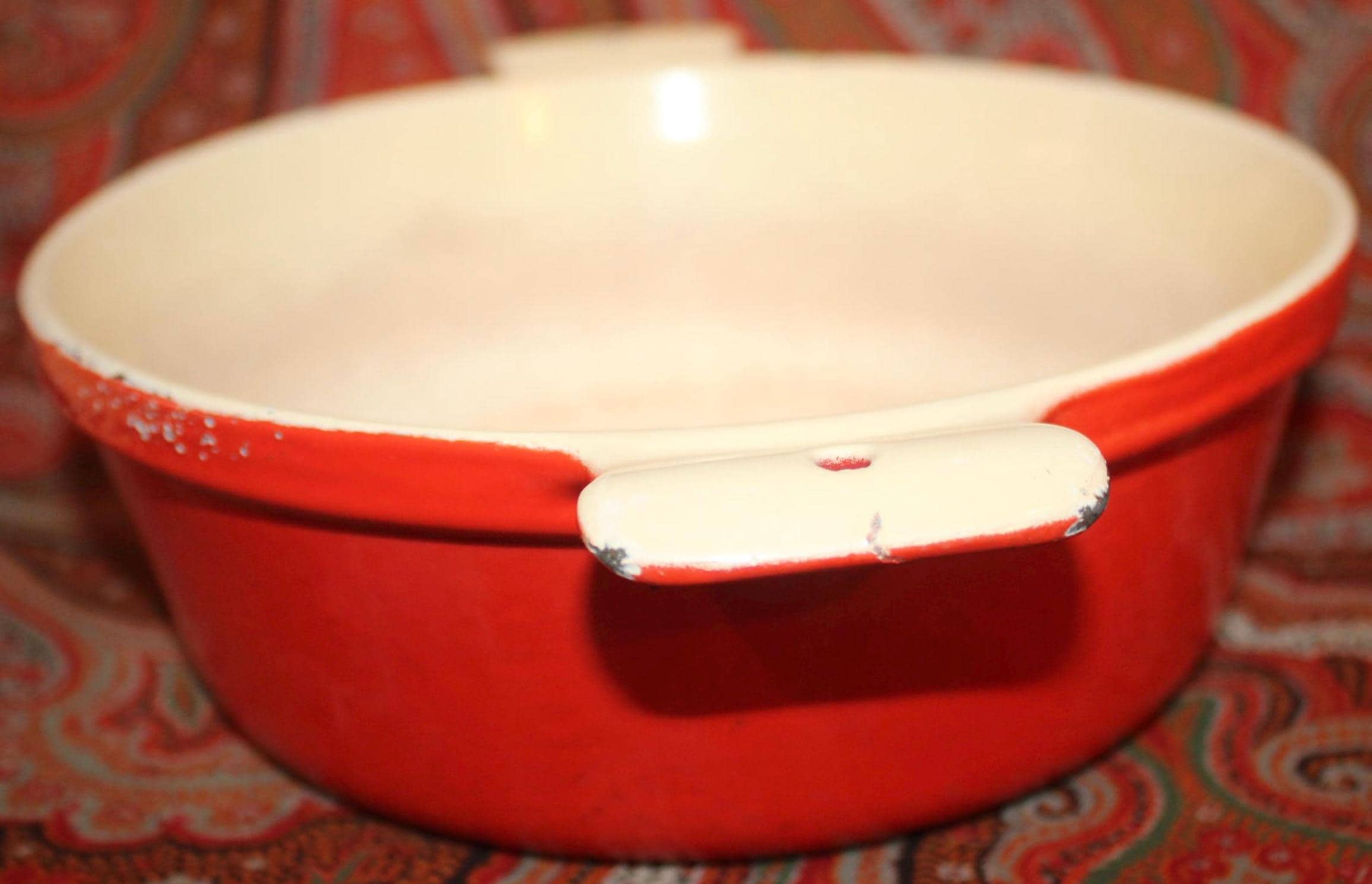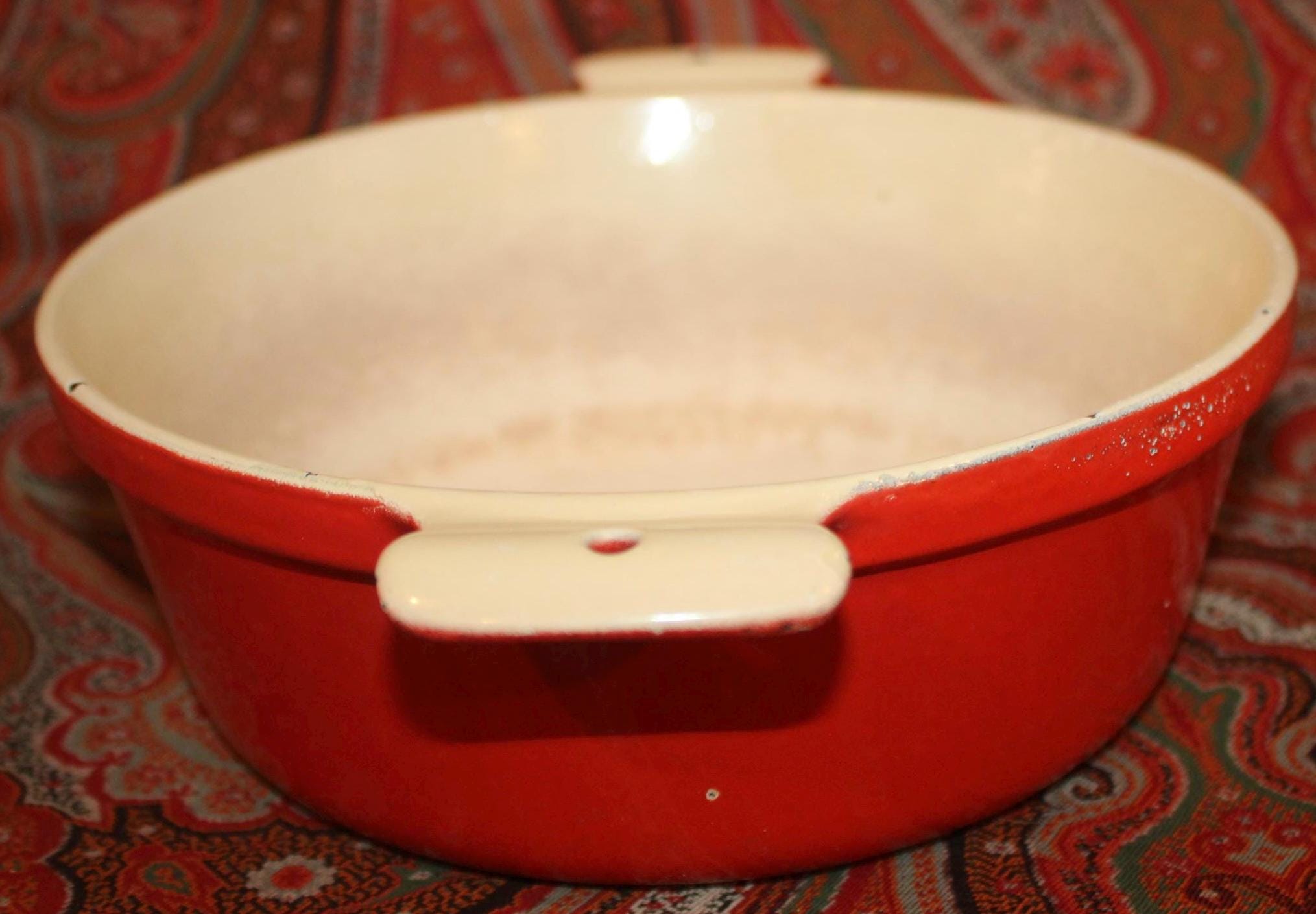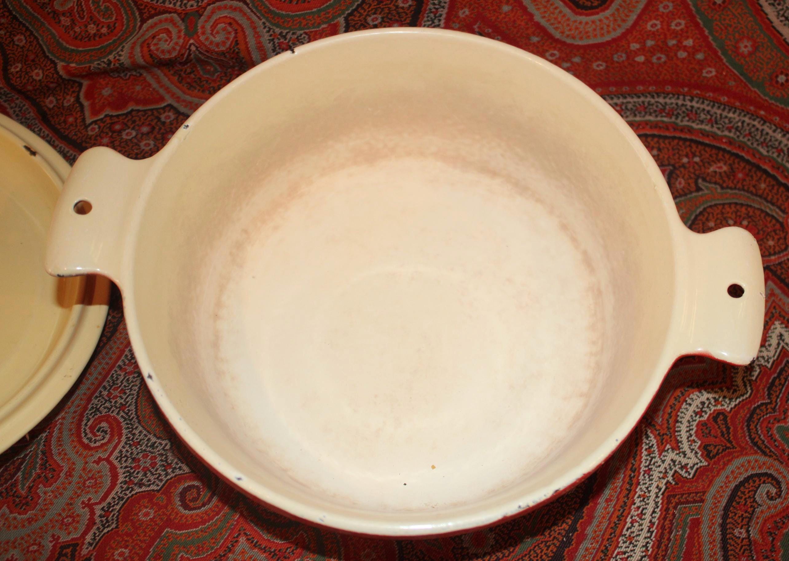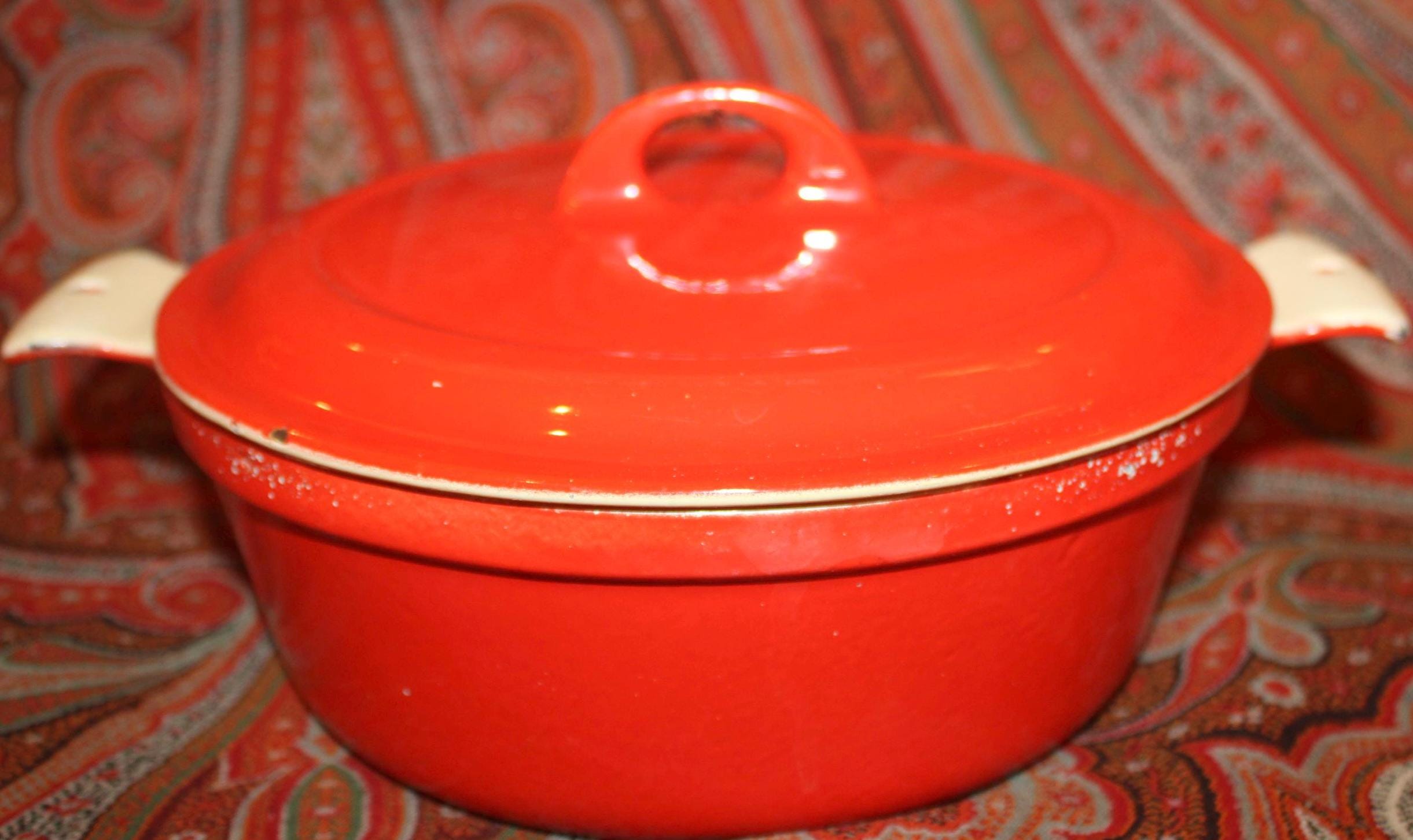 This nice Vintage Red Enamel Griswold Casserole is available to you! Perfect to have on hand in the kitchen for a fabulous soup, stew, or pot roast- It holds over 1 quart and measures 8” in diameter x 5.25" tall with the lid (3" without the lid). It is in great condition and lies flat on the stovetop but it has been used in the past (the interior white is stained) and there are a few small enamelware chips on the exterior